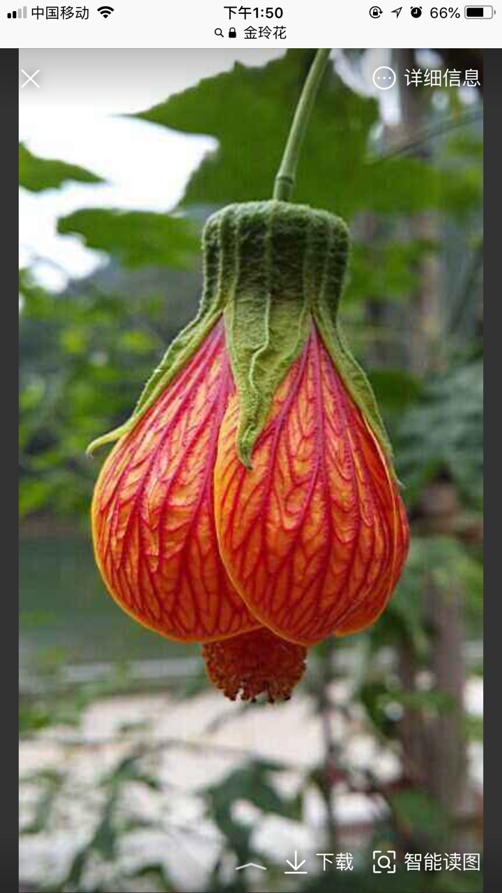 金铃花(学名:Abutilon striatum),又名灯笼花、网花苘麻、红脉商麻,属于常绿灌木,由于叶片常绿、花形独特、花期较长、易于繁殖,颇受喜爱。金铃花系丛生,茎直立,叶翠绿,质厚,卵状,亦有掌状,边缘有锯齿,花梗细长,小蕾期向上,随着蕾的膨大逐渐向下,开花特别下垂,花钟形,橙黄色,上有鲜艳的紫红色脉纹,花蕊和花柱较长,伸出花冠之外,整花如吊着的金色铃子而得名。喜温暖及阳光充足,不耐寒,稍耐阴;宜肥沃、湿润而排水良好的砂壤土。原产南美洲的巴西、乌拉圭等地,中国西南等地有栽培,供园林观赏用。