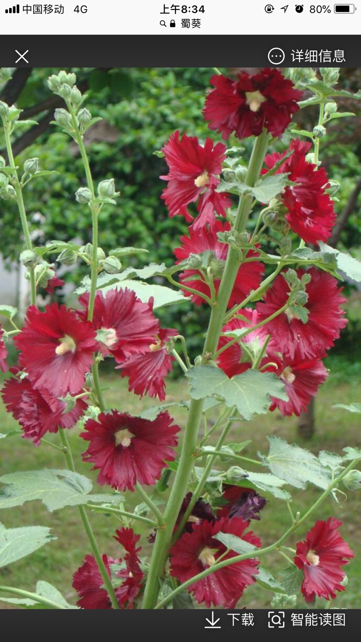 蜀葵(学名:Althaea rosea (Linn.) Cavan.),别称一丈红、大蜀季、戎葵。二年生直立草本,高达2米,茎枝密被刺毛。[1]花呈总状花序顶生单瓣或重瓣,有紫、粉、红、白等色;花期6月至8月,蒴果,种子扁圆,肾脏形。喜阳光充足,耐半阴,但忌涝。原产中国四川,在中国分布很广,华东、华中、华北均有。由于它原产于中国四川,故名曰“蜀葵”。又因其可达丈许,花多为红色,故名“一丈红”。于6月间麦子成熟时开花,而得名“大麦熟”。