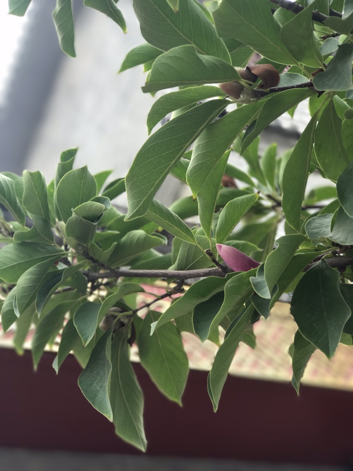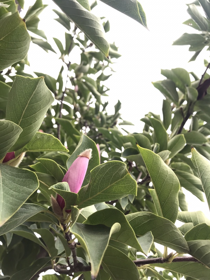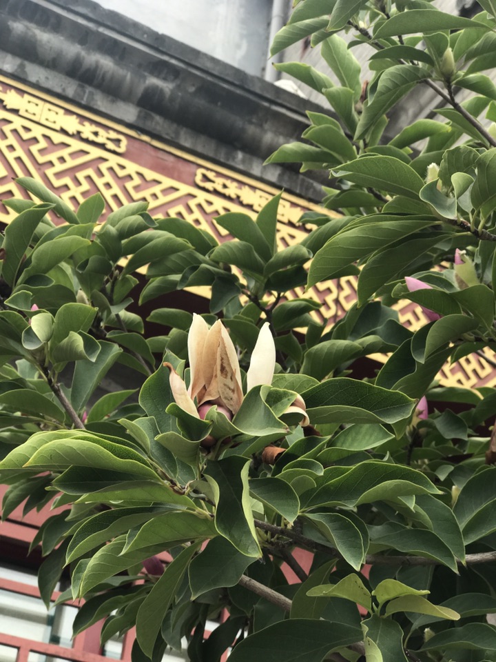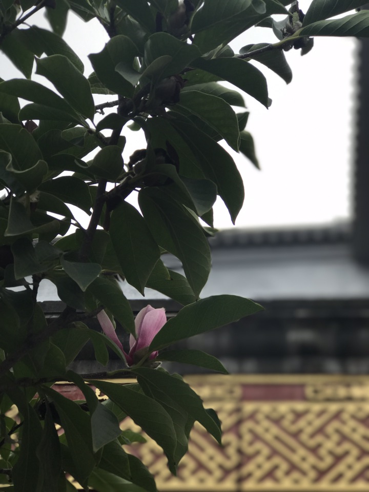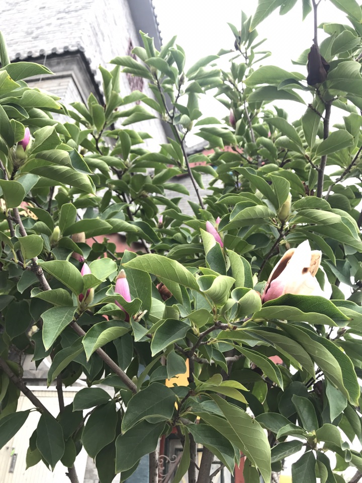 这是前门大栅栏边上的一棵玉兰,也是零星的挂着几朵紫色的花,花开的徐徐缓缓不紧不慢,就这样有一搭没一搭的,竟开了好几个星期了。还是由于太高,拍出来的效果特别不好,可至少不是一片黑,那就凑合着看吧。毕竟这原本是属于春日的风景……