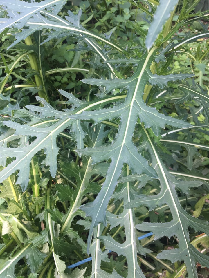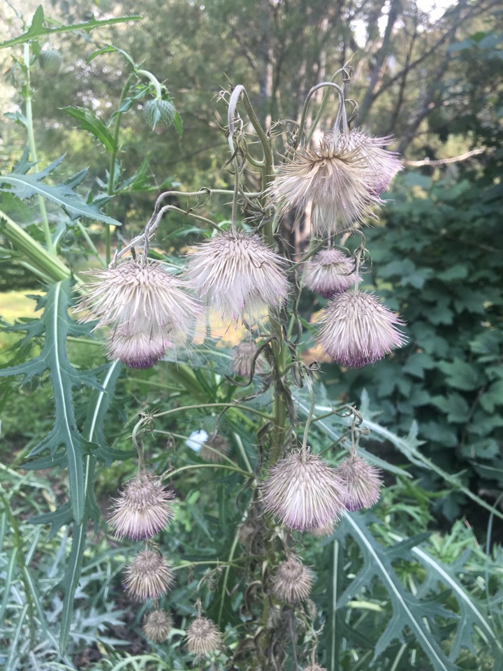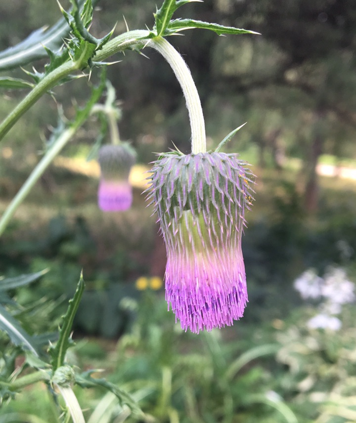 没想到一直疯长叶子的烟管蓟居然开花了!其花像倒着的麻花头,倒也符合蓟的身份,不过我觉得更像写字的毛笔头。远远地望去,还像挑着的小灯笼。像烟管吗?不好说。