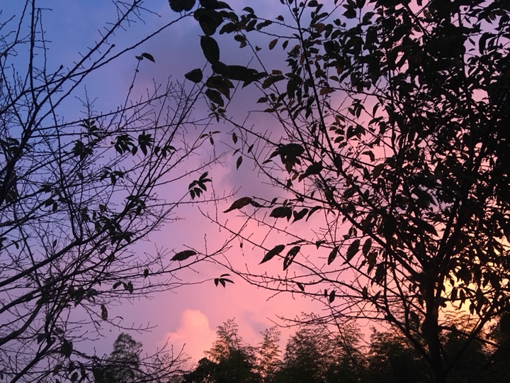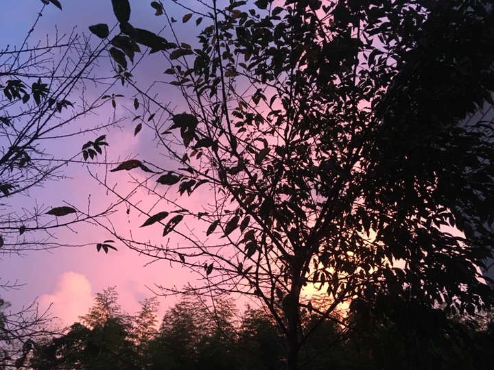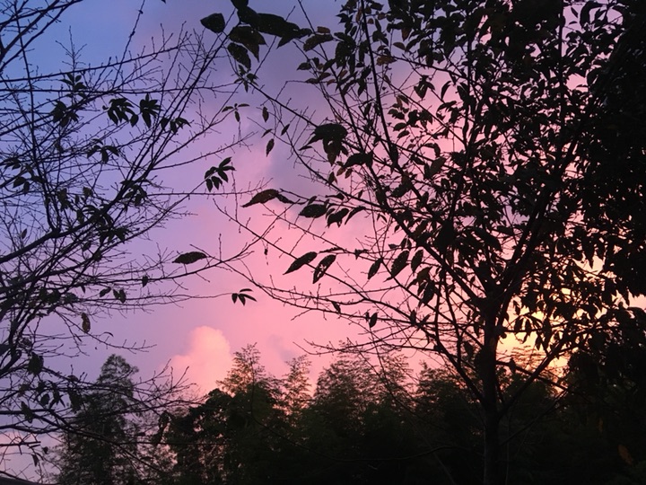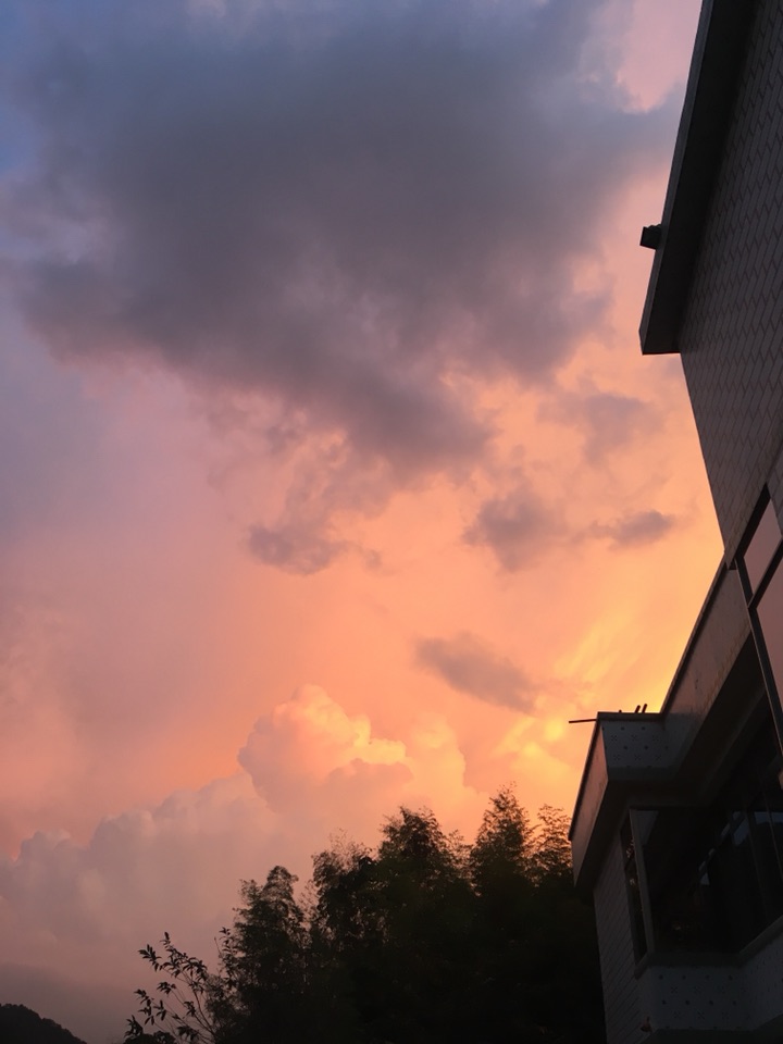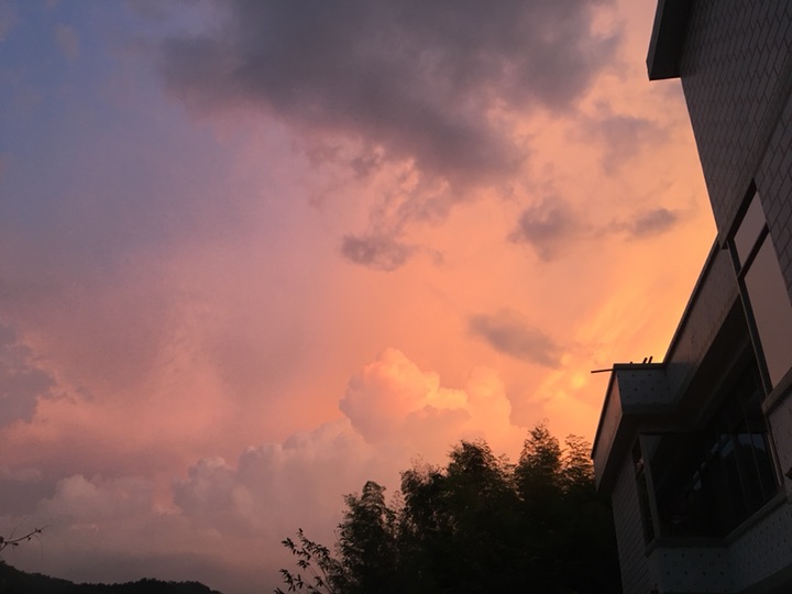 山雨欲来霞满天,轰雷挂樱梢,山头电闪,风飘摇,回屋。