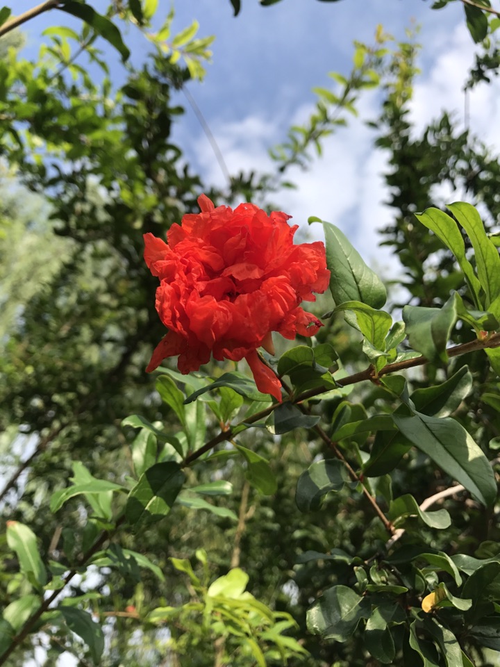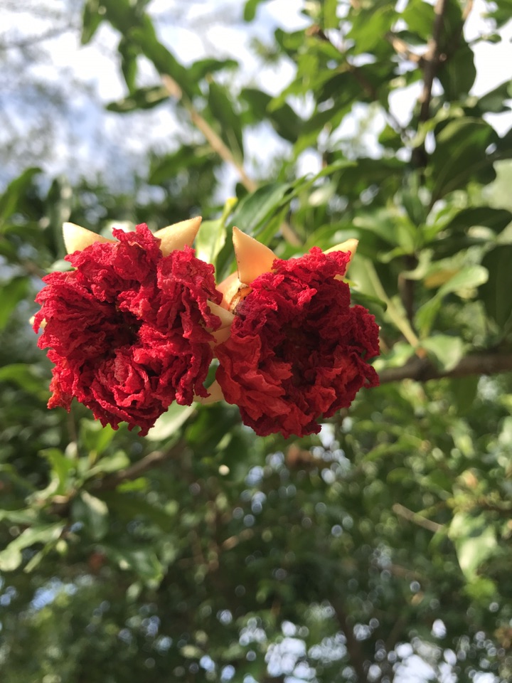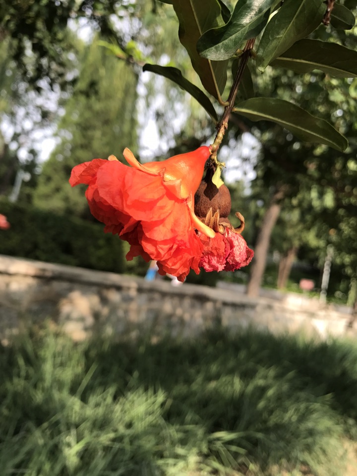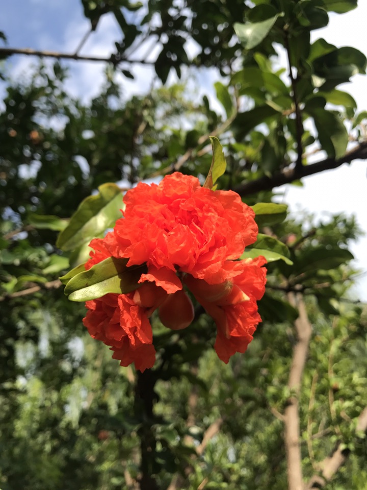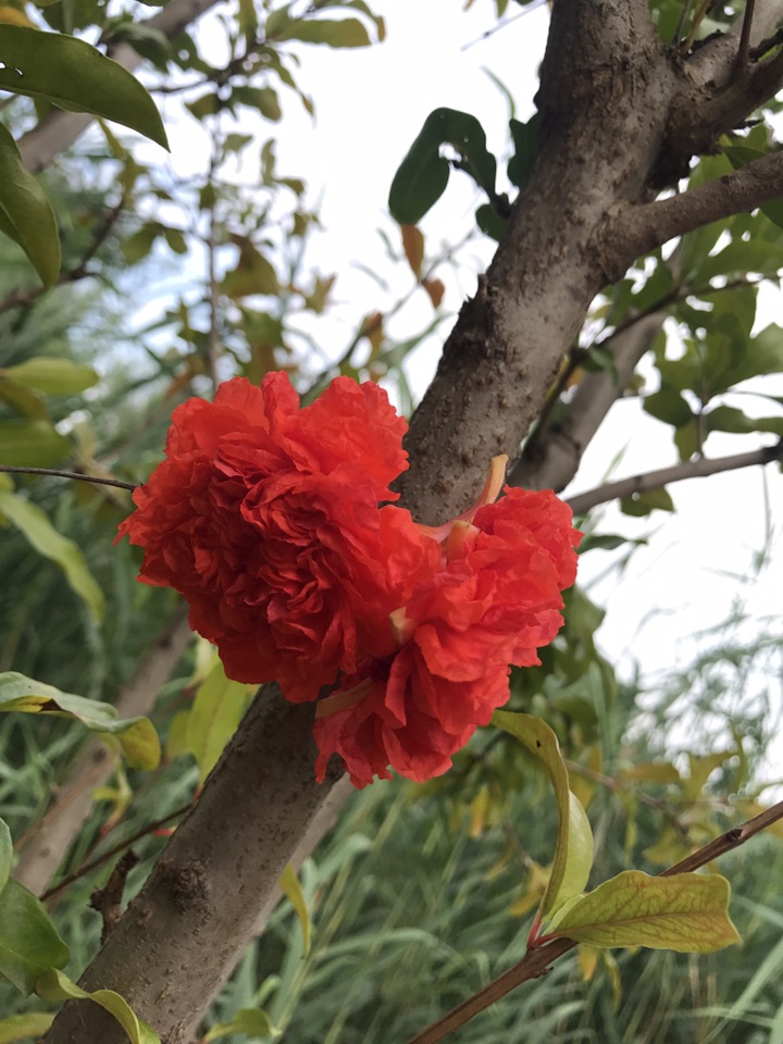 别看石榴果子都快熟了,在一一棵棵的石榴树上分明还挂在如火般灿烂的石榴花。一朵一朵颜色艳丽的如同新娘的胸花般喜庆可人