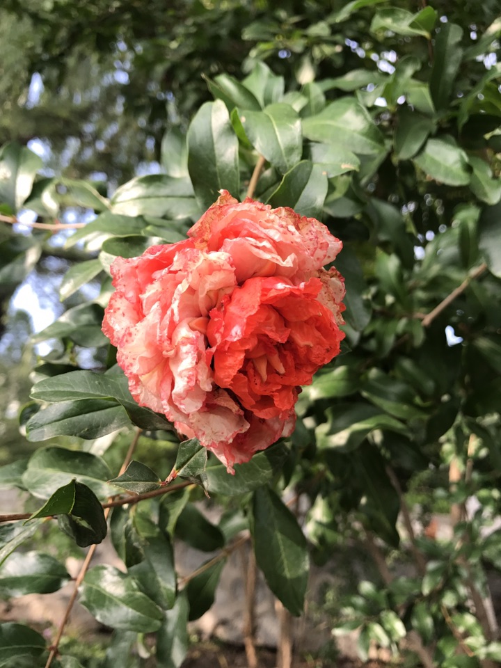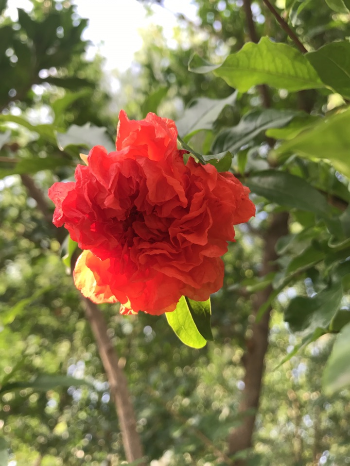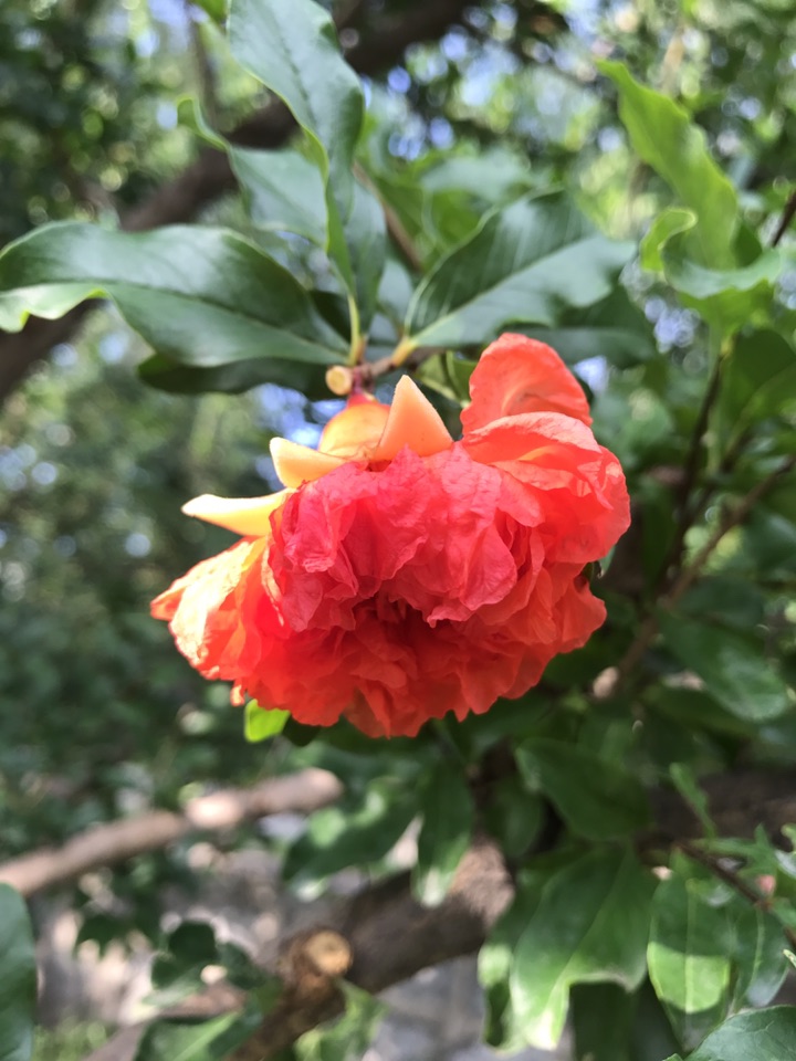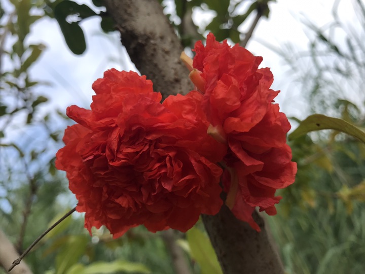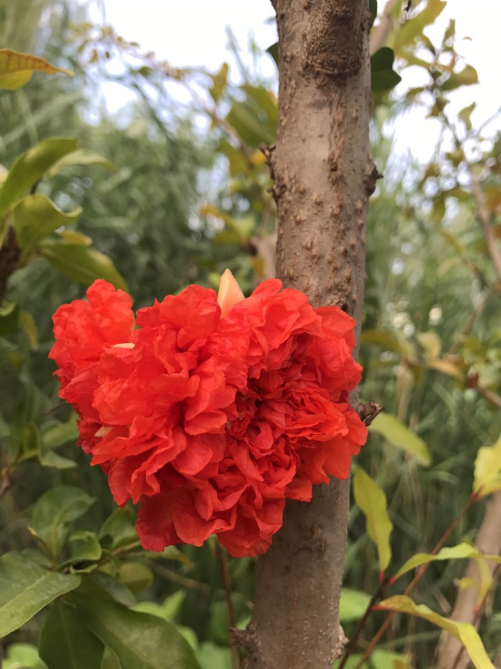 别看石榴果子都快熟了,在一一棵棵的石榴树上分明还挂在如火般灿烂的石榴花。一朵一朵颜色艳丽的如同新娘的胸花般喜庆可人