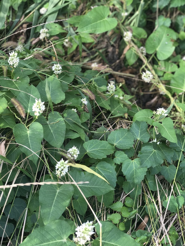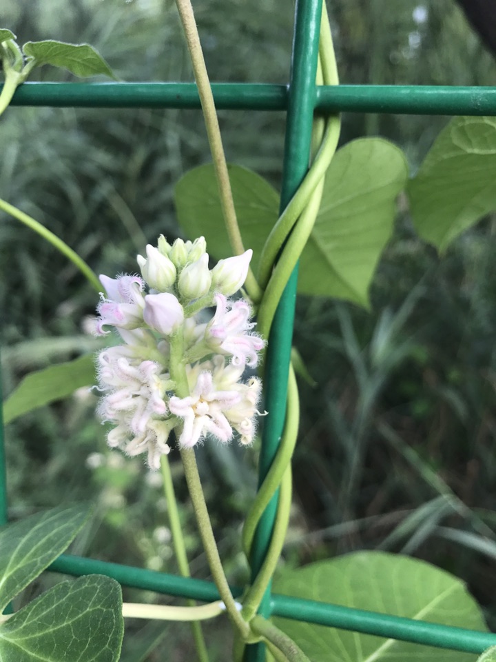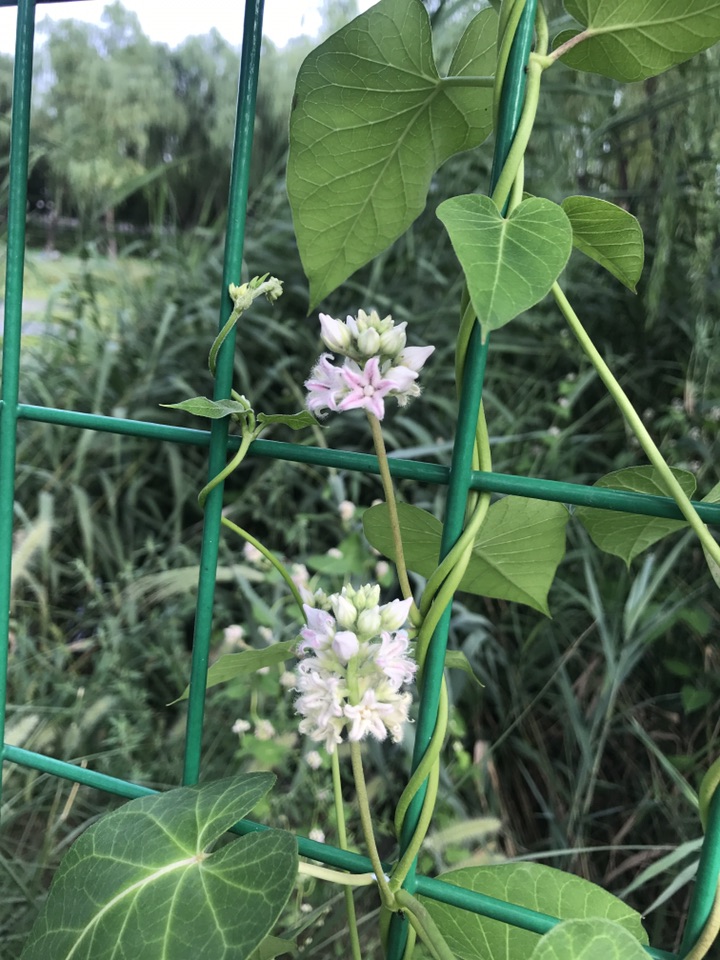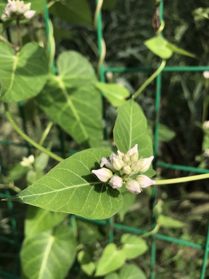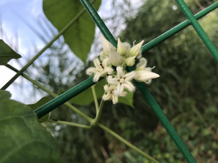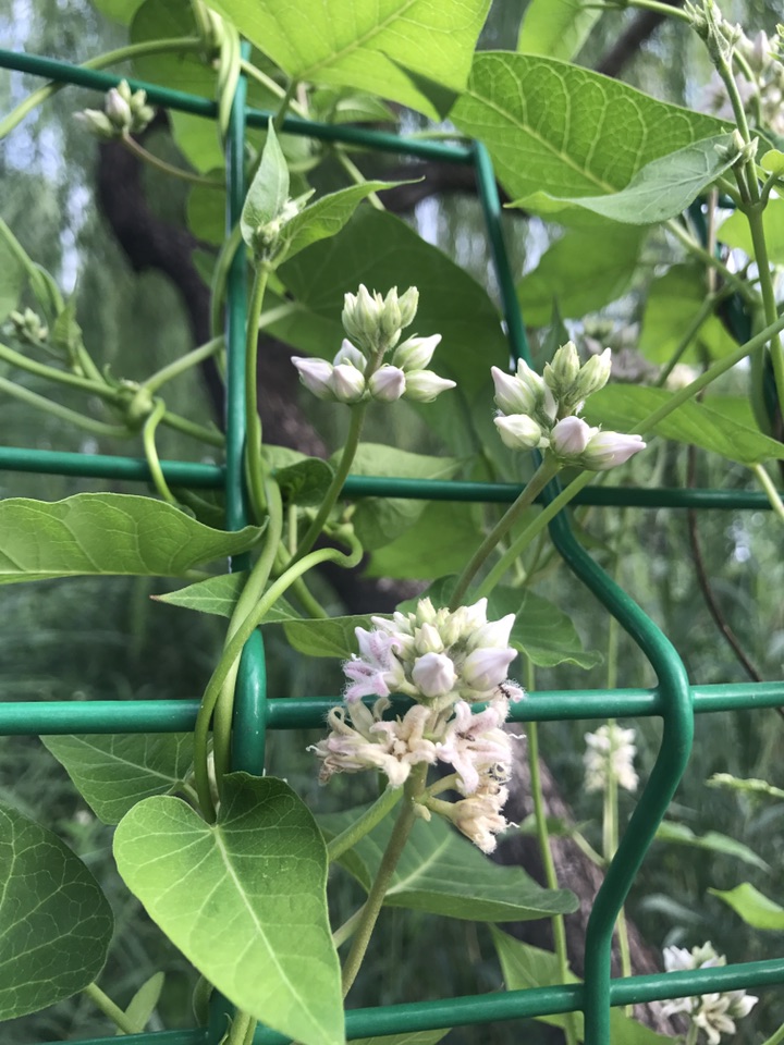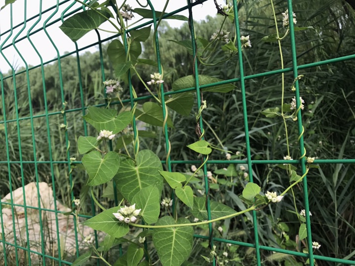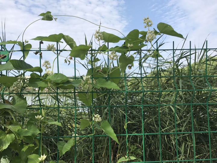 萝藦的藤缠绕能力很强,大概一个星期前这绿铁丝网栅栏还没能看到它的身影,如今虽说没把绿色的铁丝网淹没掉却早已缠绕上了它的每一格,白色的小花团团簇簇的开着,探着它毛茸茸的脑袋,像是要借着绿栅栏的肩膀看向更远的天空