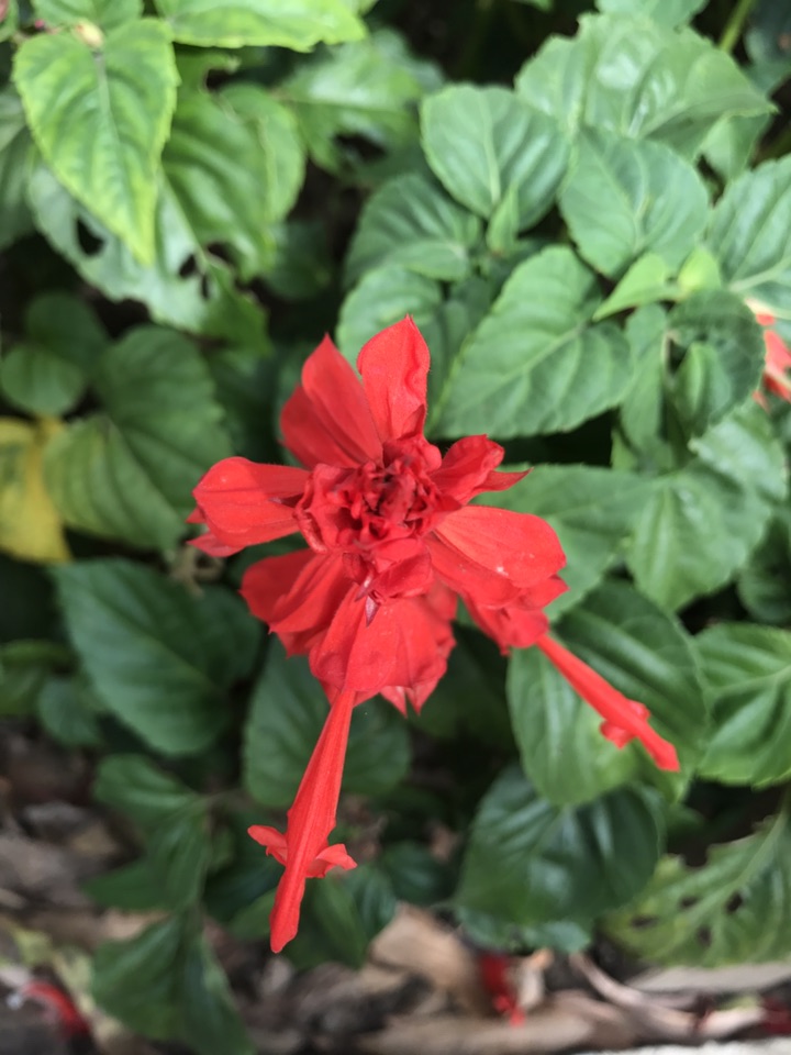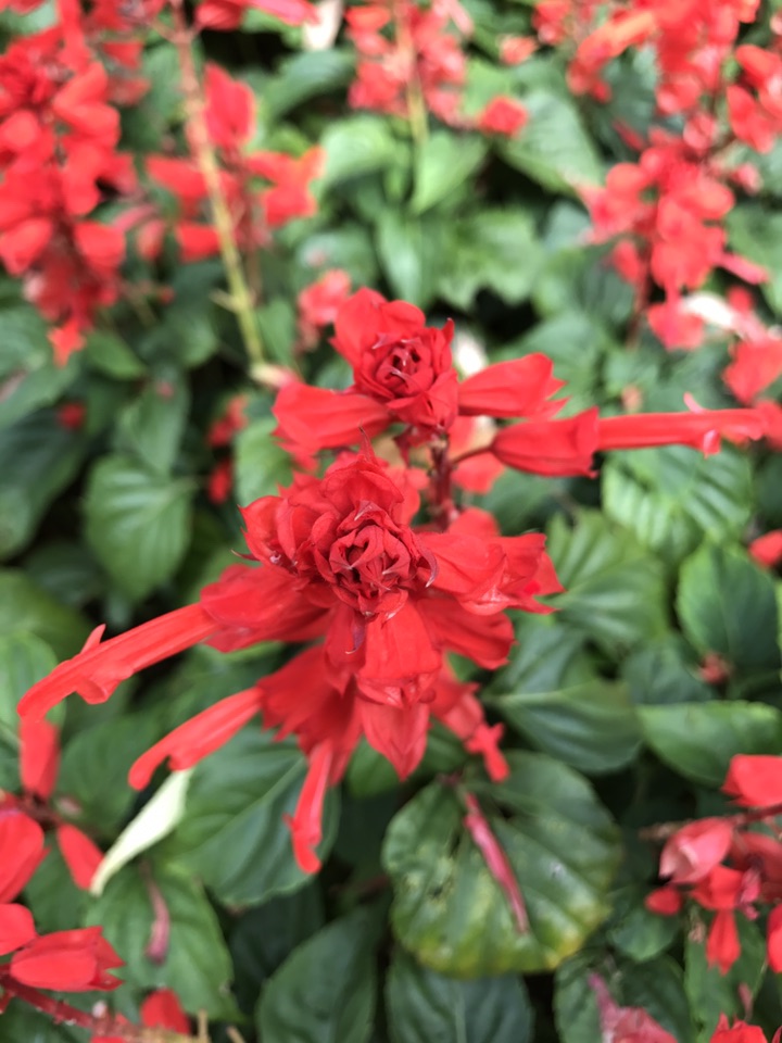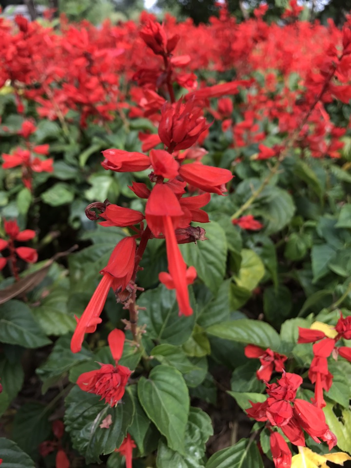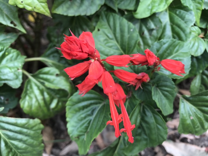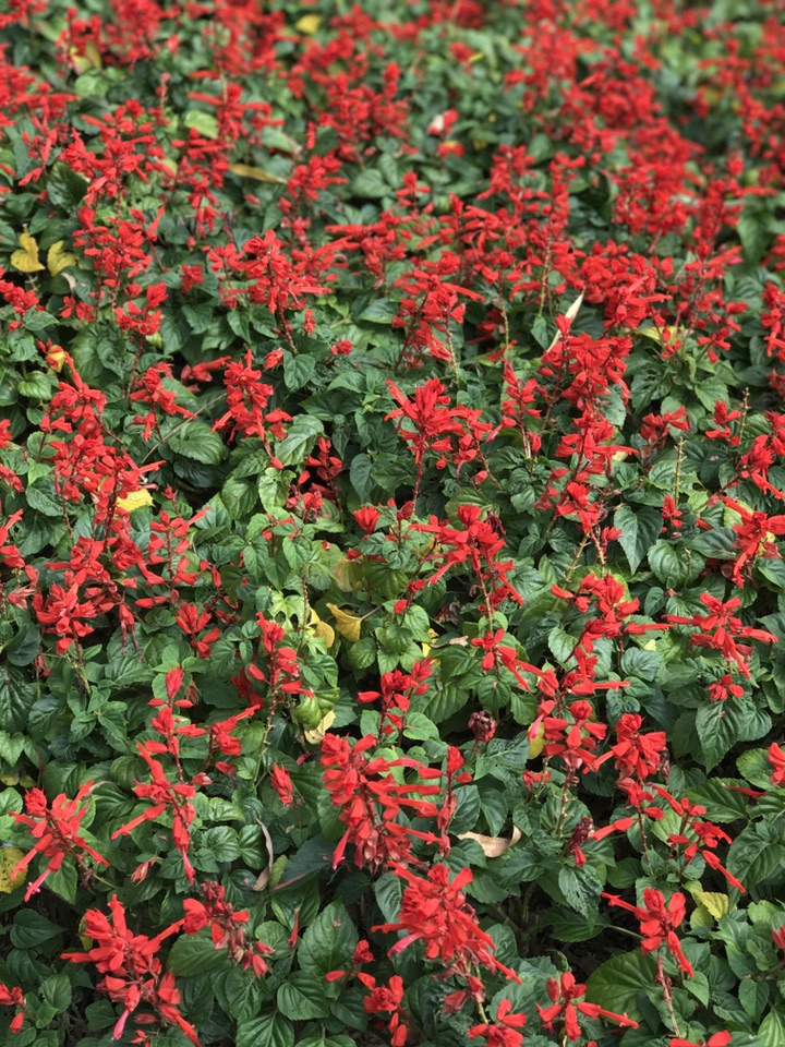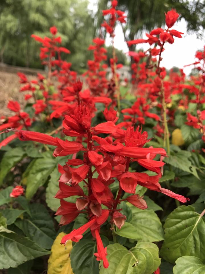 一串红开花时是一片浓密的艳红,而且它的花期长,从七月到十一月,一直都是红彤彤一串,而且花序修长,成片种植,非常得喜庆壮观抢眼,花的特点就是有两根蜗牛触角一样的东西伸出花冠,花冠又远远的伸出花萼。名为一串红其实不止有红色,从白到紫均有,但是多见的只有红色。一串红有鲜红色的花冠,冠筒直伸,听说在花冠中藏着甜甜的花蜜,是很多人小时候的甜蜜回忆,这样的甜蜜回忆你也有吗?
