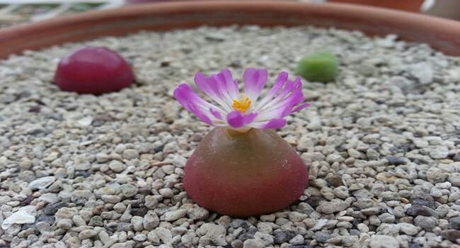 表皮亮绿色,半透明状,夏季的休眠期,光照充足的环境中,表皮呈红色。花大型,淡紫红色,中心部位呈白色,春季或秋季开放。花通常在天气晴朗的白天开放,夜晚闭合。