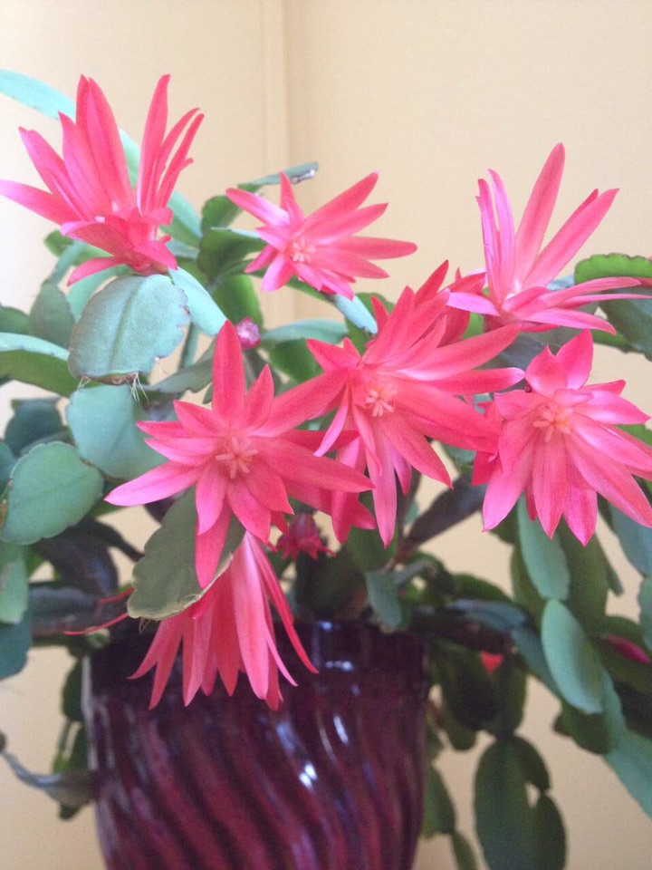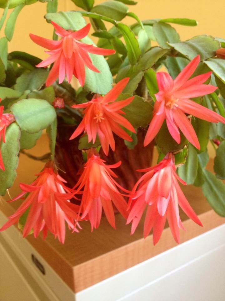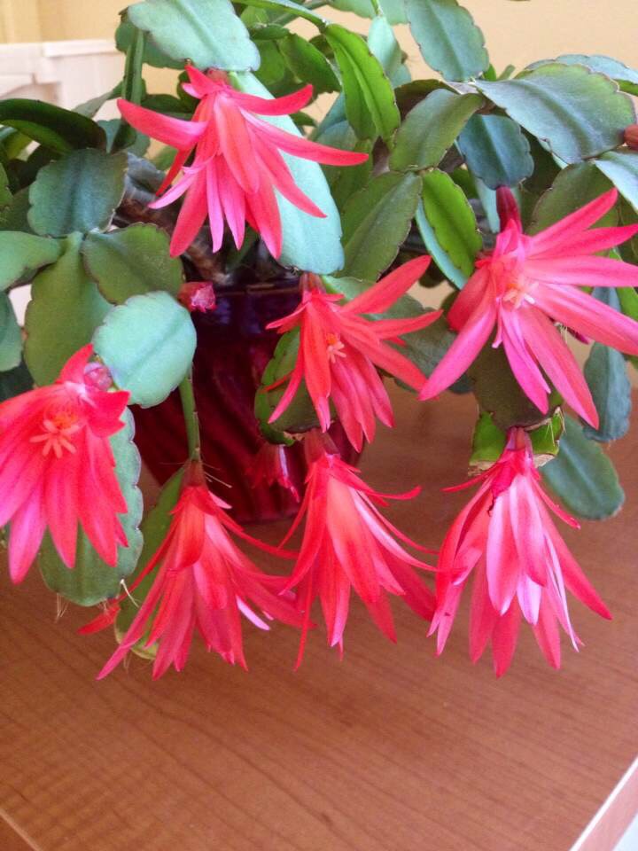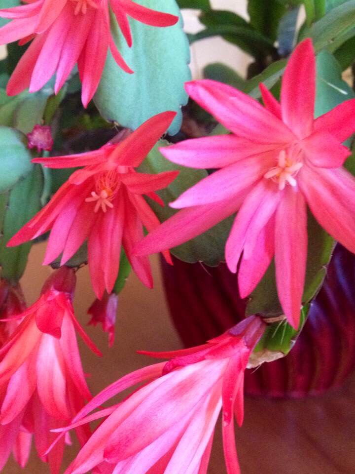 蟹爪兰开的花儿颜色都比较艳丽、醒目。除了几盆比较经典的粉红色的蟹爪兰外,我还有一盆亮红色的;开花儿的时候,也是美美的、有其独特的魅力!