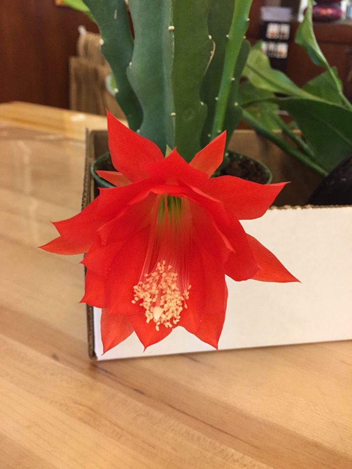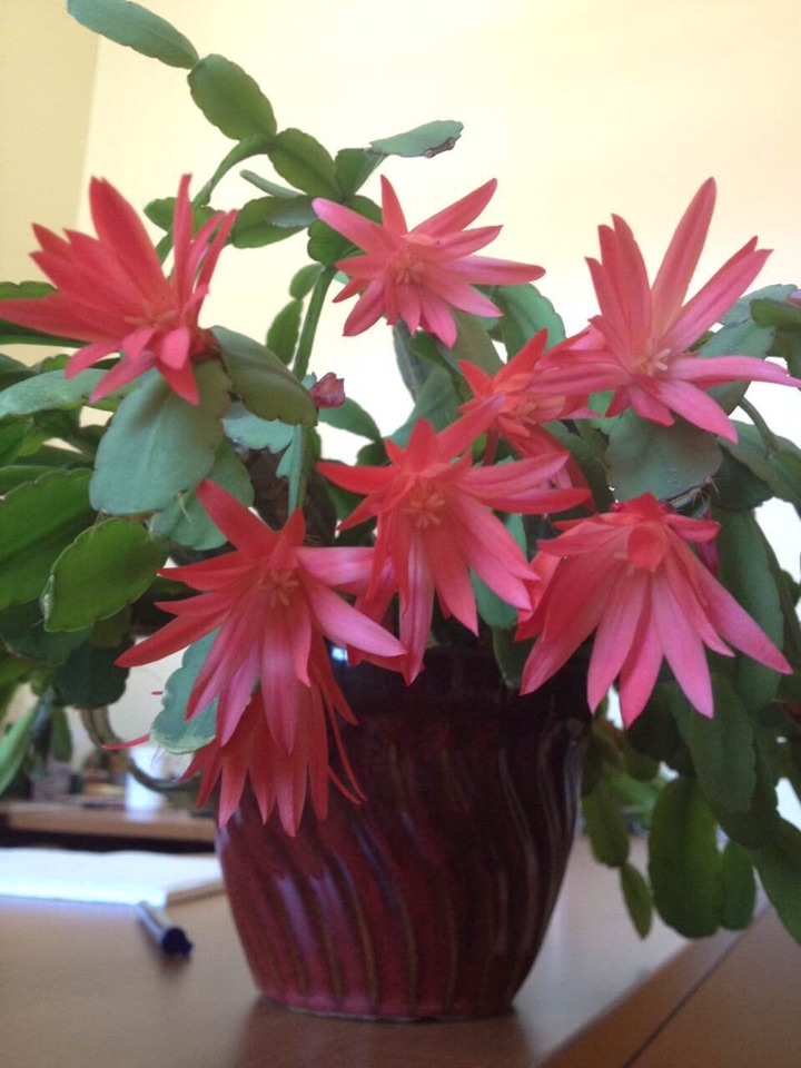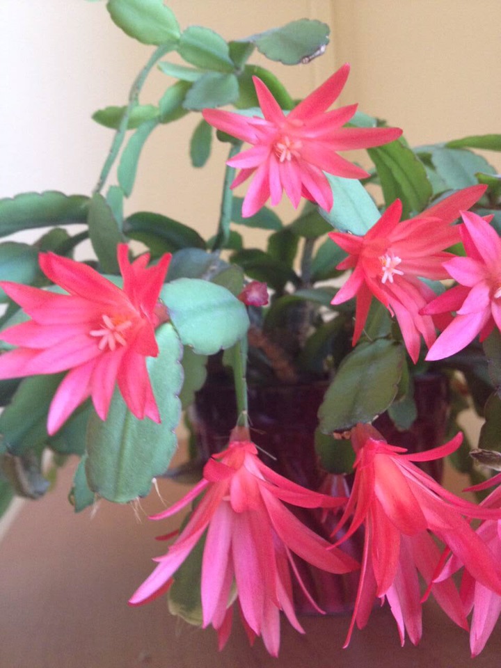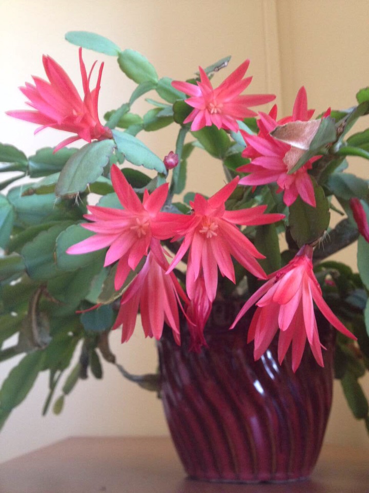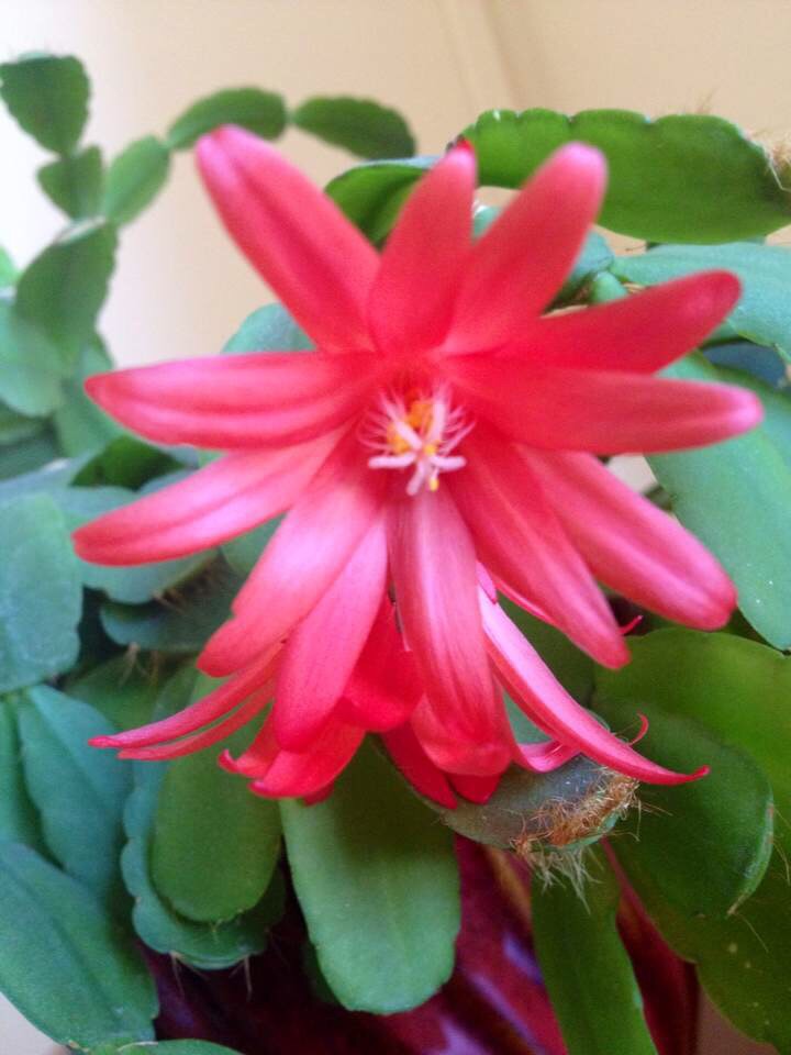 蟹爪兰开的花儿颜色都比较艳丽、醒目。除了几盆比较经典的粉红色的蟹爪兰外,我还有一盆亮红色的;开花儿的时候,也是美美的、有其独特的魅力!