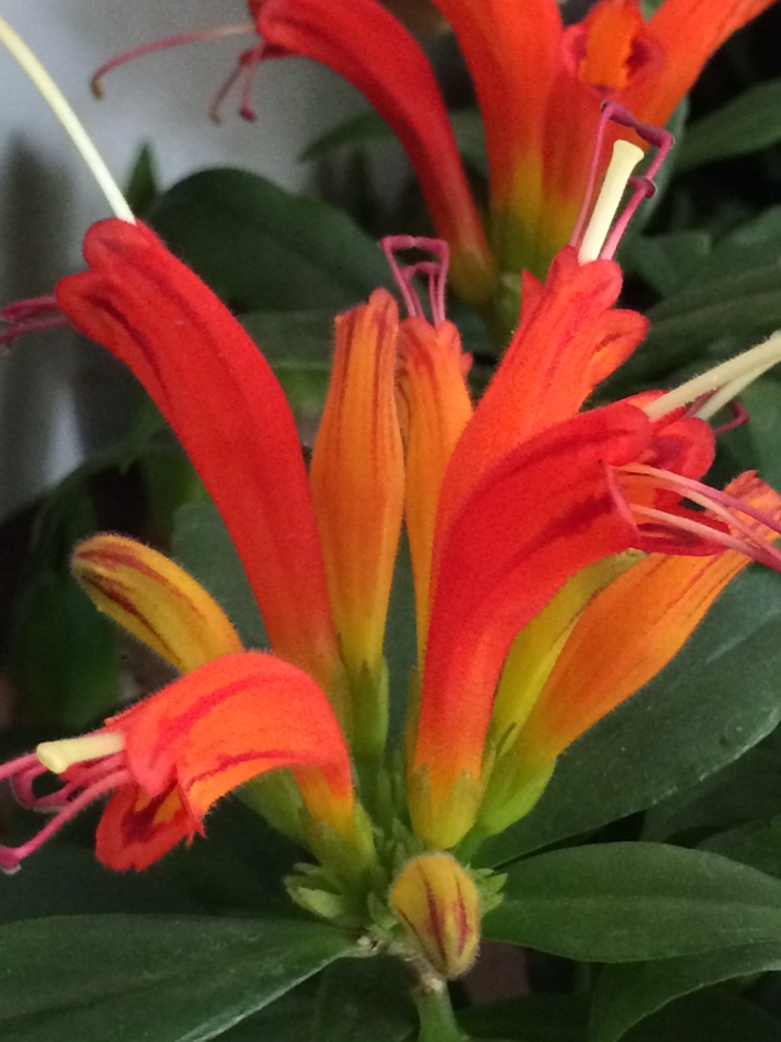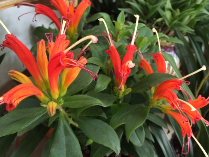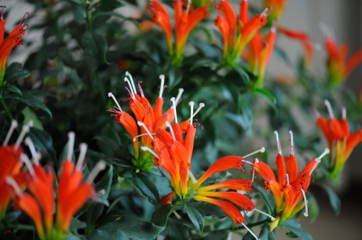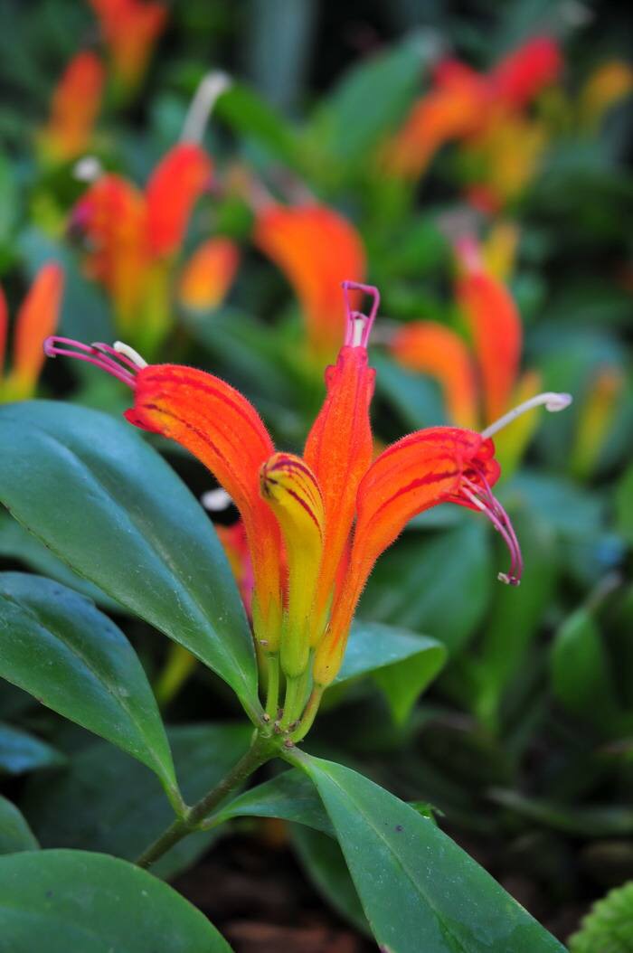 此花色泽艳丽,花型奇特,小花管状,弯曲,红色,花冠基部橙色,酷似口红。