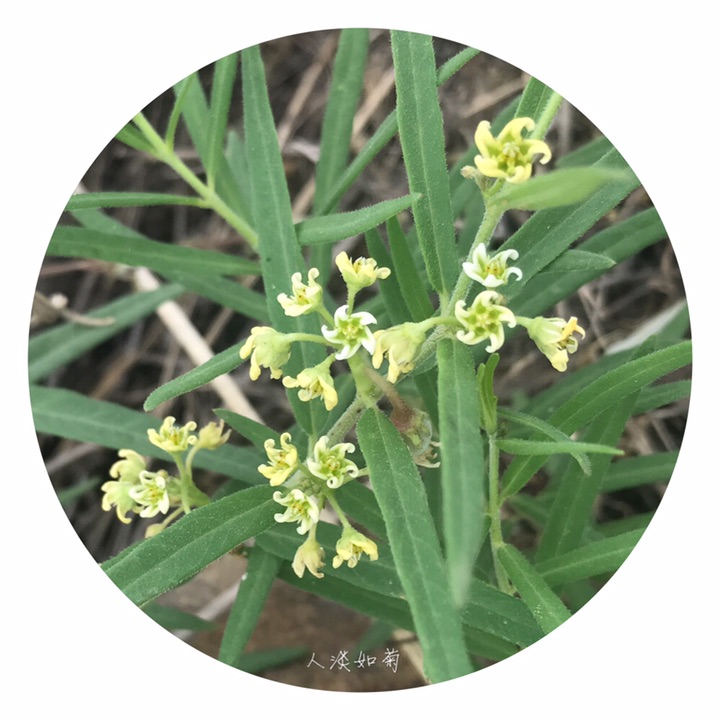 地梢瓜,别称地梢花、女青、羊角、奶瓜。拉丁文名:Cynanchum thesioides (Freyn) K. Schum. 萝藦科、鹅绒藤属;多年生草本,地下茎单轴横生;茎自基部多分枝,铺散或倾斜,密被白色短硬毛。叶对生或近对生,线形,先端尖,基部楔形,全缘,向背面反卷,两面被短硬毛,叶背中脉隆起。伞形聚伞花序腋生;花萼外面被柔毛;花冠绿白色,5深裂;副花冠杯状,裂片三角状披针形,渐尖,高过药隔的膜片,柱头扁平。