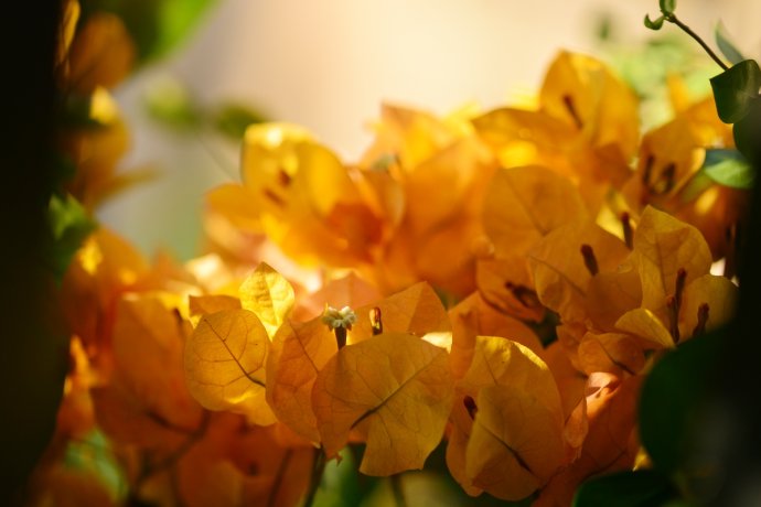 叶深绿,卵圆形,先端渐尖至急尖,萼管顶端裂片白黄色。花期在9月至第二年5月,黄色品种在每年秋季都能进入盛花期,但其耐寒性却不如普通三角梅,安全越冬需10℃以上才行。
