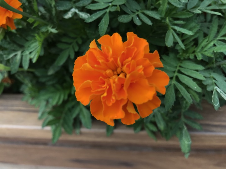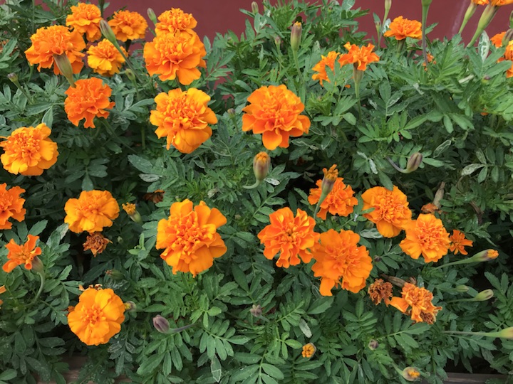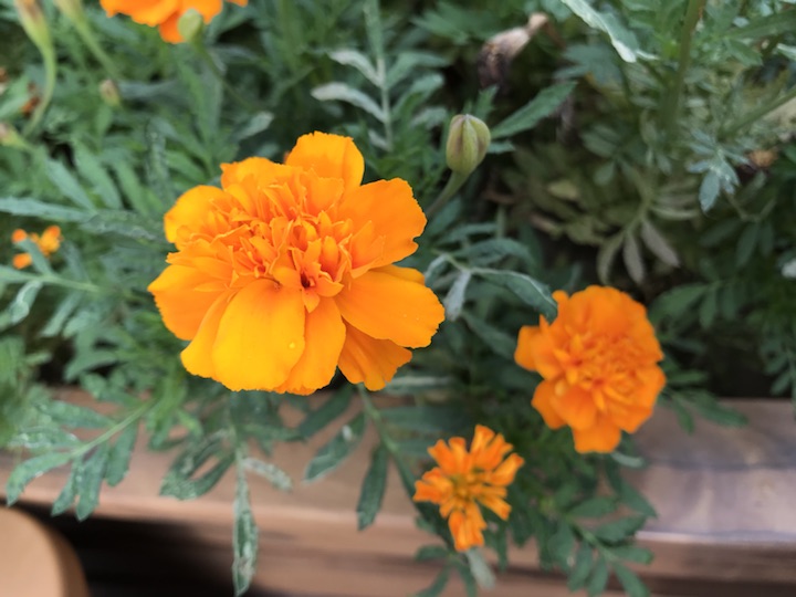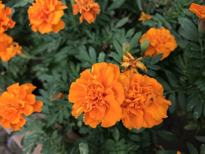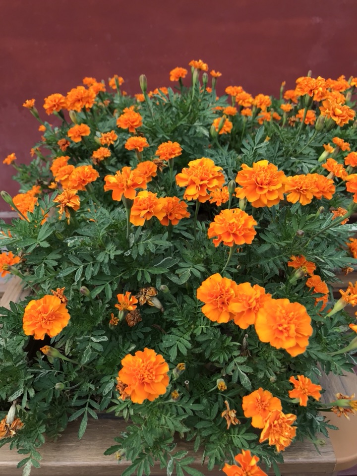 万寿菊和孔雀草花朵的颜色也很像,大多是开黄色或橙黄色的花。有看到这样的说法,孔雀草开花花瓣上会带着红色斑块,万寿菊则没有红色斑块。如果花朵看起来呈现红色,那就是孔雀草,因为它带有红色斑块。其实这个也不好区分,橙黄色本就呈现偏红色的感觉。还有另一个区分办法个人觉得是比较靠谱的,那就是看花瓣的浓密程度,万寿菊的花朵花瓣浓密,看起来比较饱满,而孔雀草的花朵花瓣比较稀疏,没有万寿菊那么层层叠叠。孔雀草的花瓣更加的平滑,万寿菊的花瓣则是有许多的裂齿。最后的终极法宝便是看花序了,万寿菊的花序梗顶端棍棒状膨大,孔雀草的花序梗先端稍增粗。