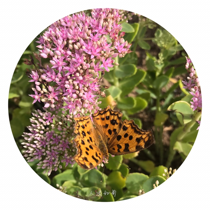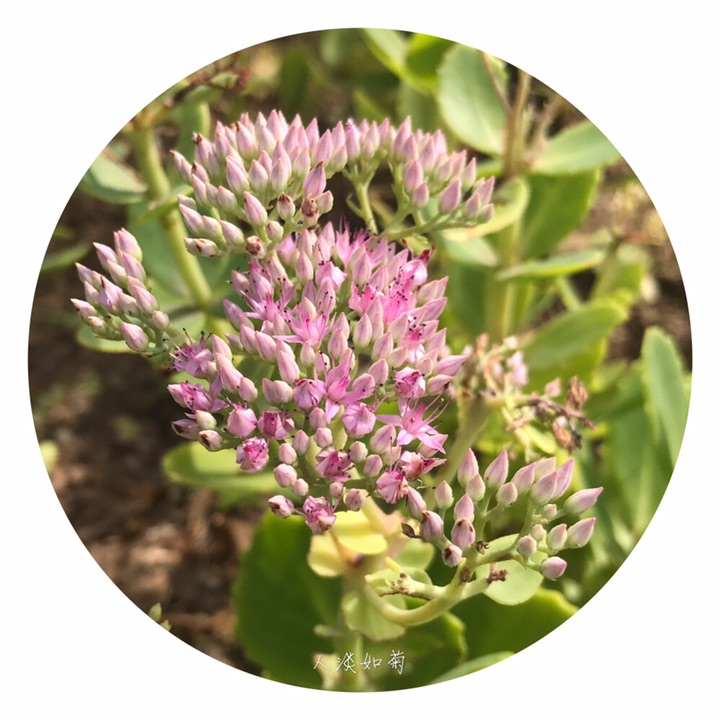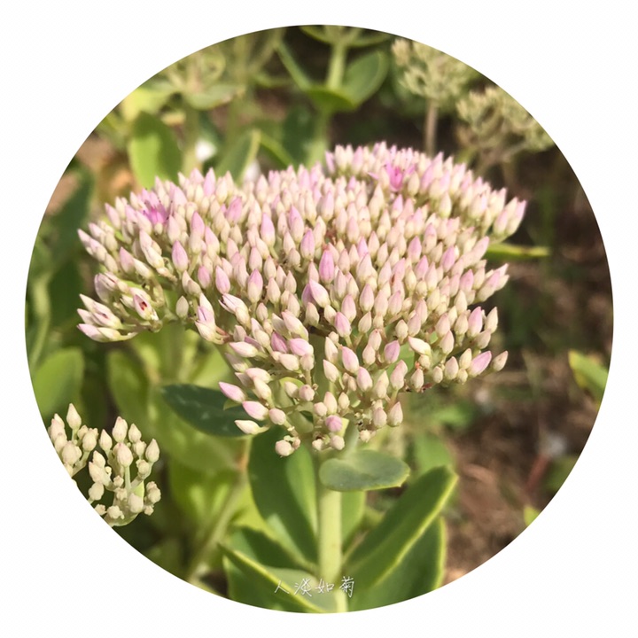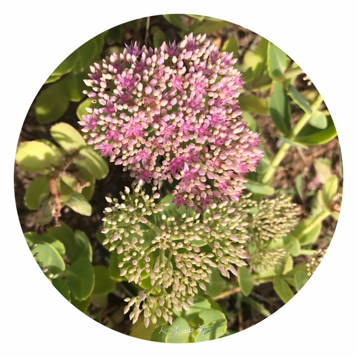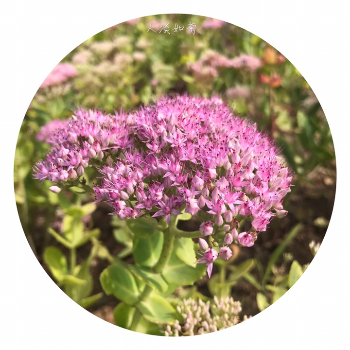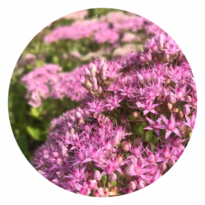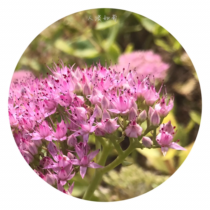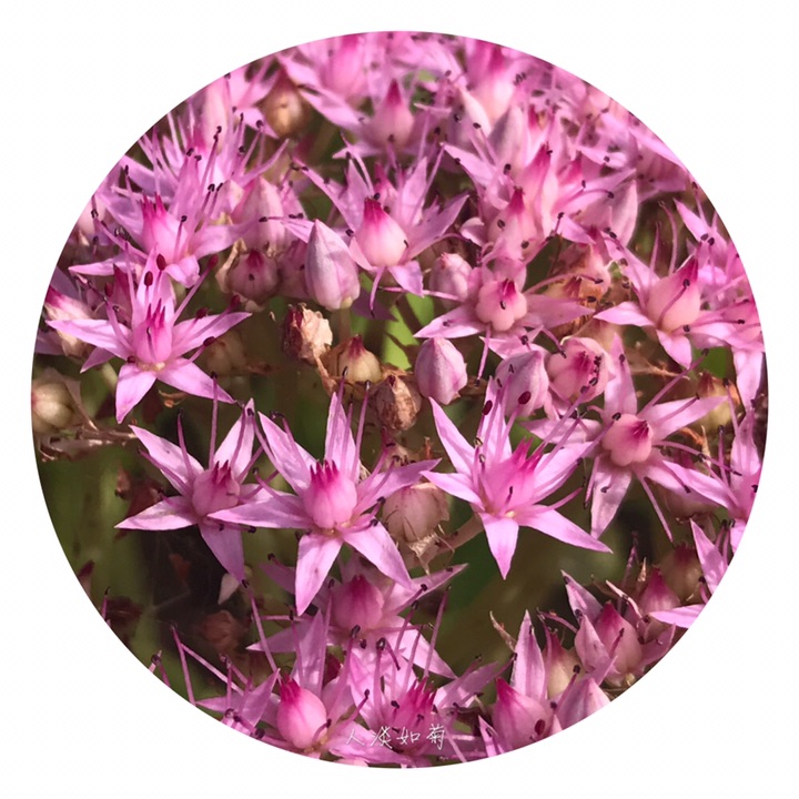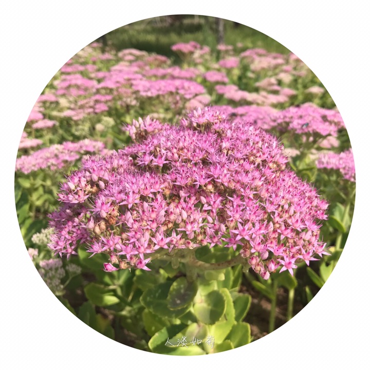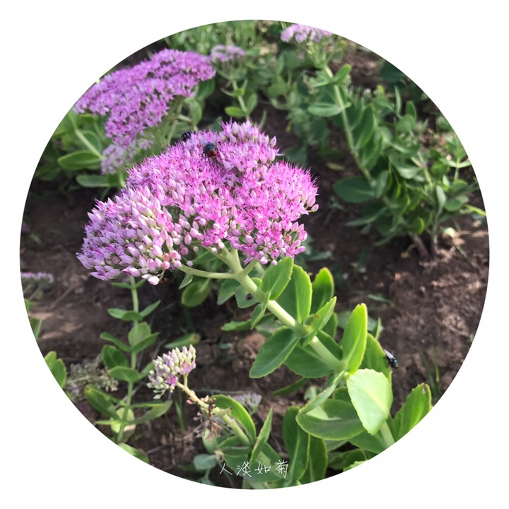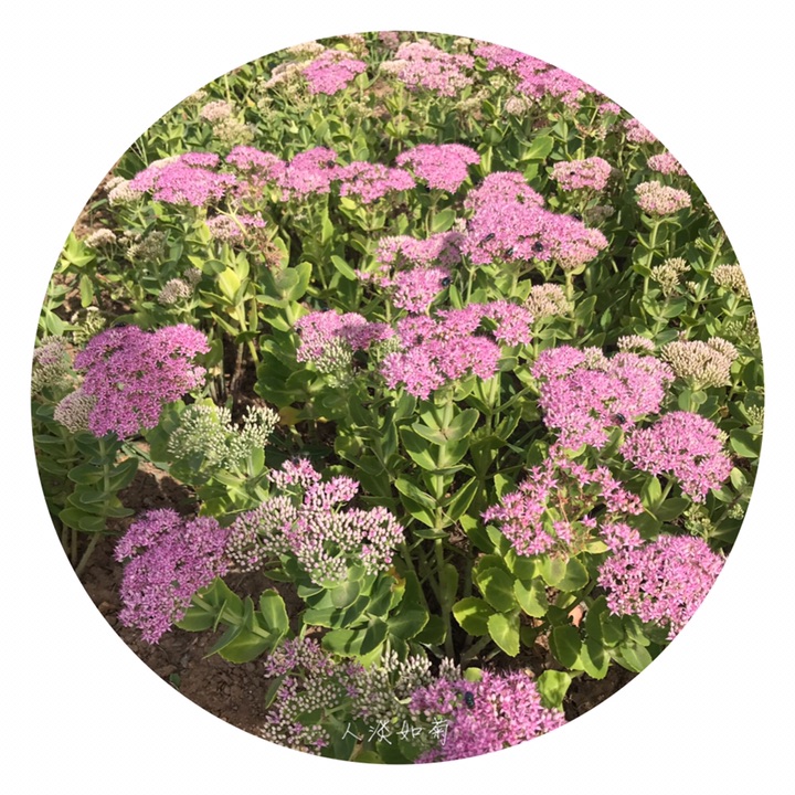 八宝景天,别称华丽景天、长药八宝、大叶景天、八宝、活血三七、对叶景天、白花蝎子草。拉丁文名Sedum spectabile. 是景天科景天属多年生肉质草本植物,地下茎肥厚,地上茎簇生,粗壮而直立,全株略被白粉,呈灰绿色。中国东北地区和朝鲜均有分布。常见栽培的尚有白色、紫红色、玫红色品种。 花期,7~10月。几乎是景天科中花色最为艳丽的种类。