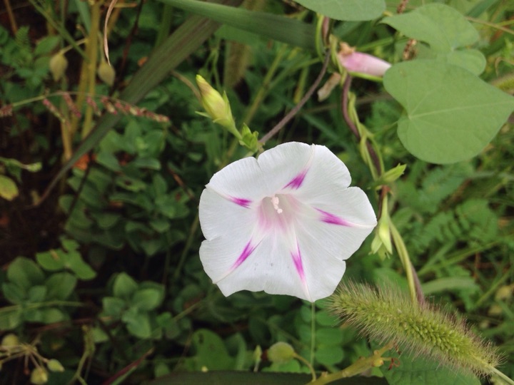 白色牵牛虽着素, 雍容典雅似仙姑。 面露紫粉七八点, 赴宴瑶池在归途。
