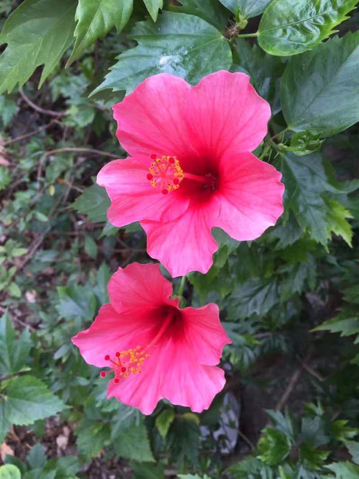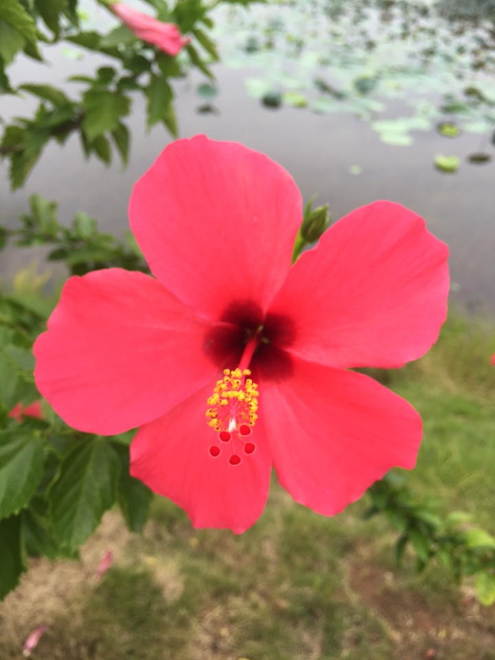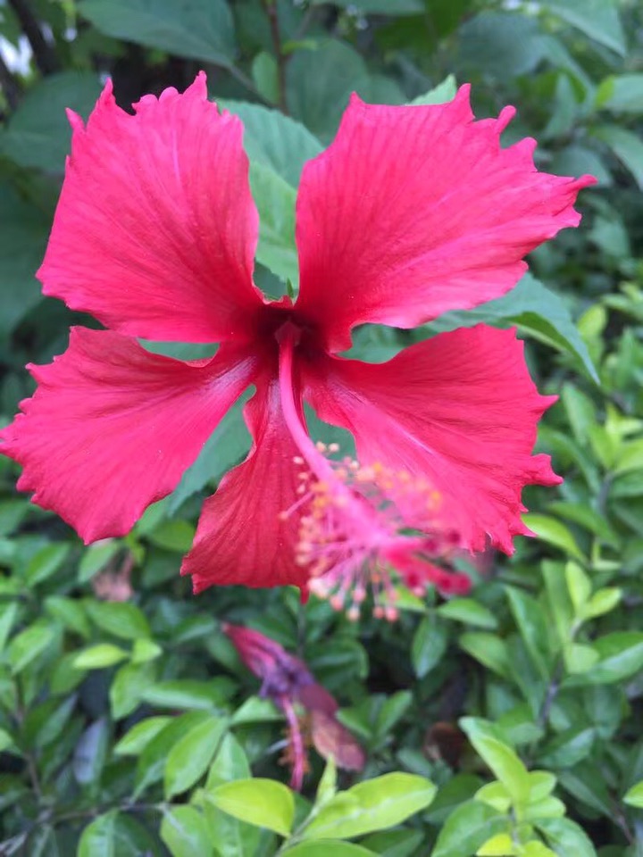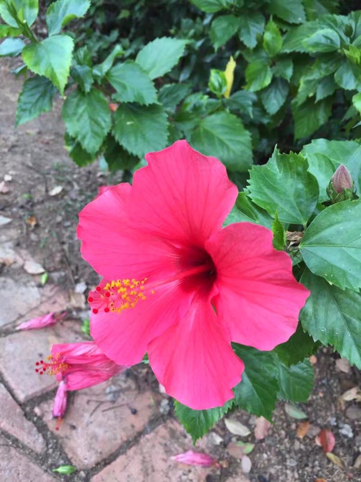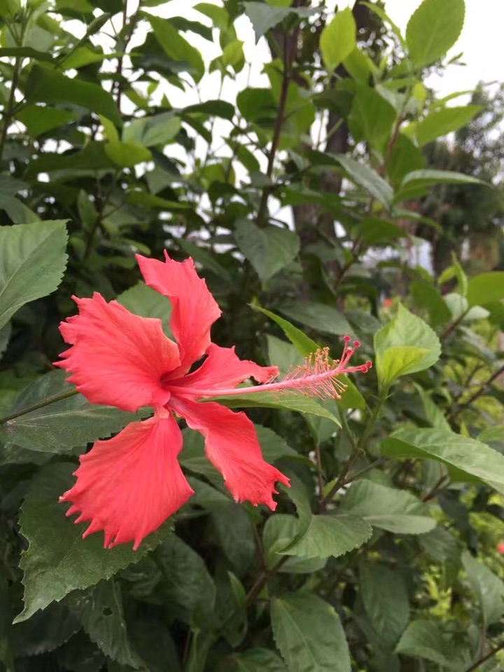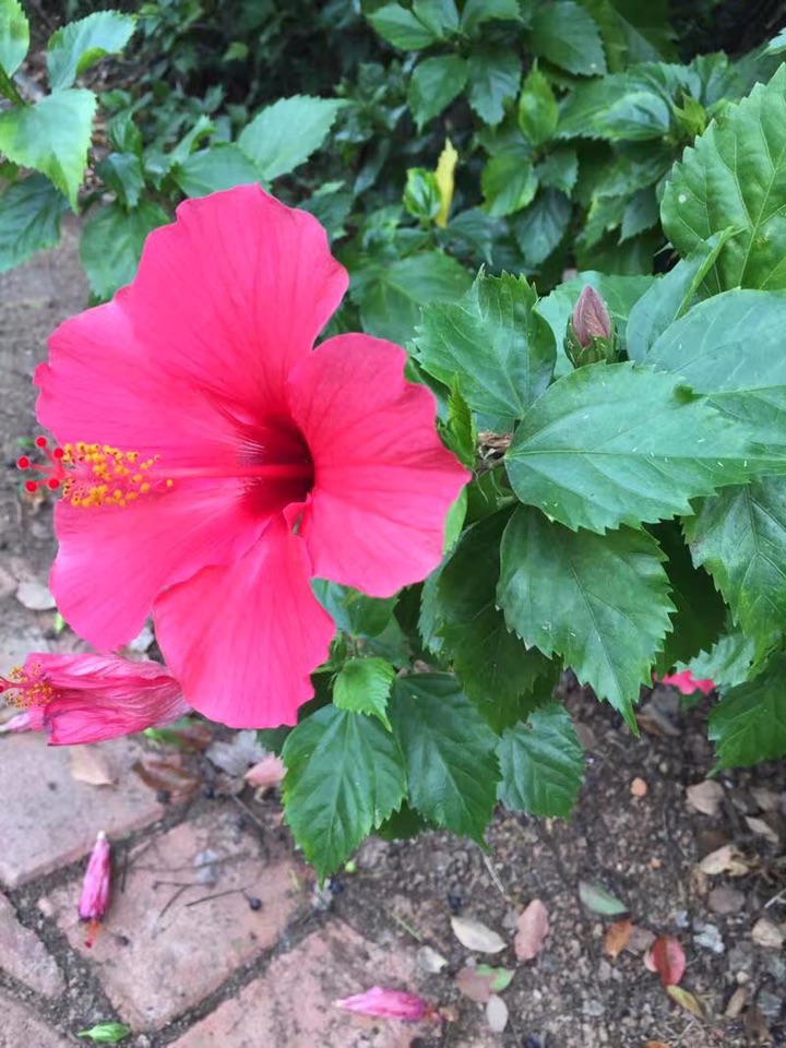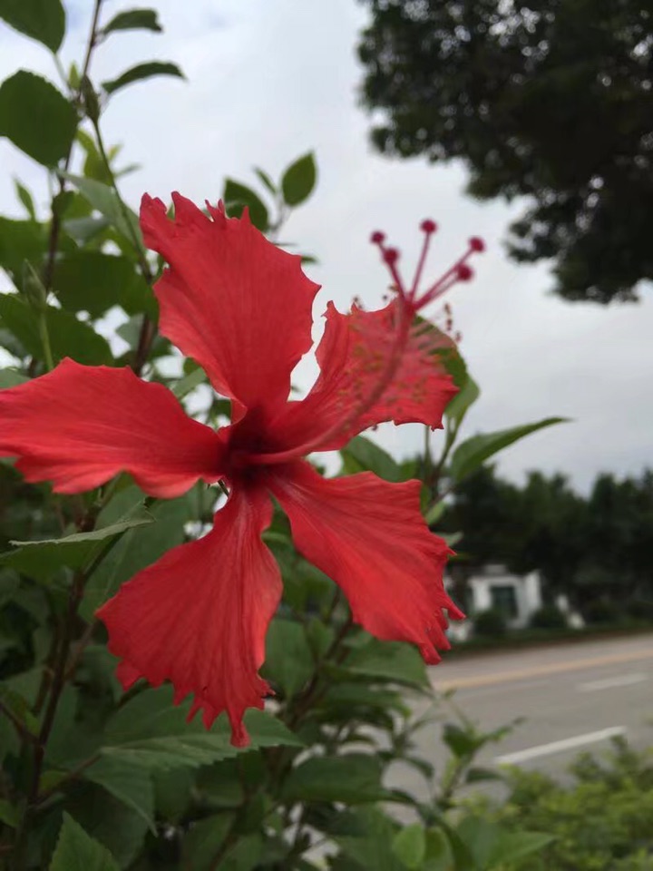 散步公园,朱槿正开得灿烂。忽然发现,朱槿还是很美的,红的热烈,间或点缀着素雅的白花,也是一道明媚的风景。
