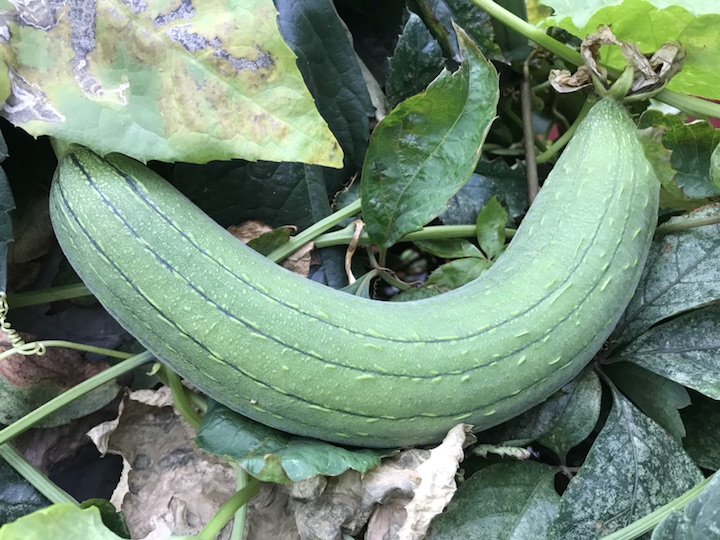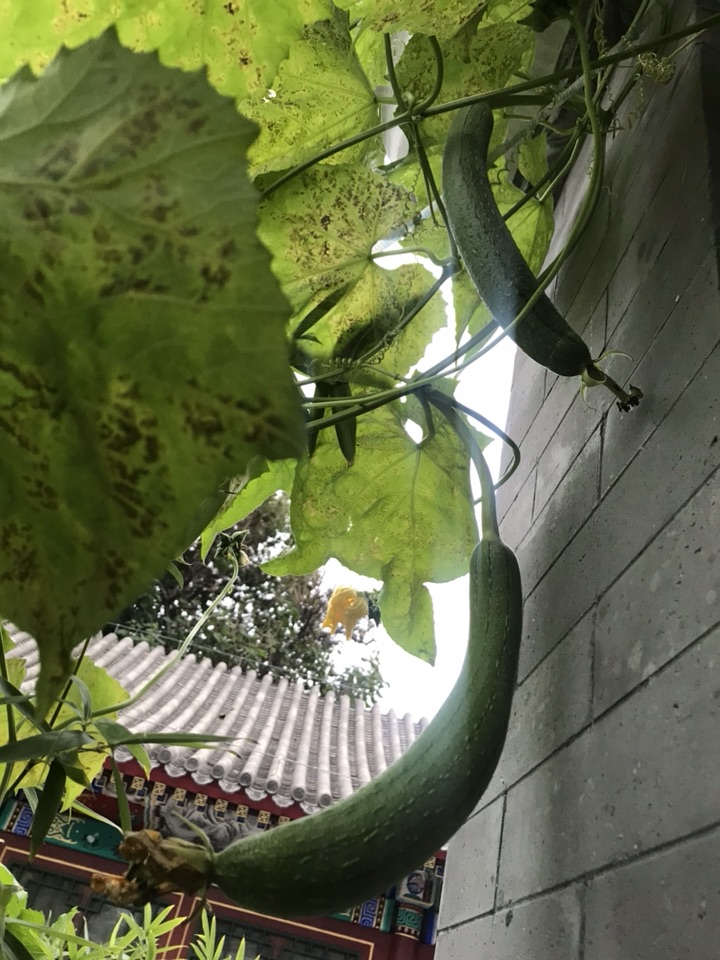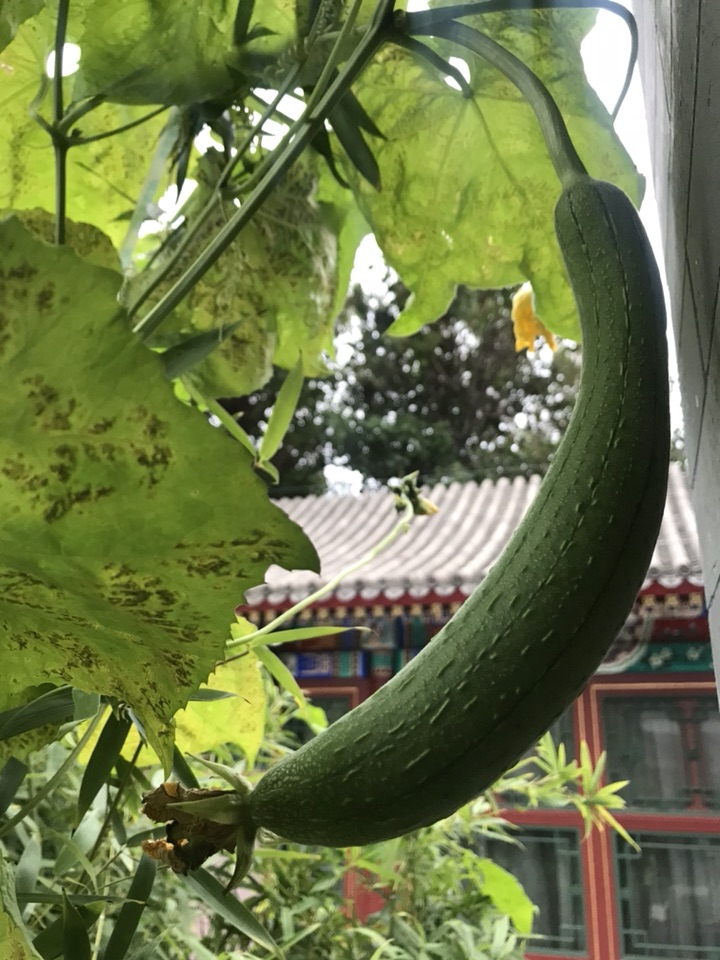 特意去翻了一下记录,打8月26日丝瓜藤开出第一朵花以来,小院的丝瓜花从没有间断过,朵朵明晃晃的大黄花在绿叶中盎然绽放,完全淹没了爬山虎的风采。不过,这次的主角不是花花,而是不知觉间默默长成盘中餐的大丝瓜了。