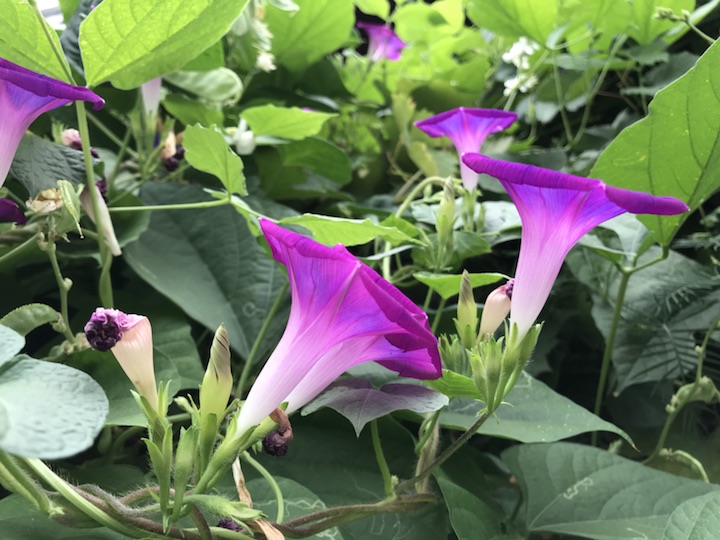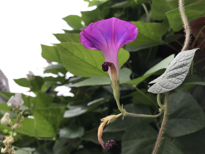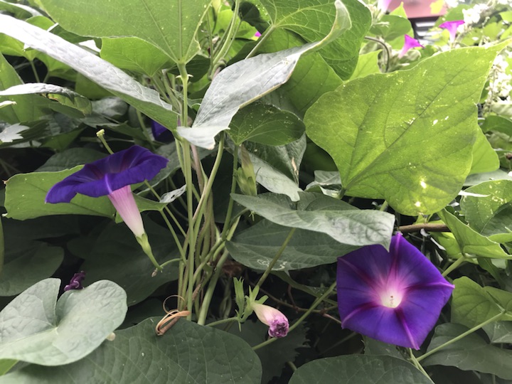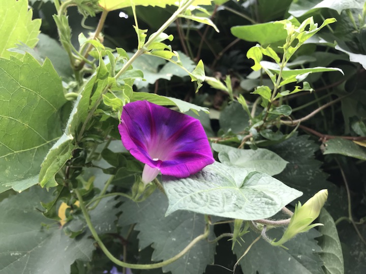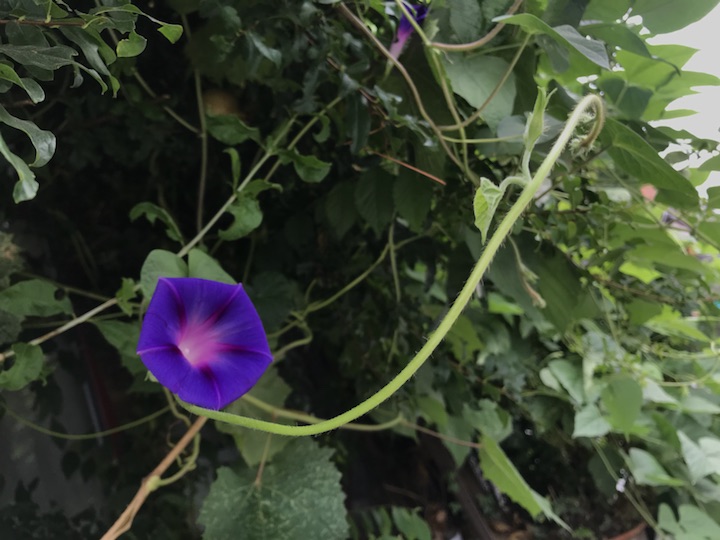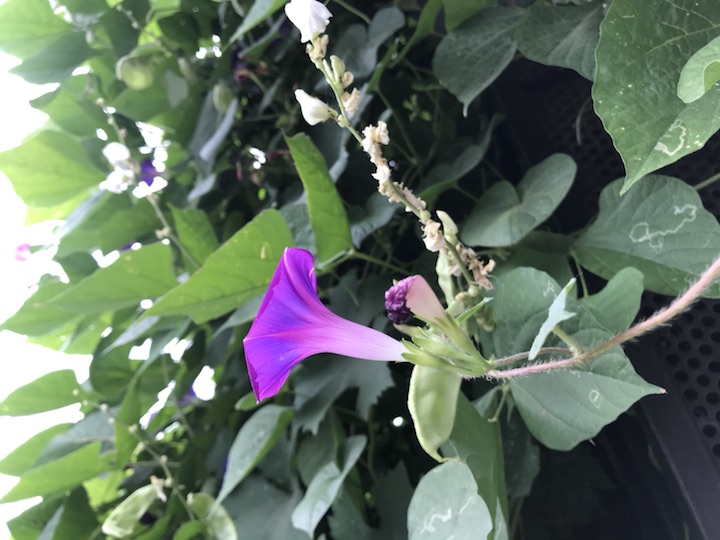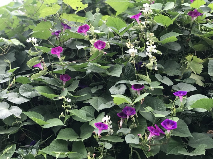 这个牵牛花是跟扁豆长在一块的,白花的扁豆,紫红的牵牛两相缠绕,花叶掩映,互争秋阳, 好不热闹!