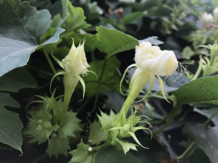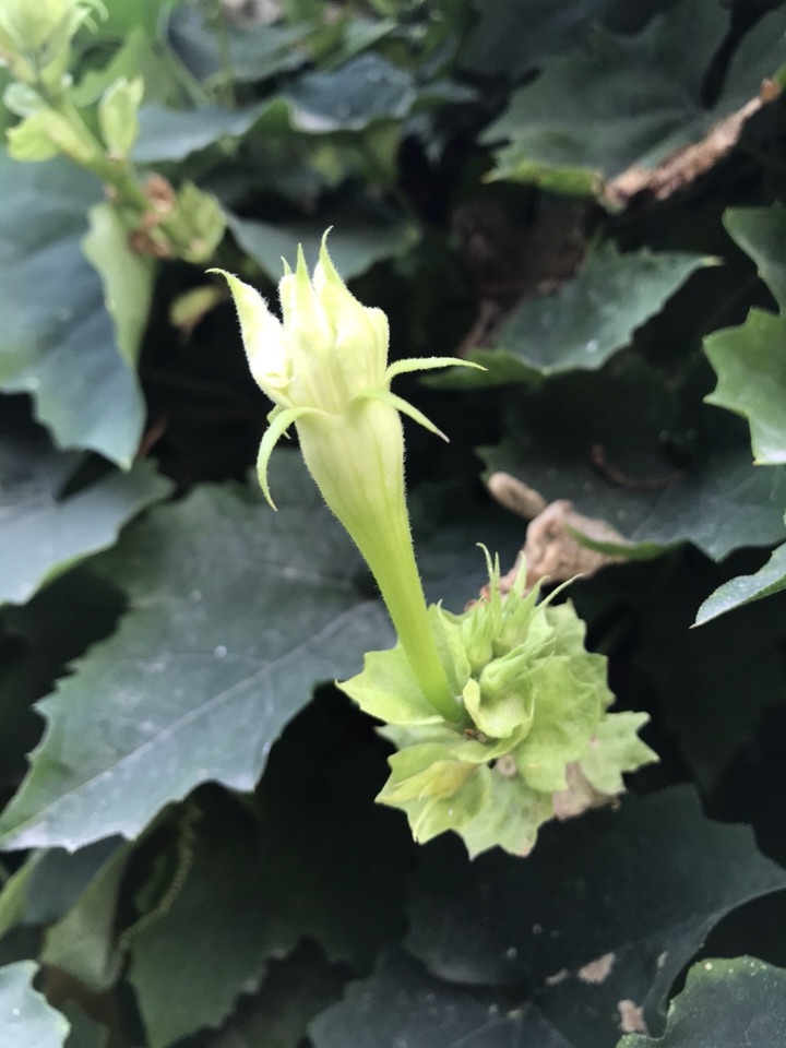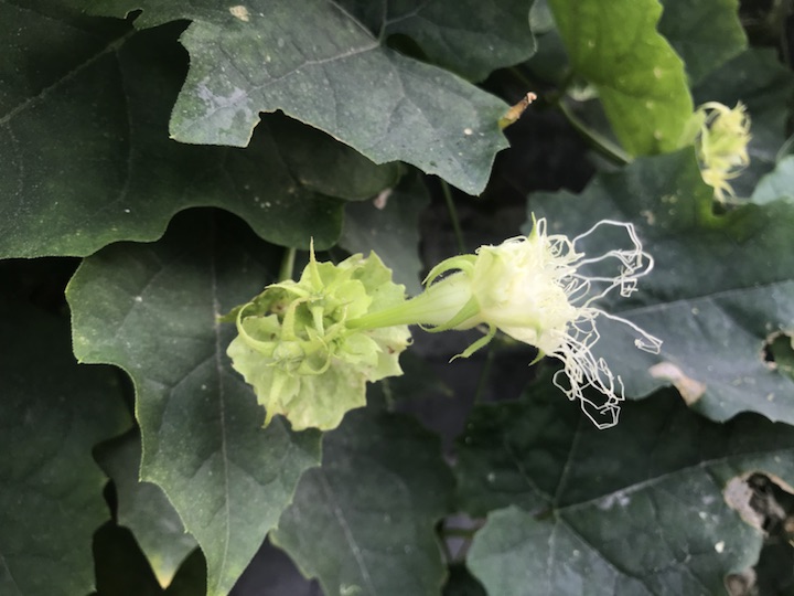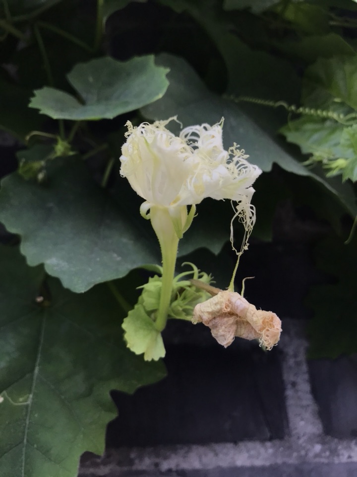这是9月8号下午偶然间发现它的,一开始以为是葫芦,凑近了才发现并不是。形色识别栝蒌,从来没有想过它会是栝蒌,因为印象中栝蒌的叶子可是有点像苦瓜的,可是这个并没有。词条中配的图片恰好是它白色的花盛开的样子,美的不可方物一下便抓了我的眼,我的心,当即便决定第二天一早要去看它拍它