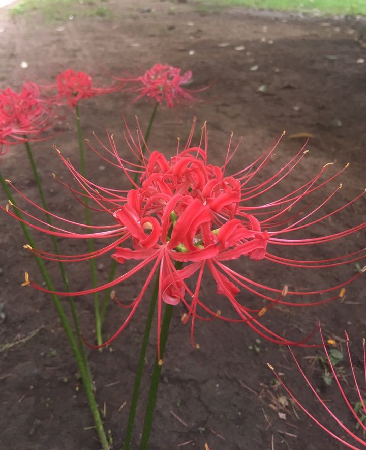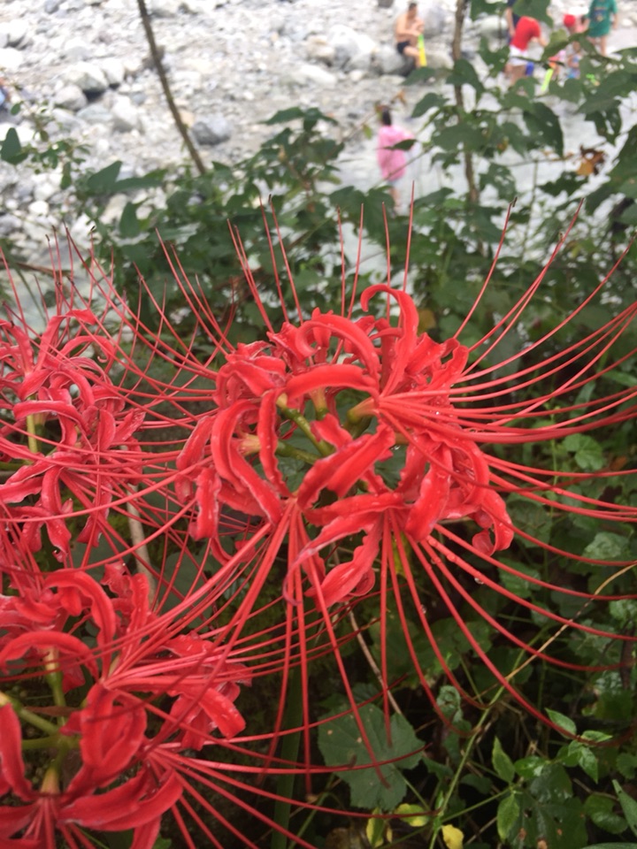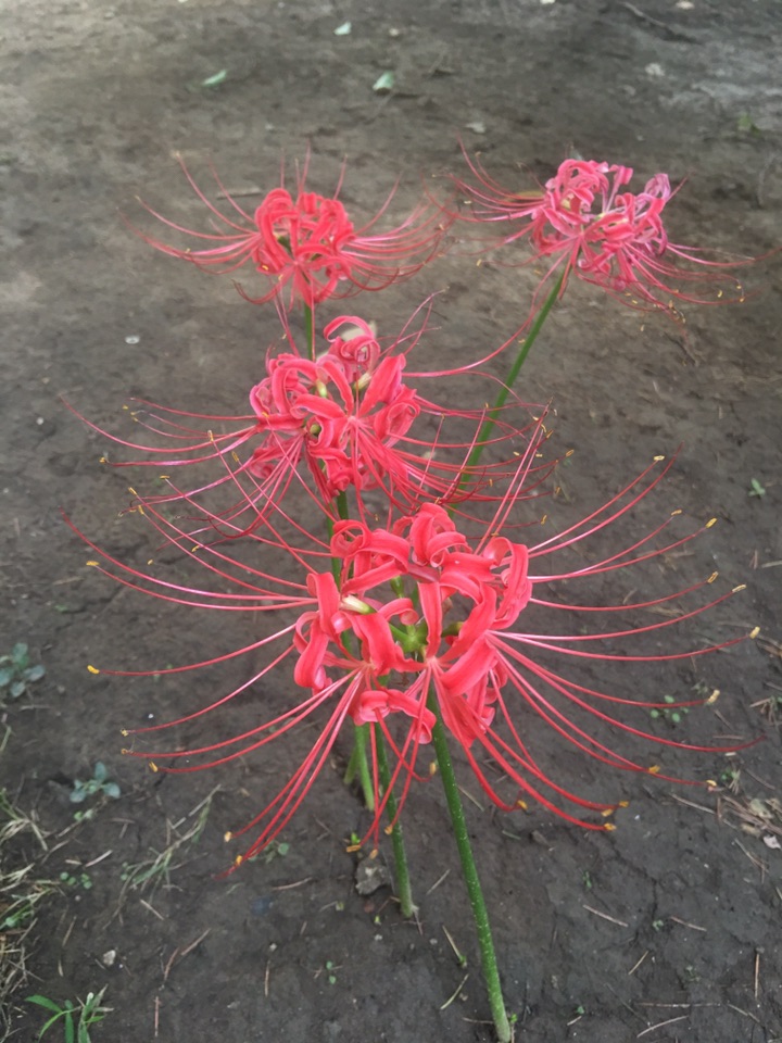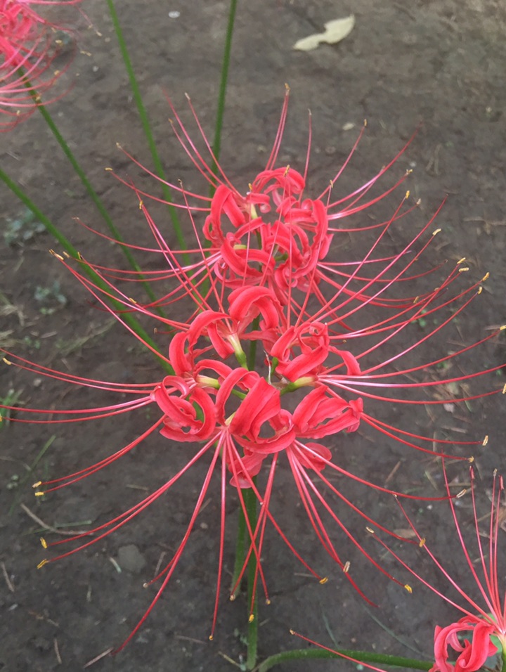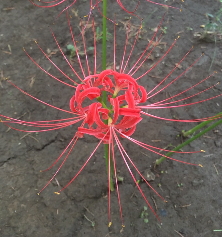 中文学名:红花石蒜,花期夏末秋初,约从7月至9月,性喜阴湿环境。花茎长30-60厘米,通常4-6朵排成伞形,着生在花茎顶端,花瓣倒披针形,花被红色,向后开展卷曲,边缘呈皱波状,雄蕊和花柱突出。