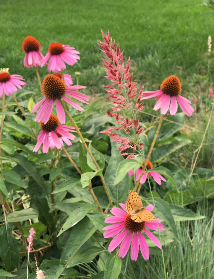 没想到松果菊还能这样漂亮,应该是粉色带来的效果,当然还有红毛草和绿地的映衬,这场面,爱凑热闹的蝴蝶当然不会错过。