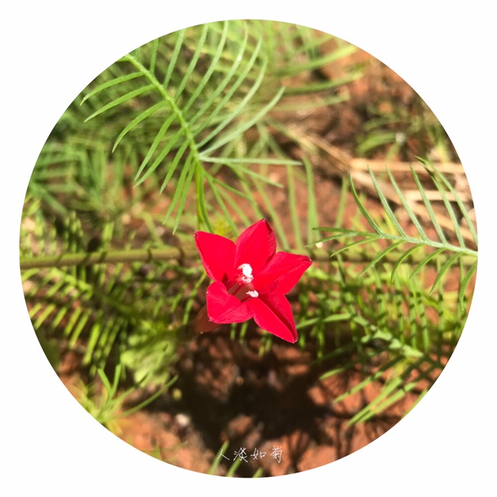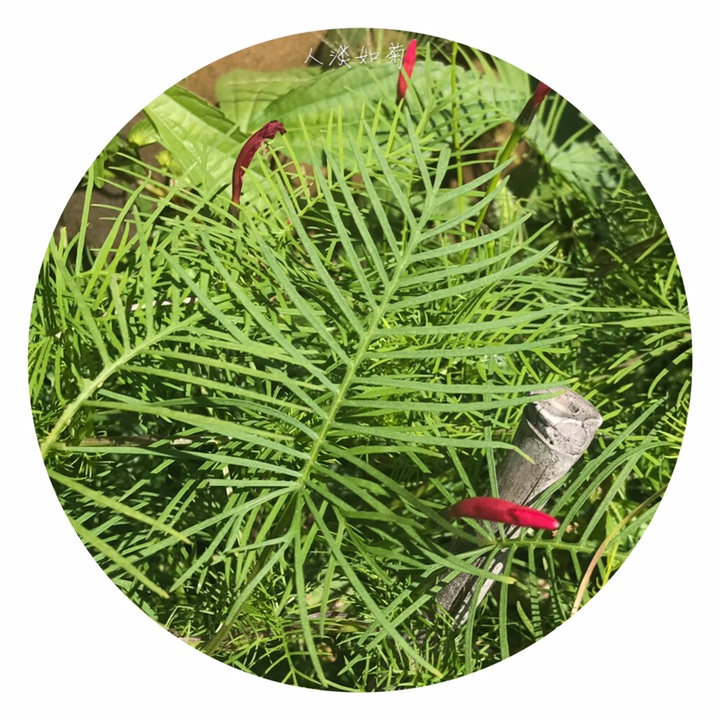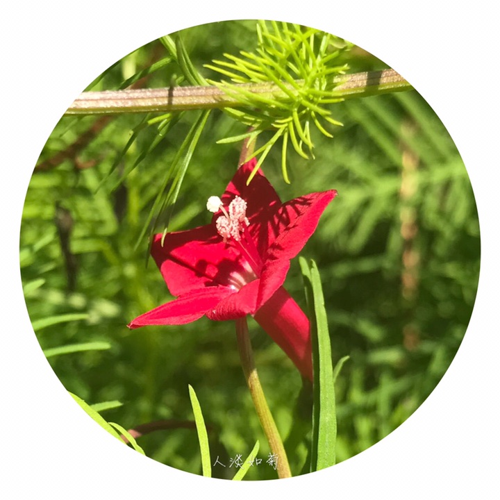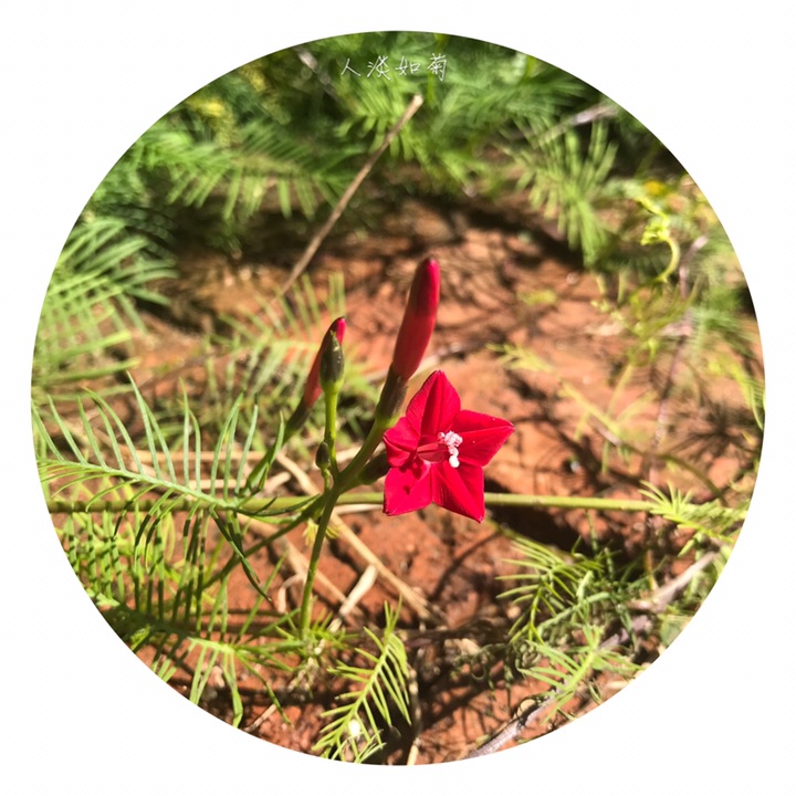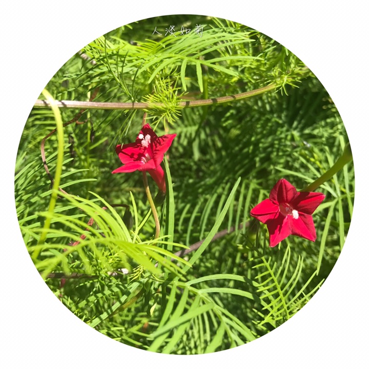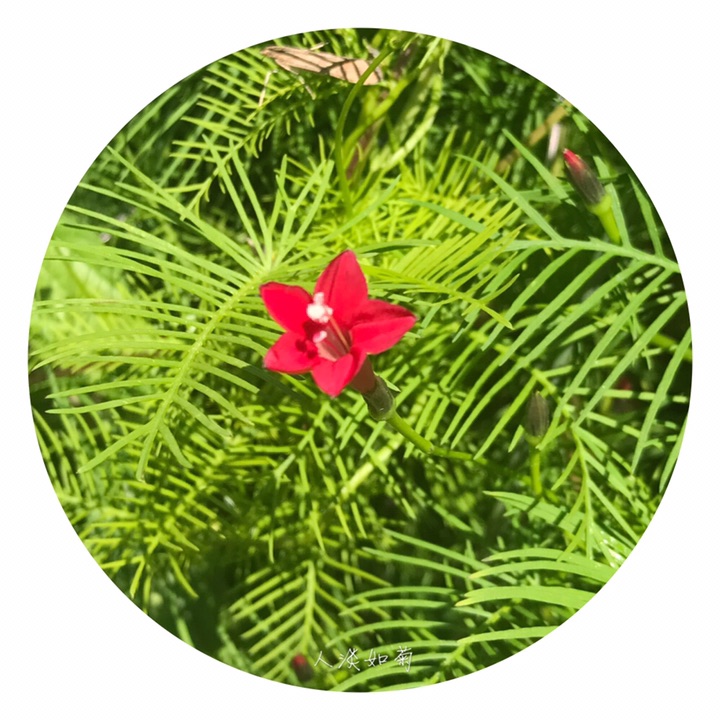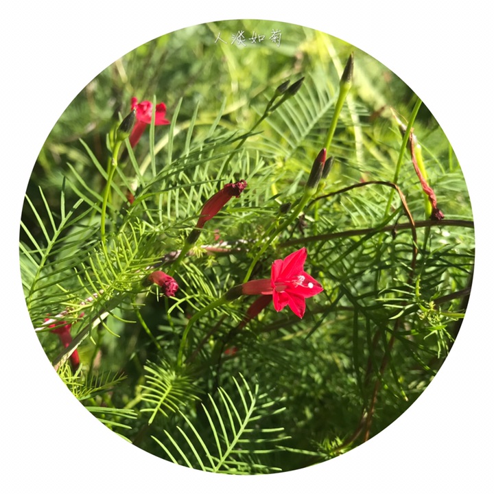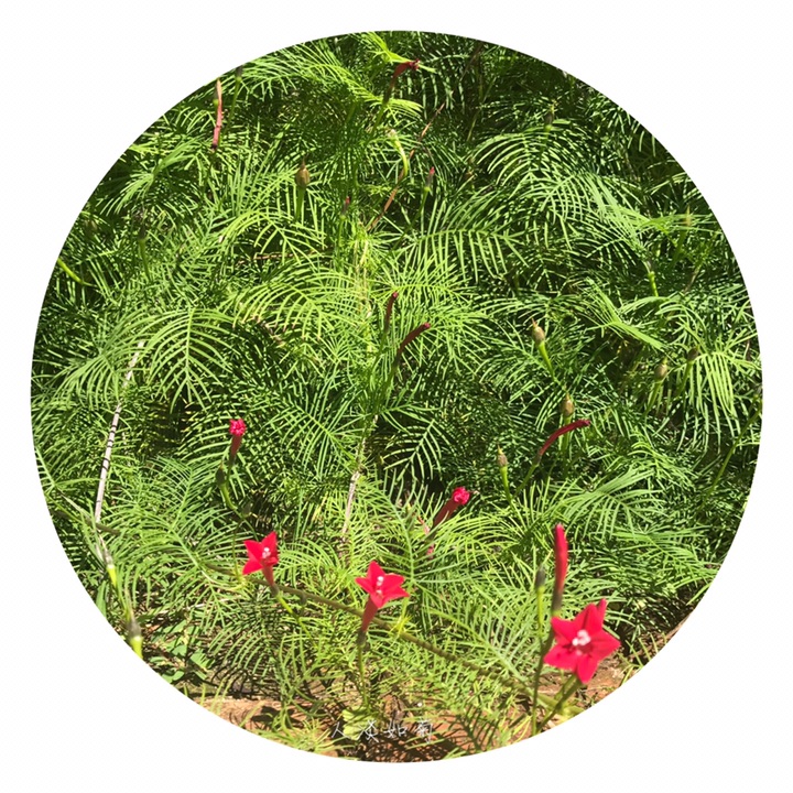 想拍茑萝松已有月余,终未得空,却在千山偶遇,缘至!茑萝松(学名:Quamoclit pennata (Desr.) Boj. )别称茑萝、五角星花、羽叶茑萝、锦屏封、金丝线、绕龙花。旋花科茑萝属一年生缠绕草本植物。单叶互生,羽状深裂,裂片线形,细长如丝。聚伞花序腋生,着花数朵,花从叶腋下生出,花梗长约寸余,上着数朵五角星状小花,鲜红色,花期7—10月。茑萝花清晨开花,太阳落山后,花瓣便向里卷起,成苞状。蒴果卵圆形,果熟期不一致,种子黑色,有棕色细毛。