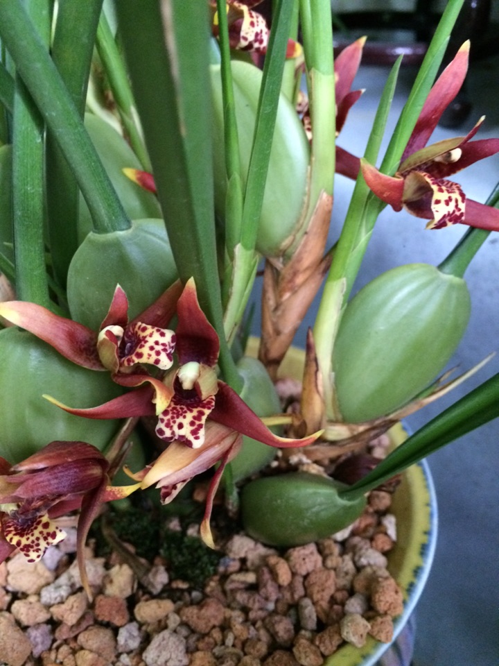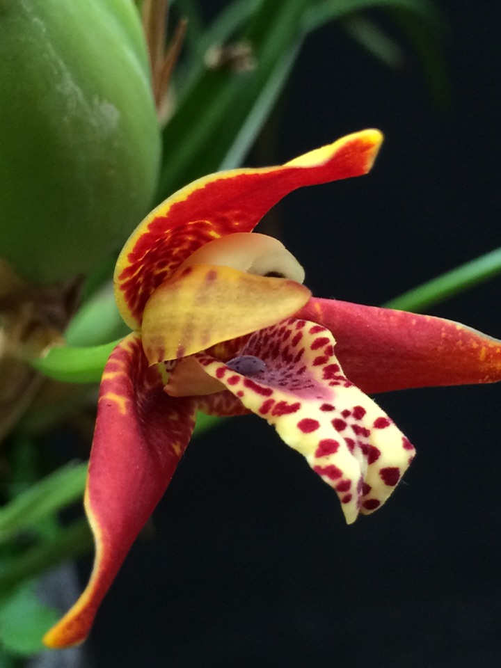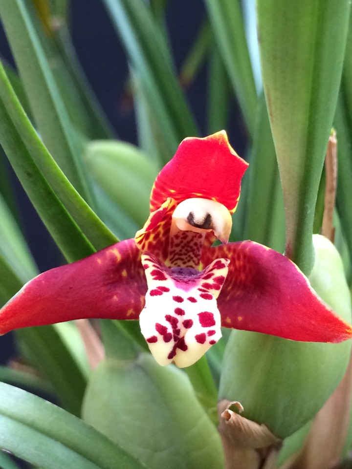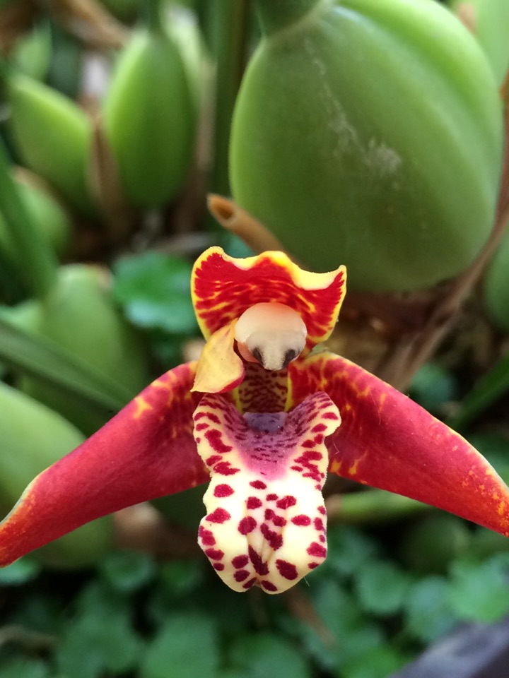 腋唇兰是兰科腋唇兰属,植株基部有扁平假球茎,光滑润泽,翠绿鲜亮,如同一个个绿色荷包,非常可爱,花梗从球茎基部抽出。花色鲜红至暗红,花朵㪚发出强烈的巧克力香味。