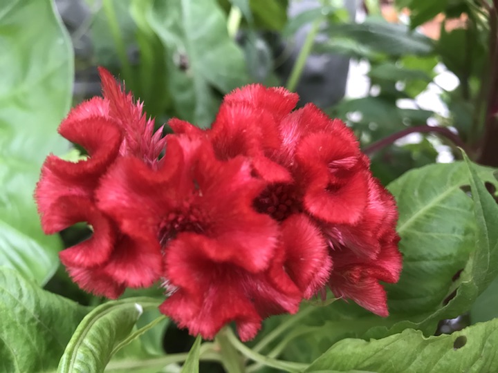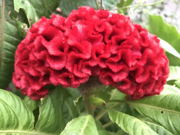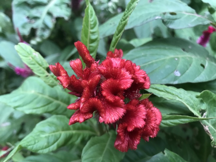 这个鸡冠花也是我每日的沿途风景,初开的时候拍过一次,后来便没有再去特别关注了。今早,去看昙花的时候发现一片紫红中居然还有几棵颜色这么红艳