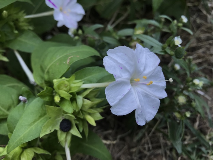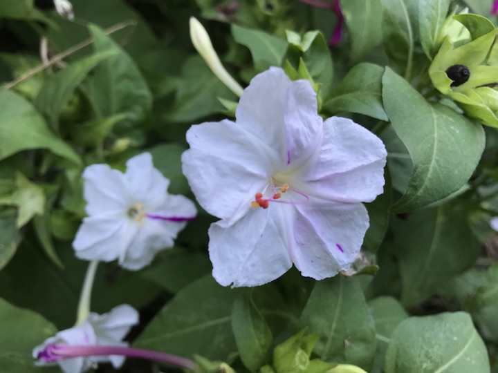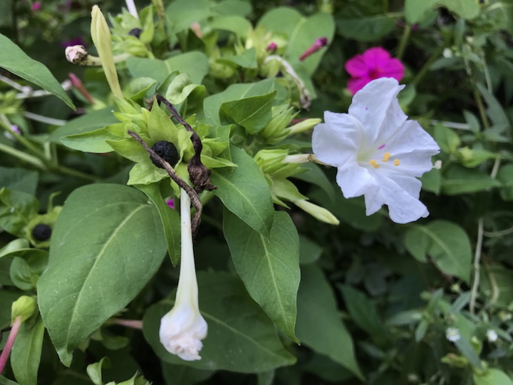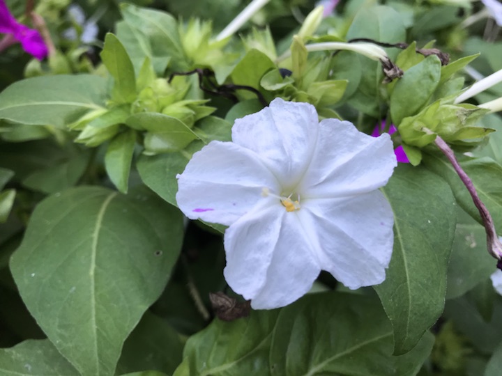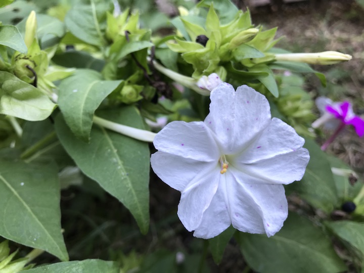 紫茉莉的种子是我去年亲手采的,当时是紫红、白色两种特别纯粹的花花,可能是我把种子混杂在一起的缘故吧,开出来的白色却没有一朵纯白的花,每一朵间或的都有些许红色点缀其间,而紫红色的却没有受到影响,你说奇怪不奇怪!