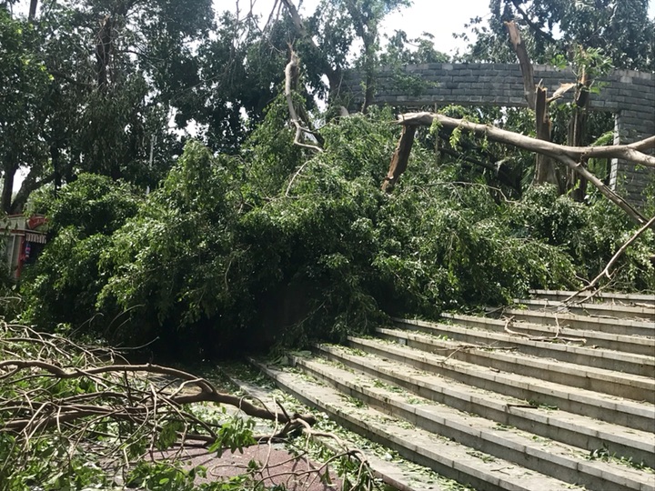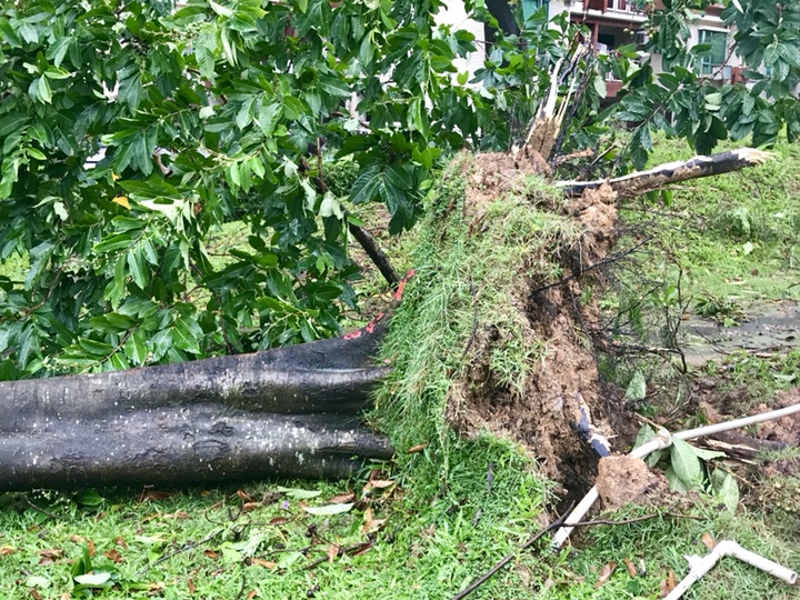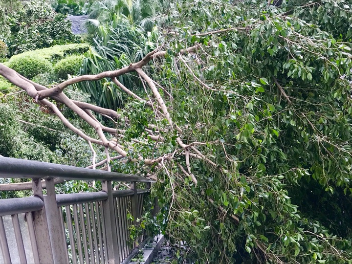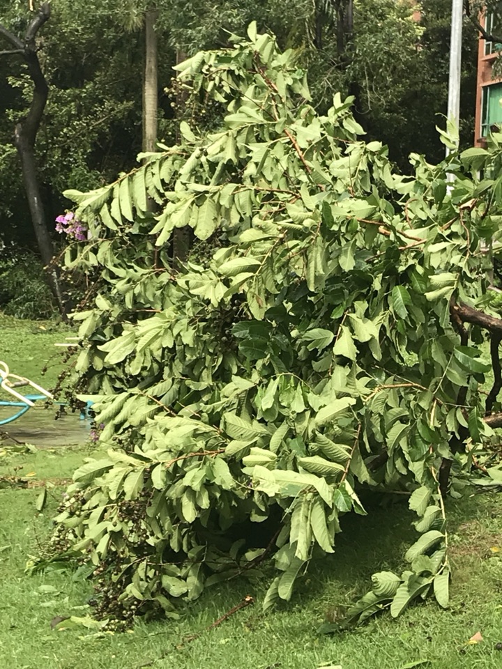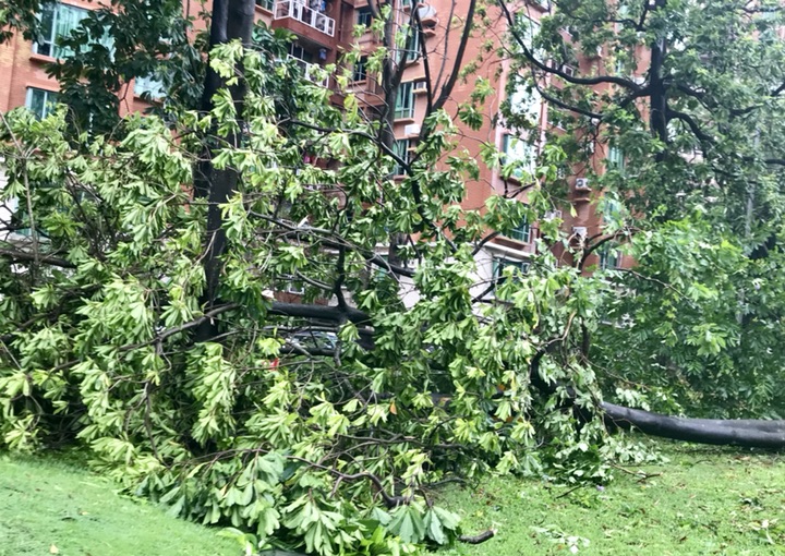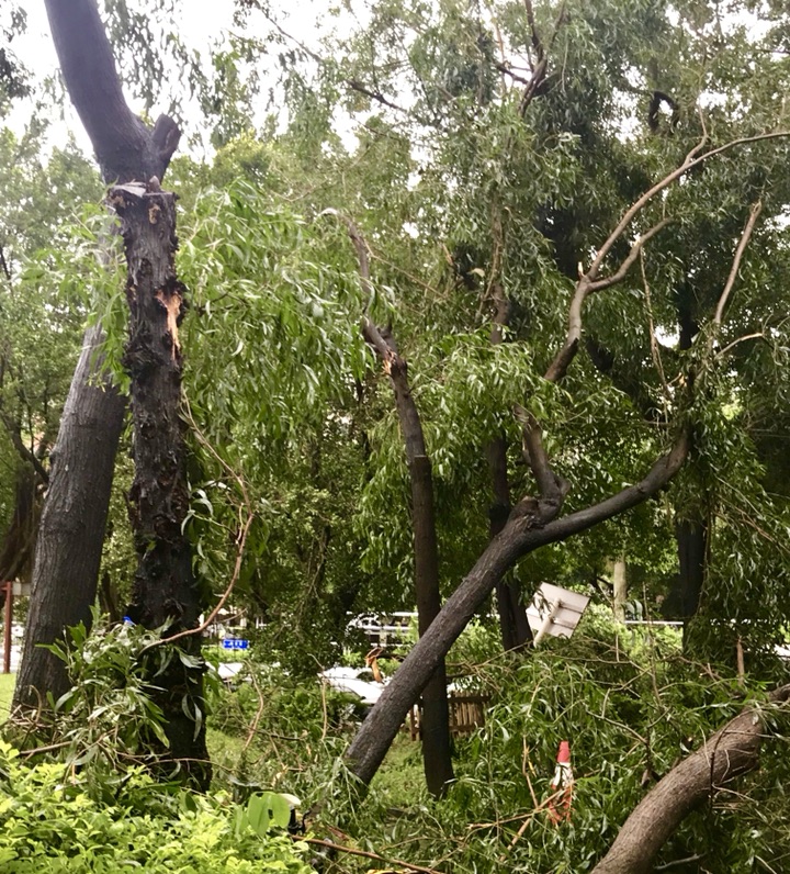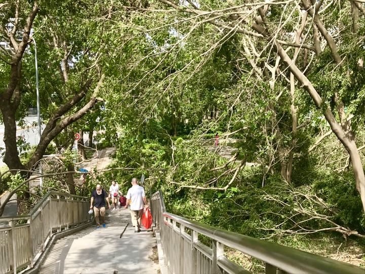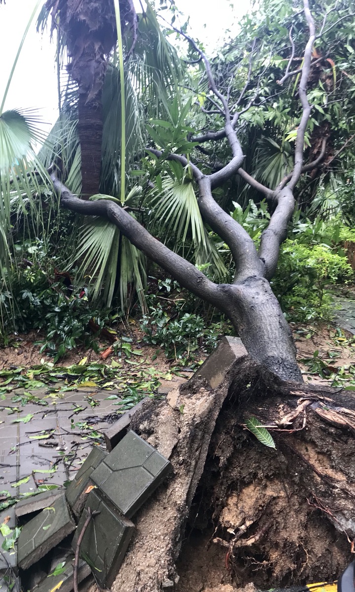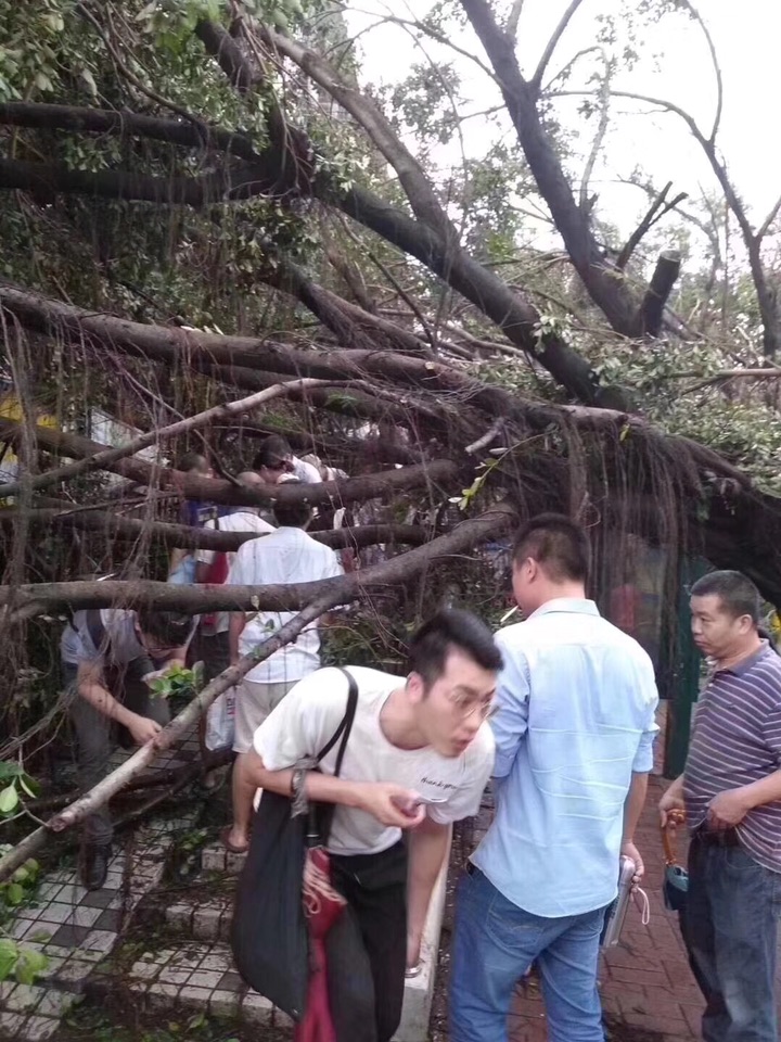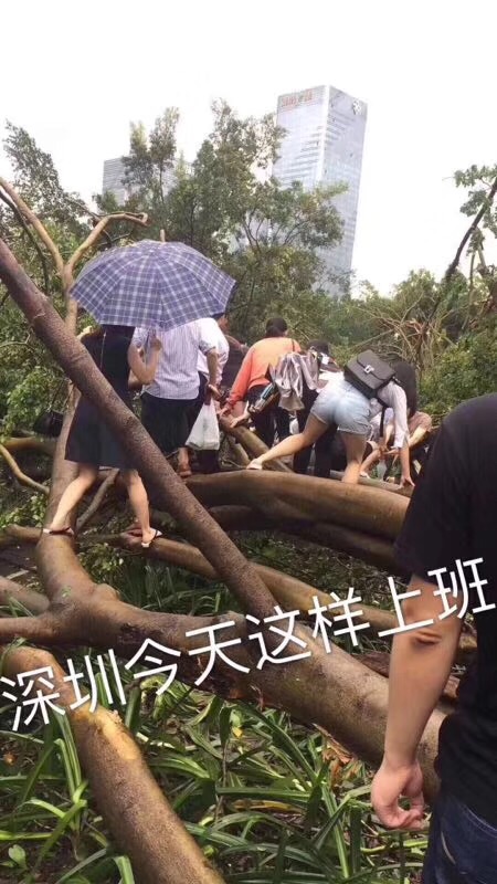 :在家还不觉得严重,没停电停水,也没断网,出门震惊🤯了,到处是倒了的树木🌲,很多义工都帮忙清理,深圳人笑称:城市森林历险记