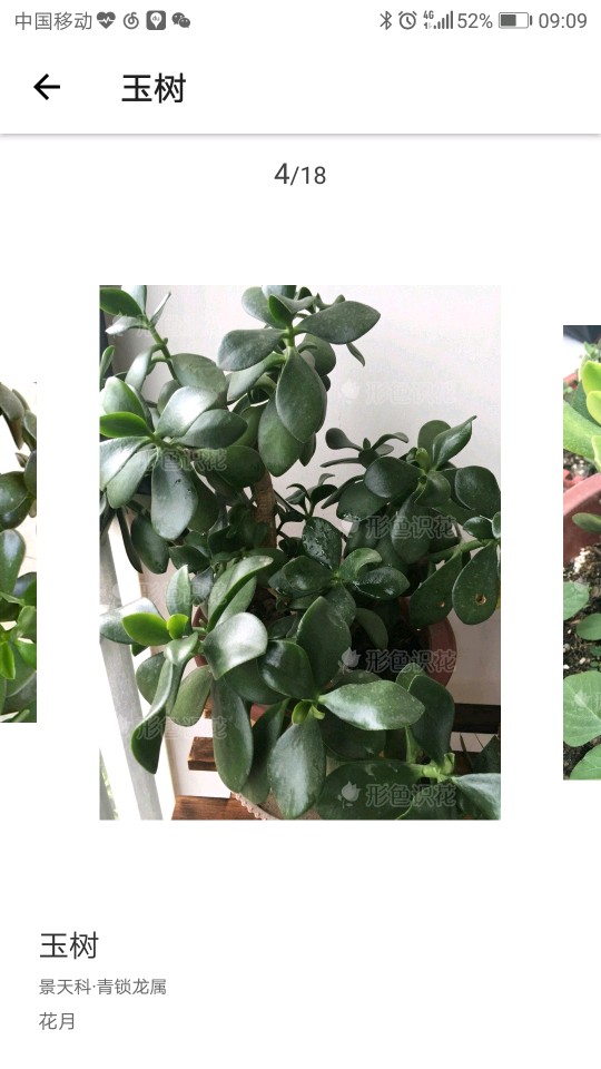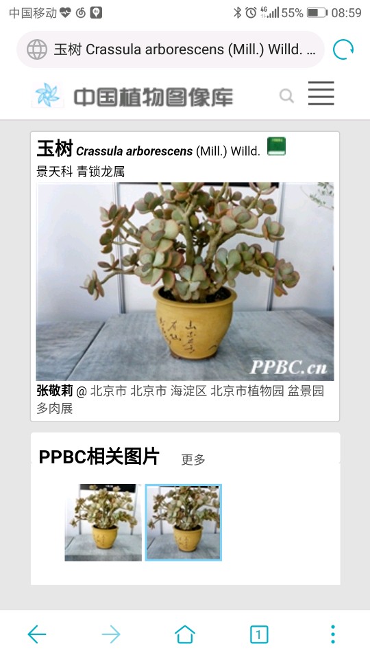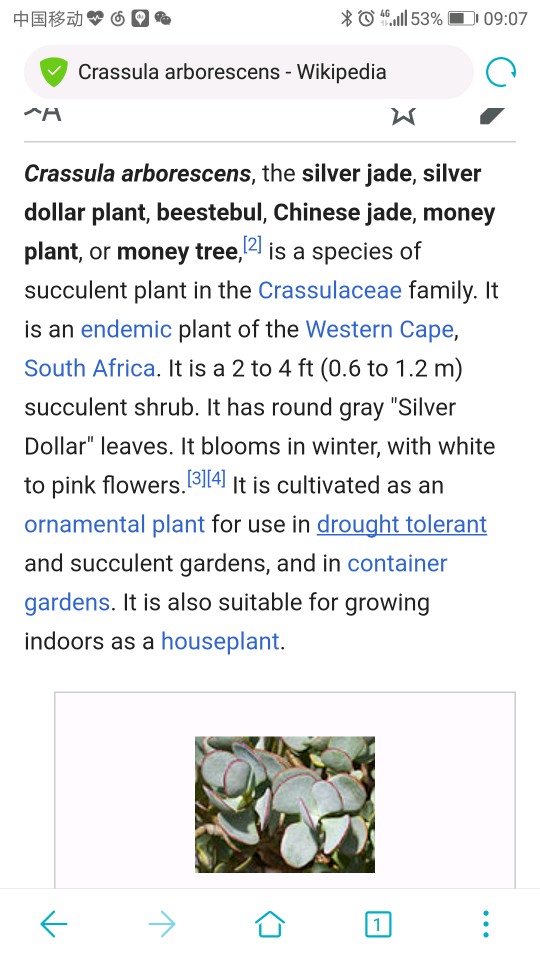 4.玉树Crassula arborescens,在维基百科中的描述是叶子银灰色,有的地方称它银元树。叶片碧绿的是燕子掌Crassula ovata。PPBC也大部分把燕子掌当成玉树,只有少量几张玉树的照片如图所示。形色的示例图片也全部是。
