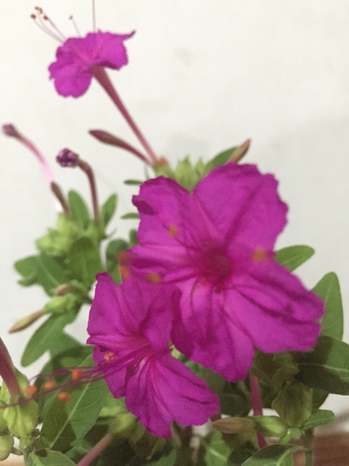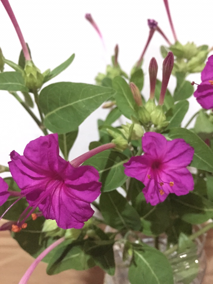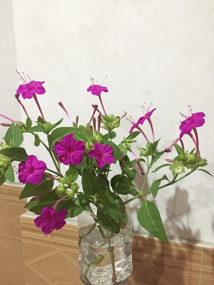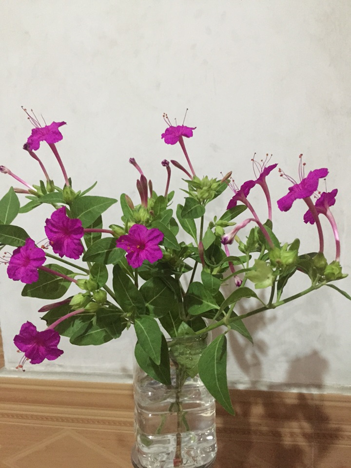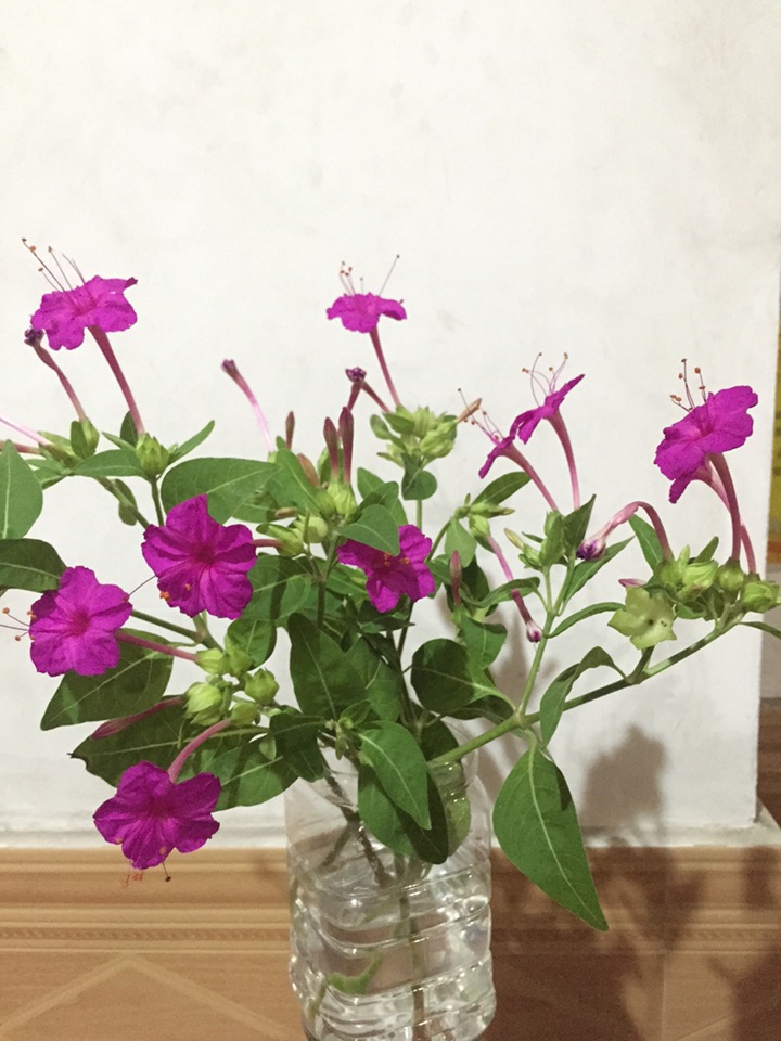 黄昏散步路旁,于荒草丛生处,闻到淡淡清香,细看之下,竟是紫茉莉,于是摘下一束,插于瓶中。
