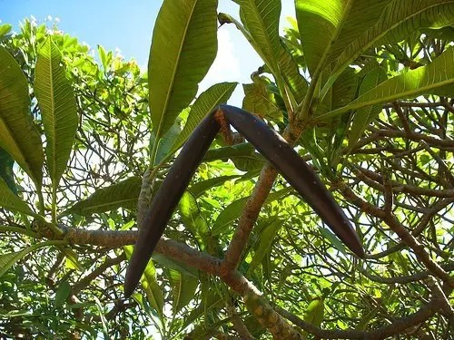 或许是因为花容过于甜美馥郁,吸引了整个南国的目光,人们的确很难在鸡蛋花凋谢之后,再匀给它过多的关注,因此,当有一天,我偶然见到鸡蛋花的果实,就是一种形状似“人”字的紫黑色果,约有10厘米长,上边密布麻点点,整个人都是兴奋得无以复加的。而且,神奇的是,鸡蛋花除了花,全株包括果实,都有毒,只有它的花,不但无毒,甚至还可以花入药。