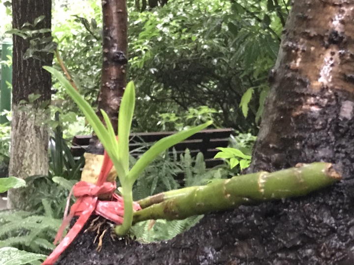 找桃胶,发现植在桃树上的石斛兰发芽了,成功!