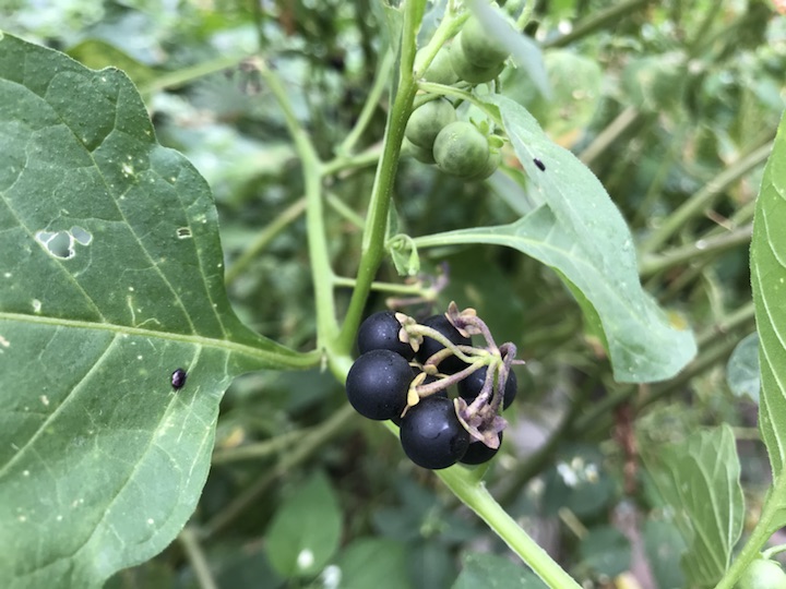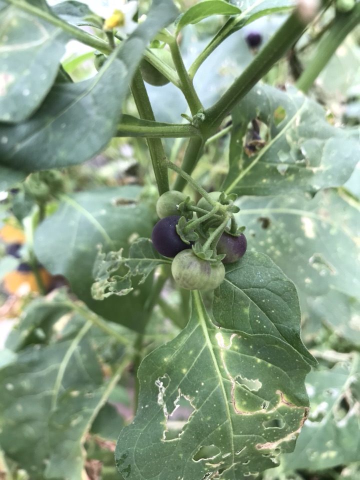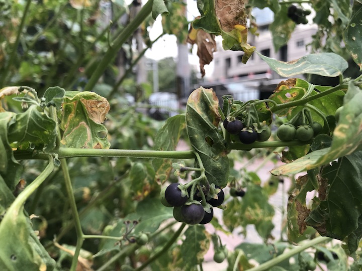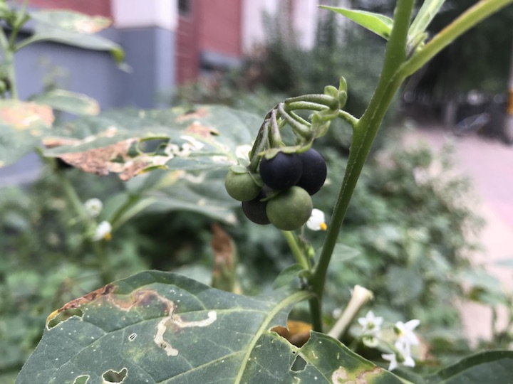 上次那一大片的龙葵拍过之后便再没有去看它,把它晾在一边那么久突然就心血来潮的想去看看它。还是那么一大片,植株却没有上次见它那般生机盎然。也有小花开着,也有零星的果子隐匿着,或青或黑都是一嘟噜一嘟噜的长。青的尚未成熟,黑的缺如小葡萄般诱人。你还别说这黑色的小浆果还真的可以吃它有个别称就叫做野葡萄,也有地方叫它山茄枣的。至于味道怎么样,我不知道,因为从不曾吃过。
