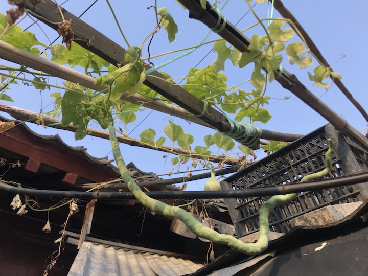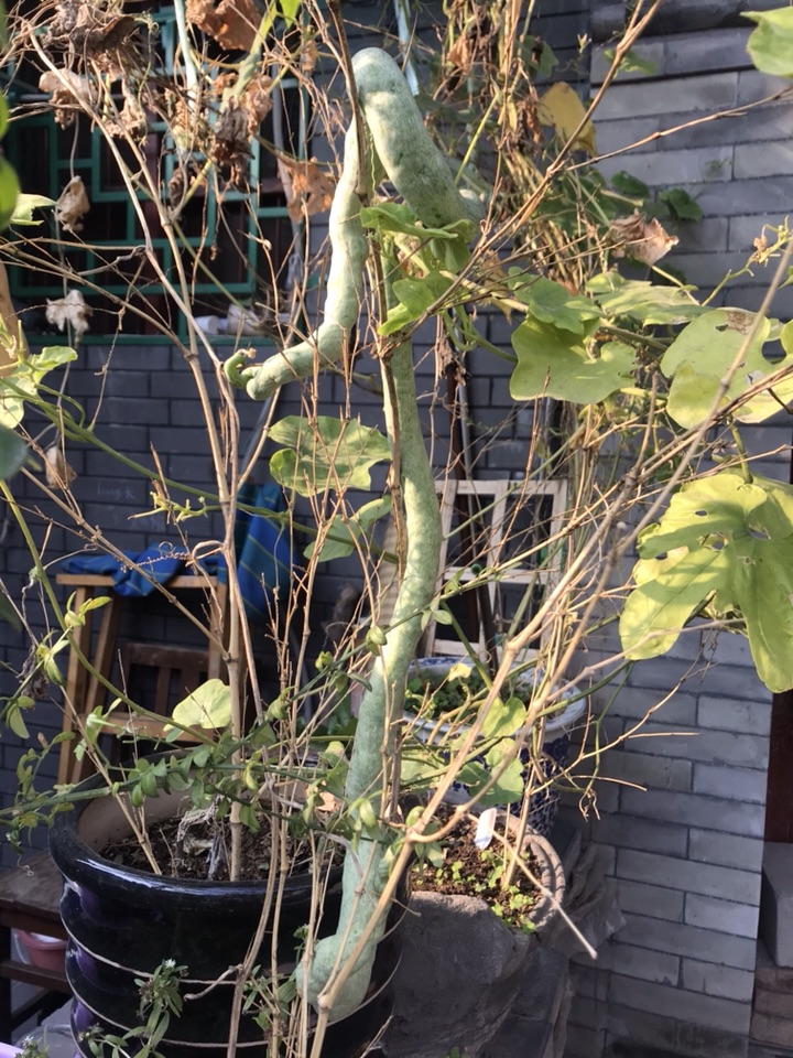 蛇瓜(拉丁学名:Trichosanthes anguina L.),一年生攀援藤本,别名蛇王瓜、蛇豆、蛇丝瓜、大豆角,原产印度。蛇瓜自瓜柄开始有数条绿色线纹,瓜体有的垂直,有的弓身,有的弯曲,有的卷尾,酷似—条条长蛇在棚架下展姿。在嫩瓜期,瓜体表面有白绿色相间的条纹似白花蛇,老熟后的瓜体表面又呈现红绿色相间的条纹似红花蛇,体态各异,栩栩如生,稀奇而美观。蛇瓜以嫩果实为蔬,但嫩叶和嫩茎也可食。嫩瓜肉质松软,有一种轻微的臭味,但是煮熟以后则变为香味,微甘甜。蛇瓜的嫩果和嫩茎叶可炒食、作汤,别具风味。