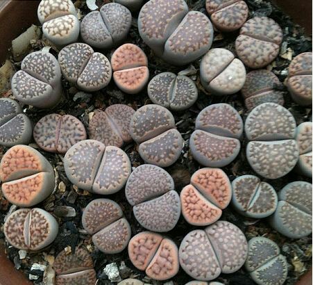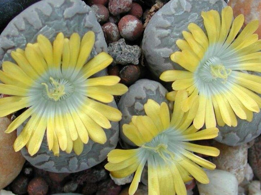 生石花属(lithops),株形小巧,高度肉质,叶形、叶色、花色都富于变化,既可爱又神秘,也别昵称为石头花,屁股花。