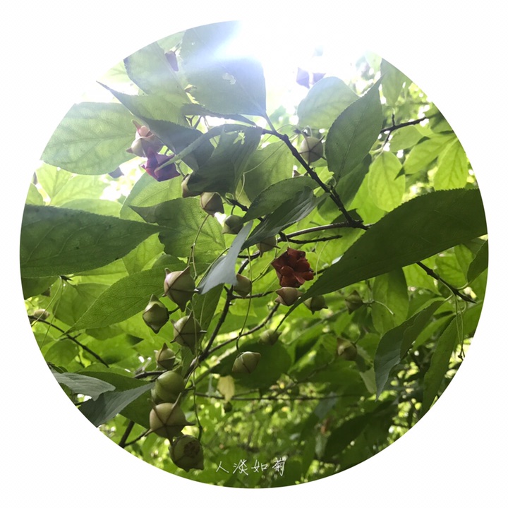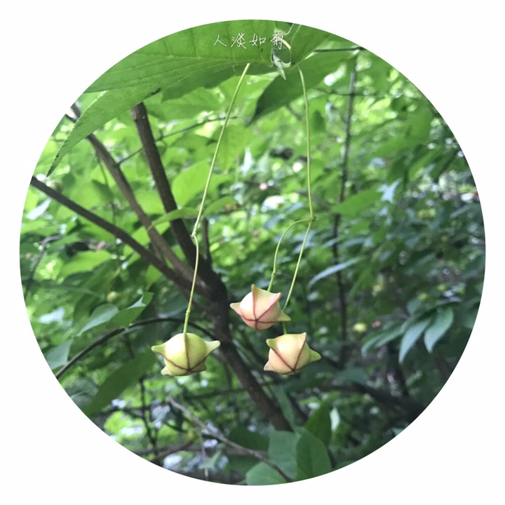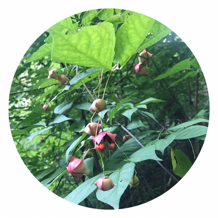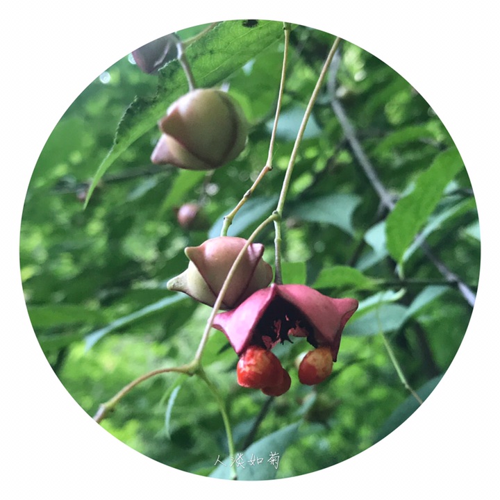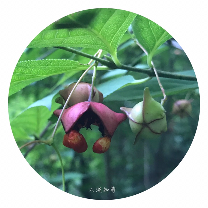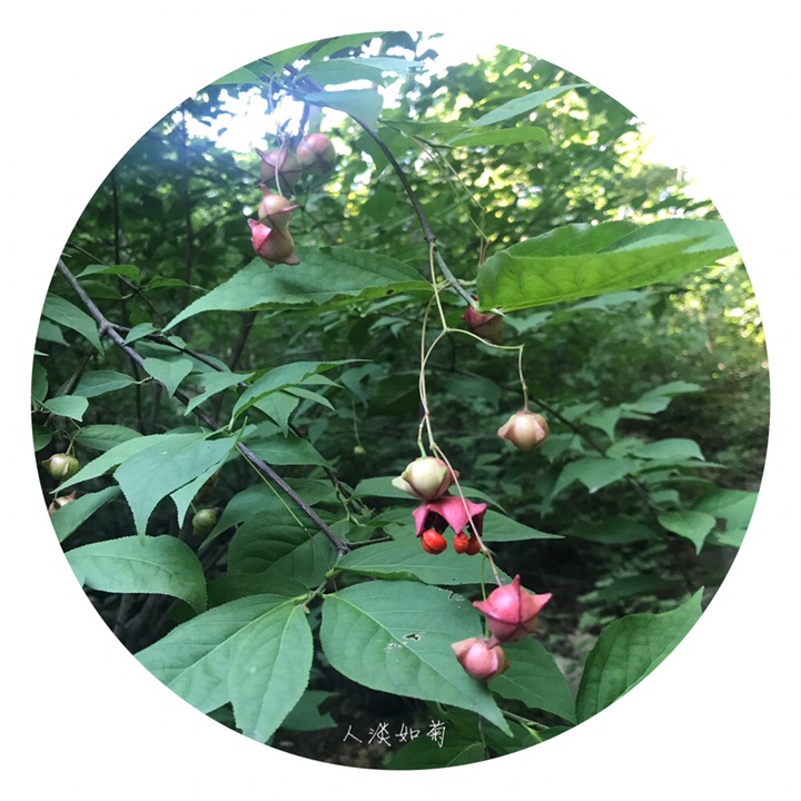 落叶灌木,高2-4m。叶对生,偶有互生;叶柄长2-10mm;叶片卵状长圆形或宽卵形,长4-9cm,宽2.5-5cm,先端渐尖,边缘具密锯齿,基部宽圆形或平截圆形。花两性,为腋生疏聚伞花序,多花,总花梗细长,长4-6cm;花径8-9mm,5数,淡绿色,花丝短;花盘圆形。蒴果近球形,直径1-1.5cm,具4-5纵棱,下垂,熟时暗红色,假种皮红色。花期4-6月,果期7-9月。