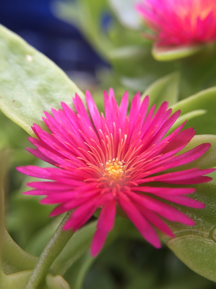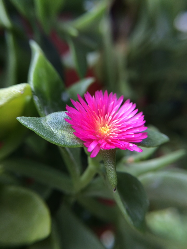 叶对生,肉质鲜嫩青翠。顶端开小花,深玫瑰红色,有光泽,花瓣细狭形拟雏菊。