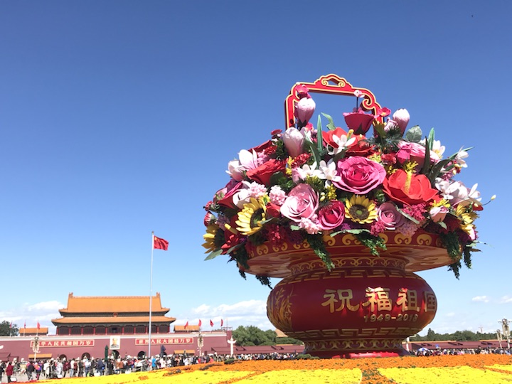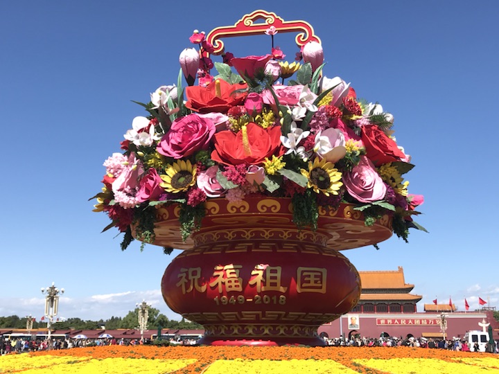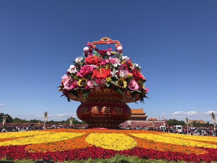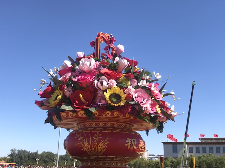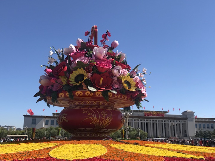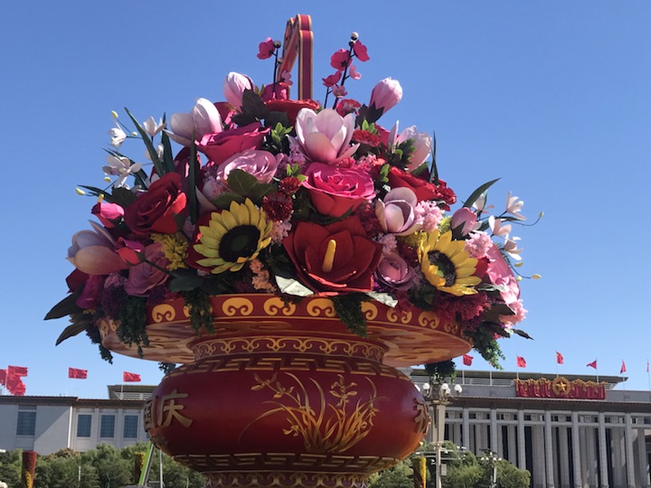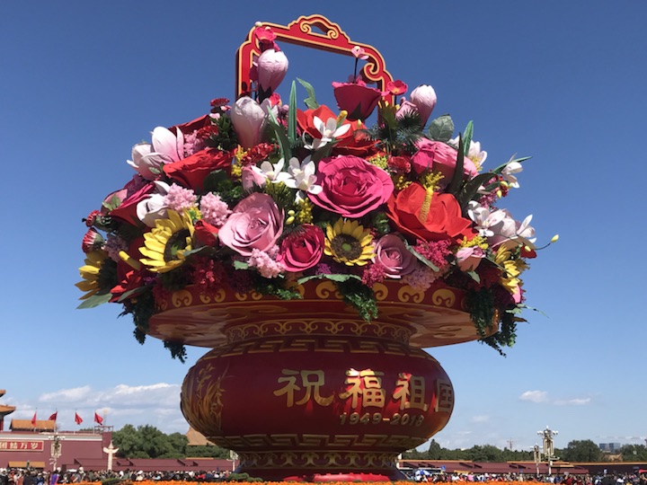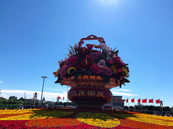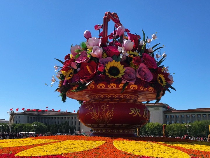天安门广场中心花坛以喜庆的花篮为主景,今年选取形如红心的红掌作为主花材,一片片红掌象征着一颗颗的红心,寓意红心向党、团结凝聚在一起;一朵朵高洁的梅花,给人以立志奋发的激励;一束束温馨的康乃馨,祝福人民幸福安康,祝愿祖国更加繁荣昌盛。篮内还组合有向日葵、兰花、月季、玉兰、叶子花等富有吉祥寓意的花卉,共同表达了全国各族人民紧密团结在以习近平同志为核心的党中央周围,万众一心,锐意进取,为实现“两个一百年”奋斗目标和中华民族伟大复兴中国梦而努力奋斗。