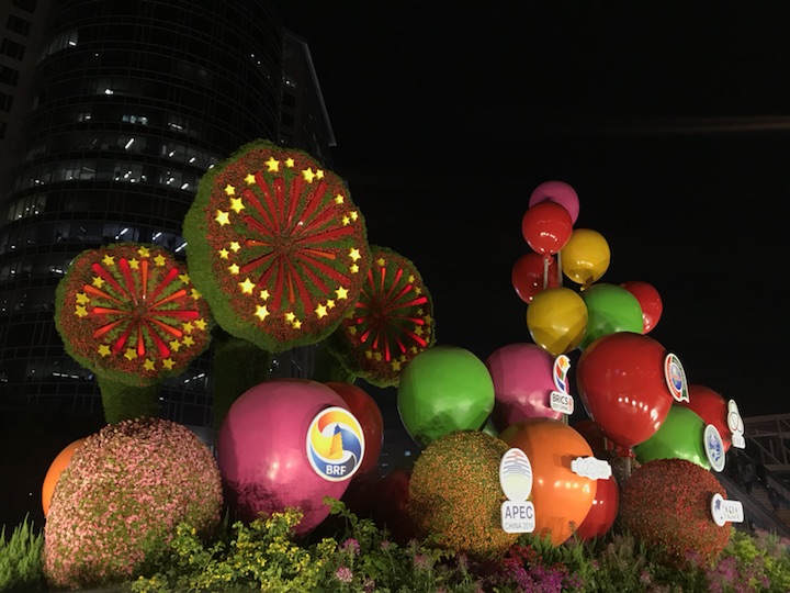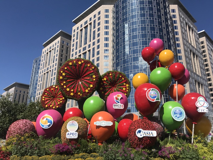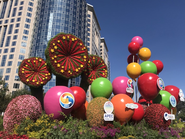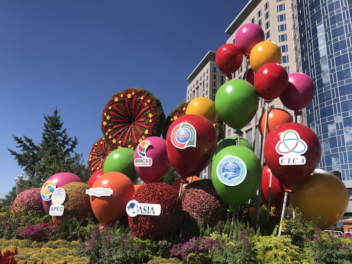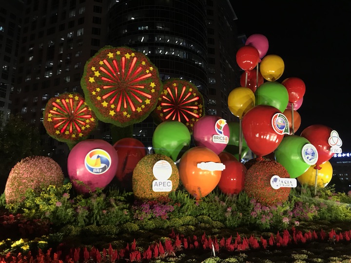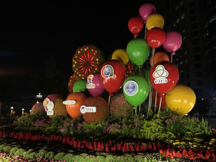 主题“开放中国”——花坛通过展示我国举办及参与的重大国际活动(“一带一路”、北京APEC会议、G20杭州峰会、金砖国家领导人厦门会晤、博鳌亚洲论坛、中非合作论坛、上合组织、亚信会议),让更多中国理念、中国方案得到世界广泛认同,寓意开放的中国日益走近世界舞台中央、不断为人类作出更大贡献。花坛顶高8米。