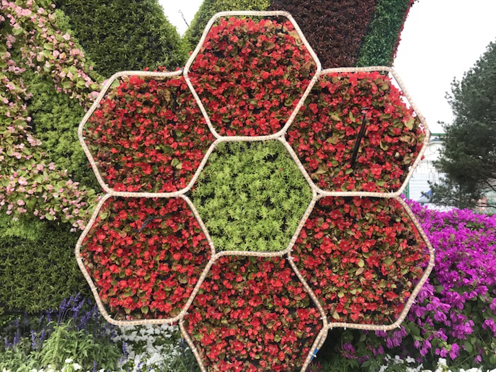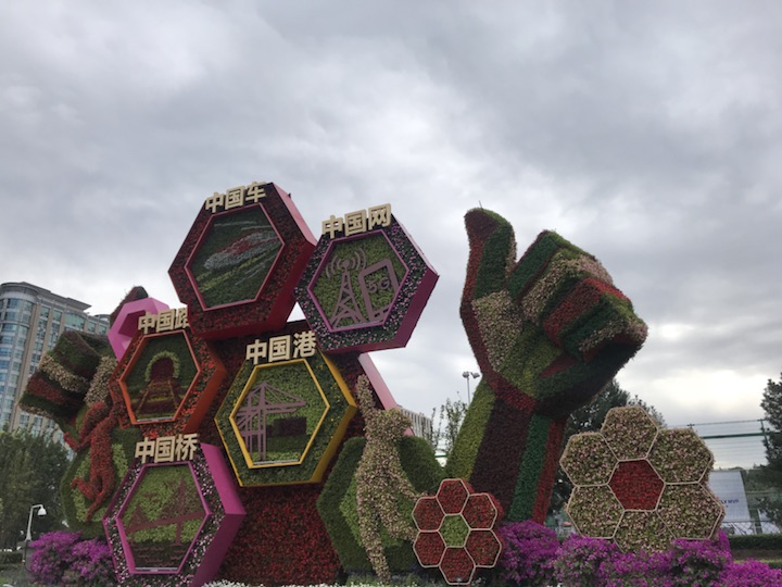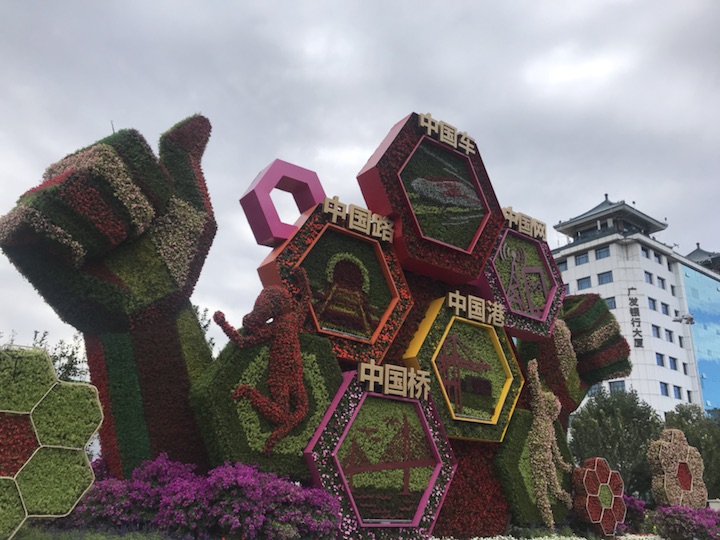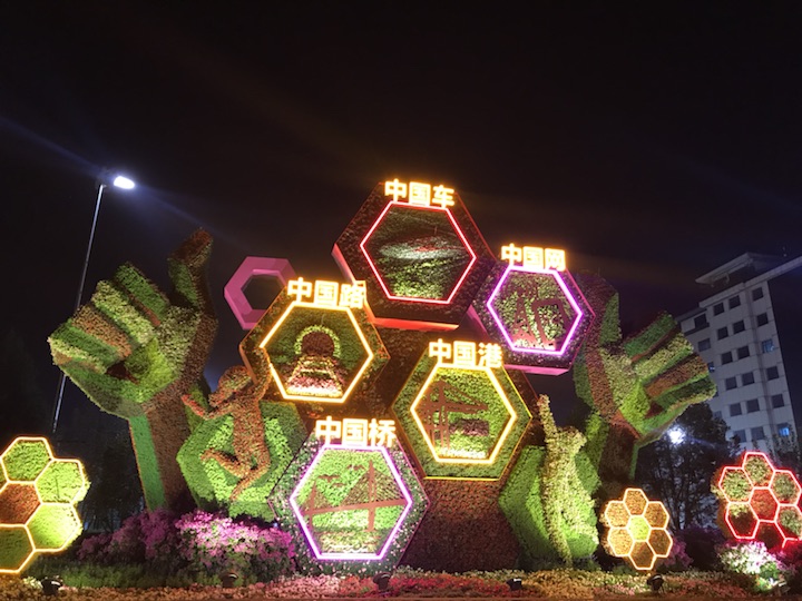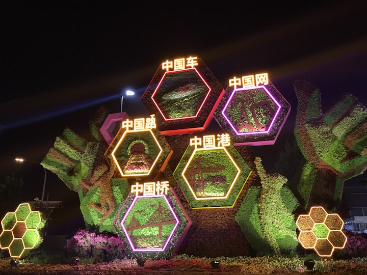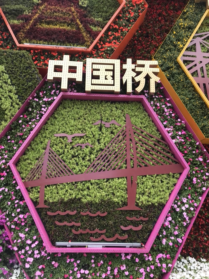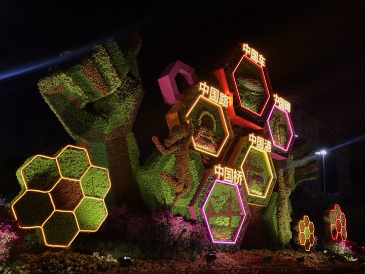 花坛通过重大工程的建设成就(中国桥、中国路、中国车、中国港、中国网),讴歌了伟大祖国从站起来、富起来到强起来的伟大飞跃,展现辉煌中国新时代新风貌。花坛顶高8米。