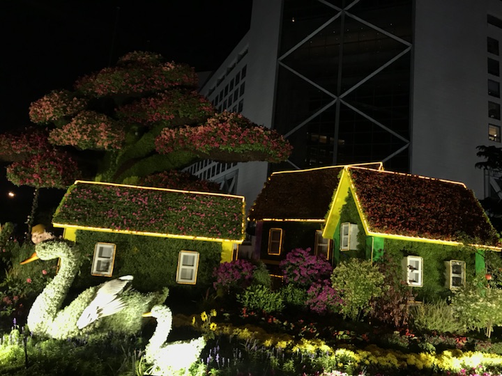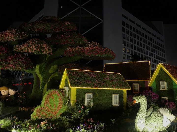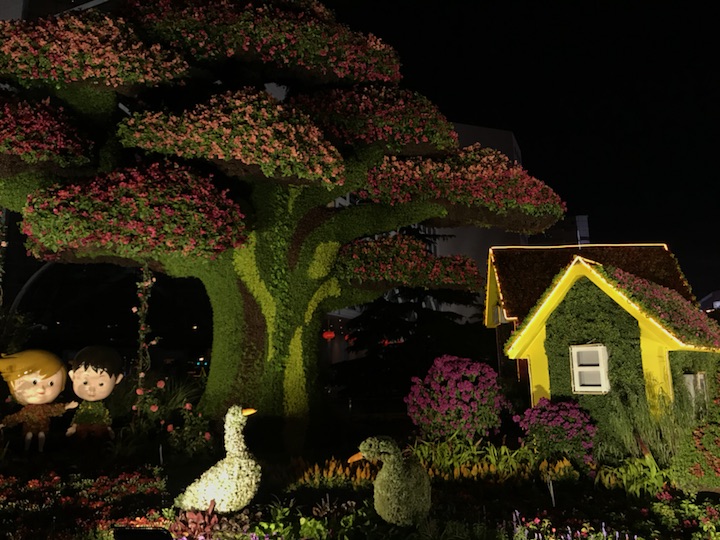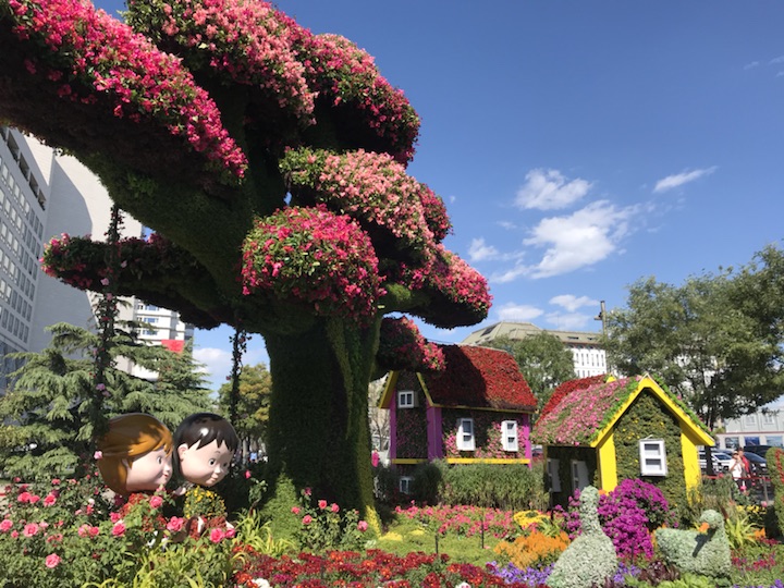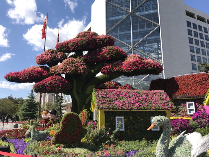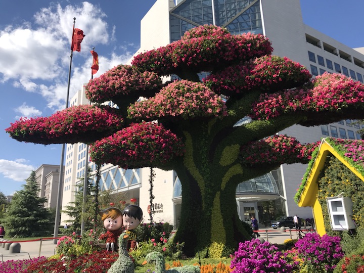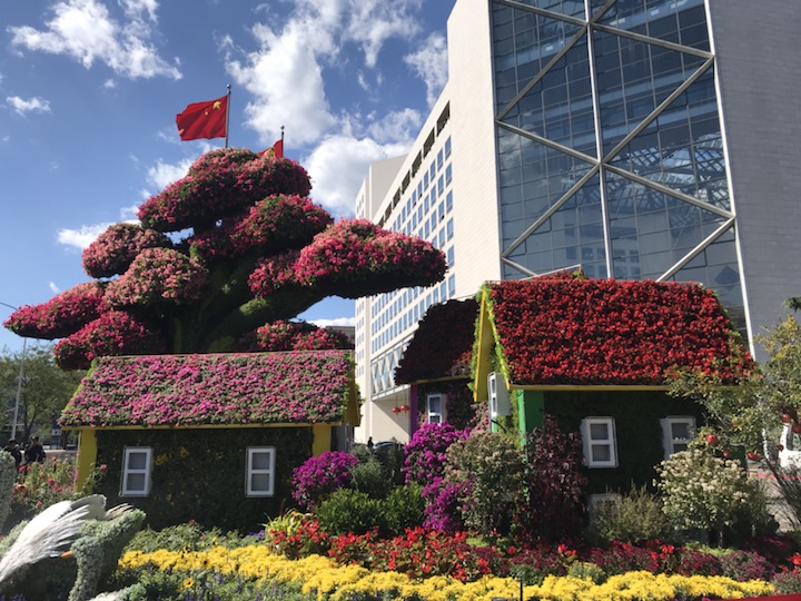 花坛以大树及乡村美景为主景,寓意通过精准扶贫,建设生态宜居的美丽乡村,走中国特色社会主义乡村振兴道路,全面建成小康社会。花坛顶高8.5米。