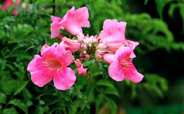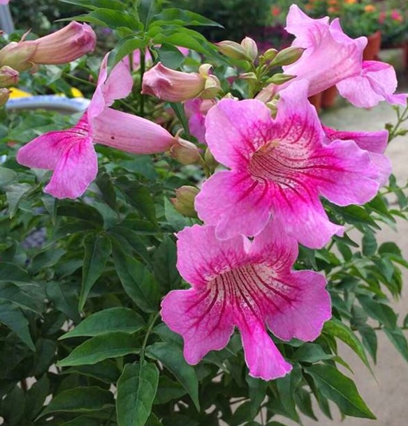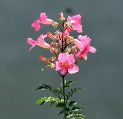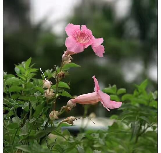 为常绿半蔓性灌木,小叶长卵形,叶7-11枚,先端尖,叶缘具锯齿,花顶生,花冠钟形,两唇形,先端五裂,色粉红色至淡紫色,有纵向紫红色条纹,为“亚运花卉”之一。