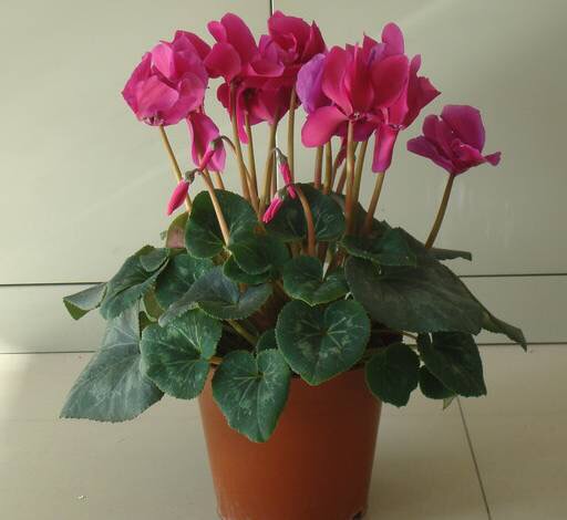 兔子花又名仙客来,属多年生草本植物,叶片由块茎顶部生出,心形、卵形或肾形,叶片有细锯齿,叶面绿色,具有白色或灰色晕斑,叶背绿色或暗红色,叶柄较长,红褐色。