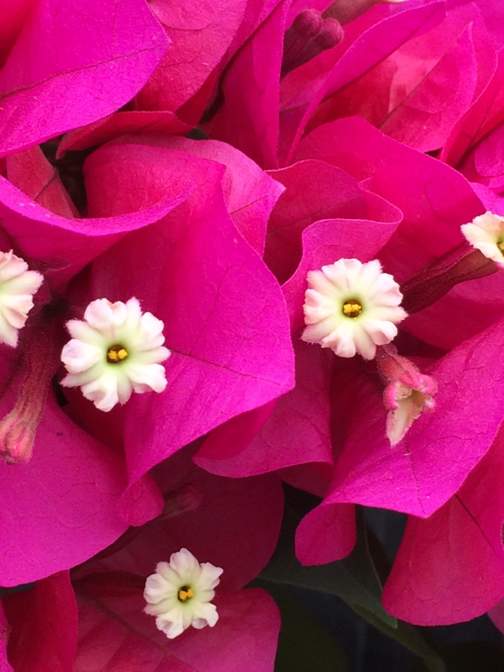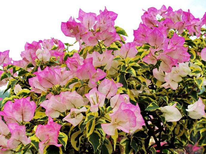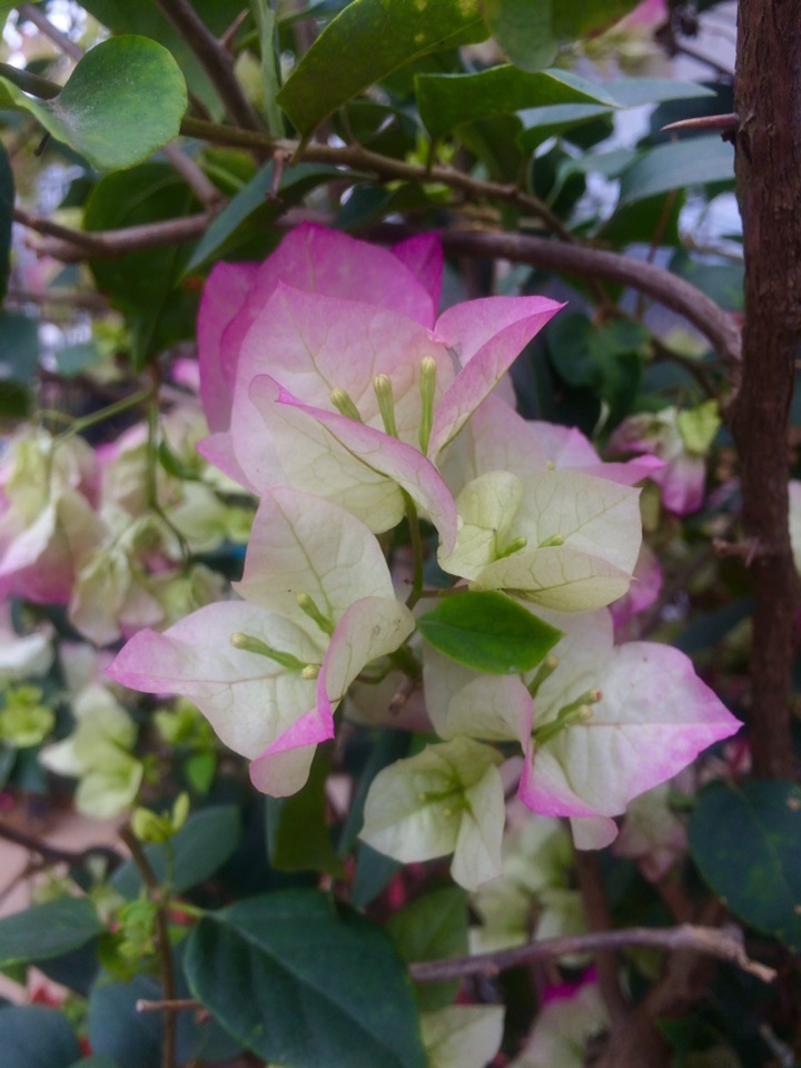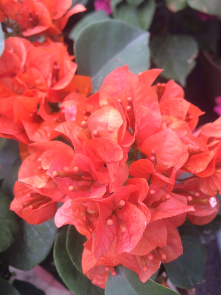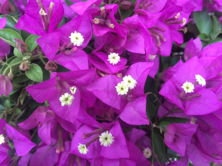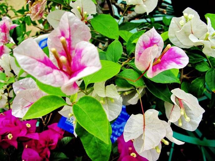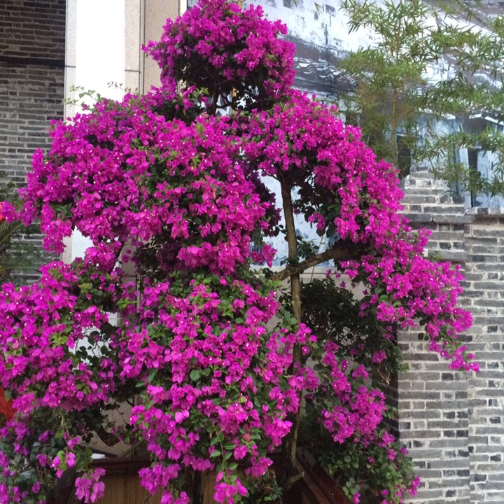紫茉莉科的叶子花,又名三角梅、簕杜鹃、毛宝巾、九重葛,花期极长,南方地区几乎全年开花。花顶生,常2-3朵簇生,我们看到的各种颜色如红、橙、黄、白、紫等色都是它的苞片,好多人都误以为花朵。
