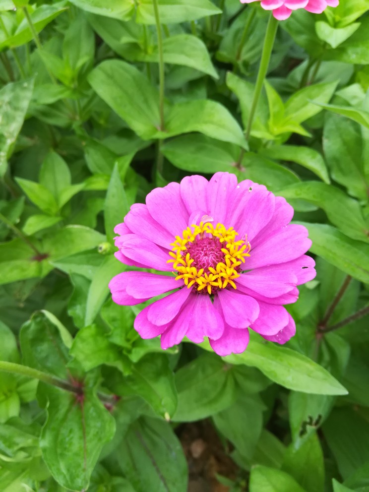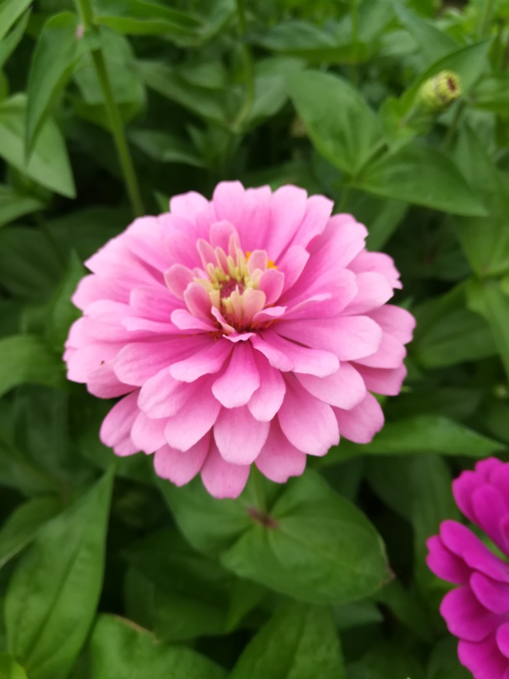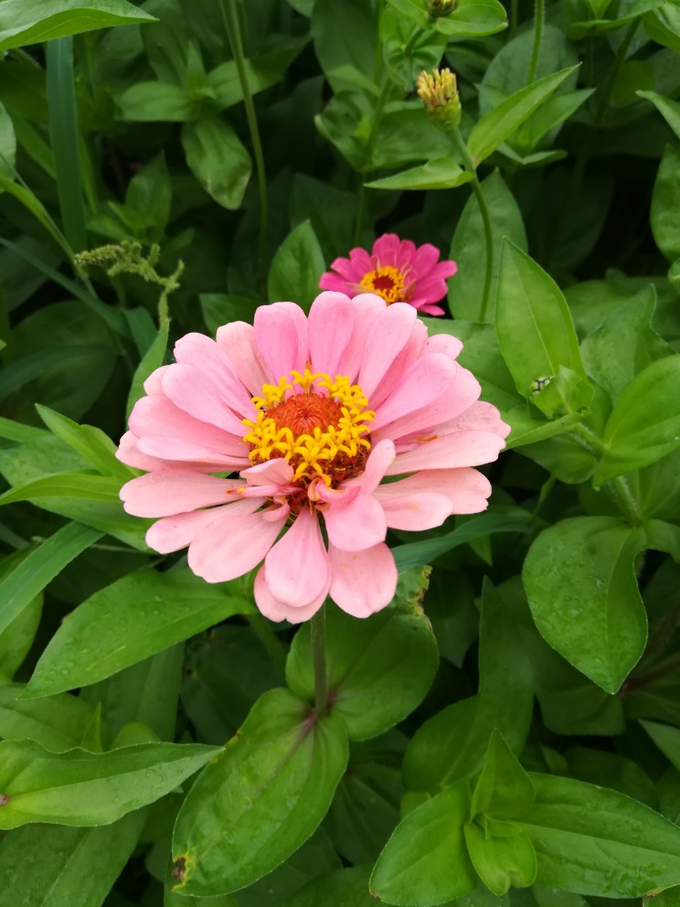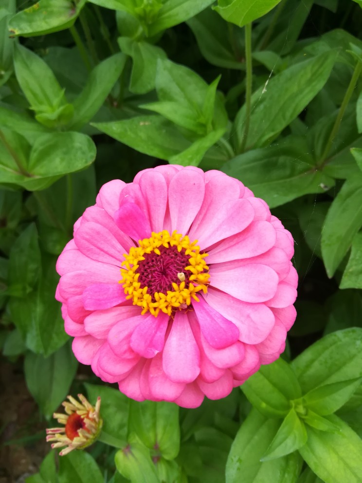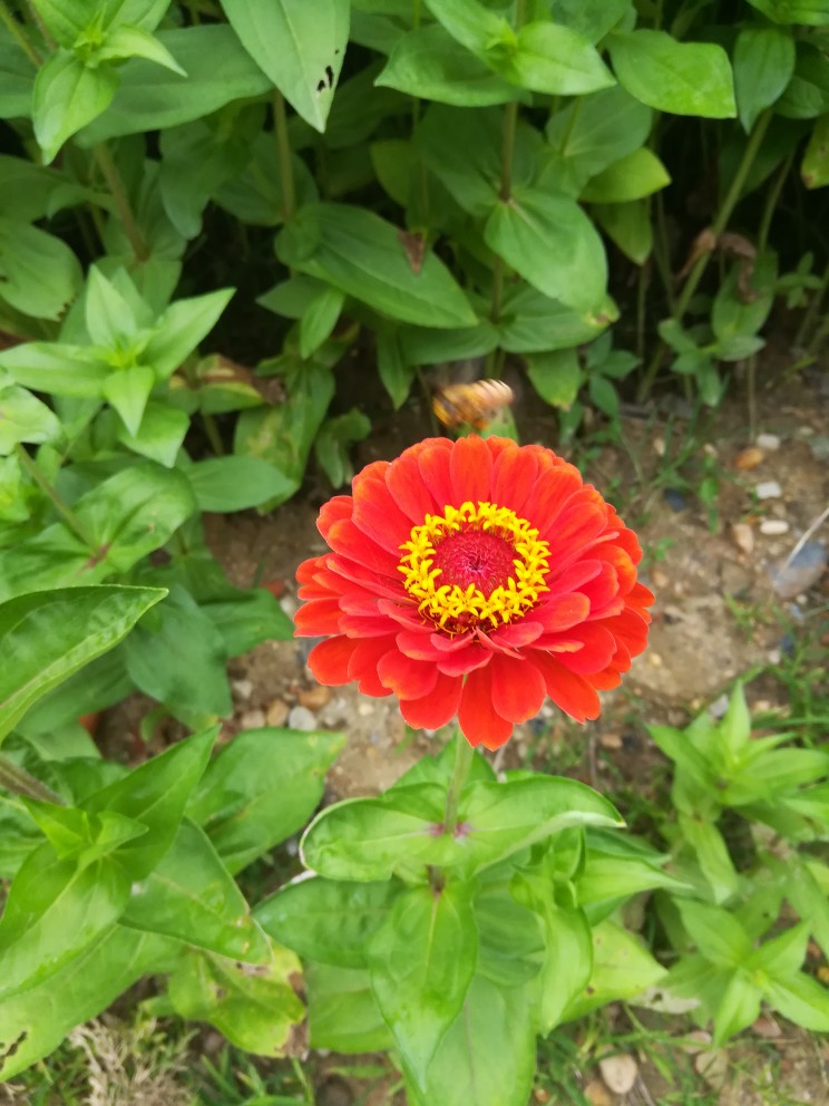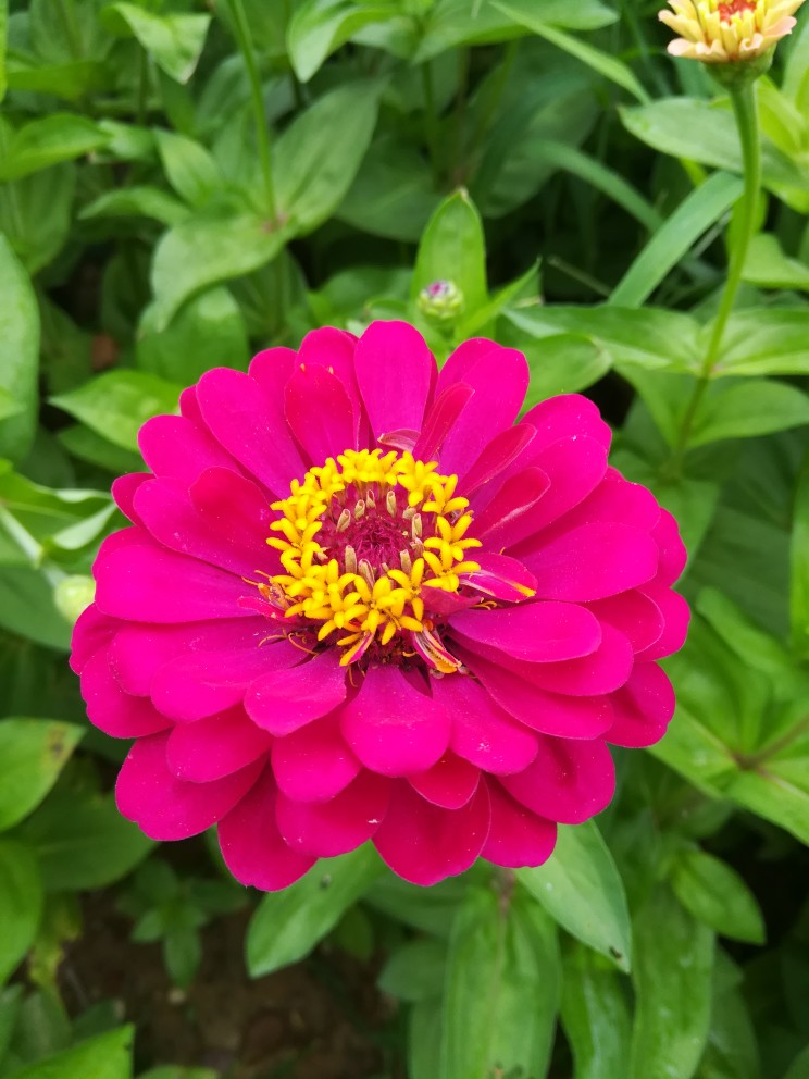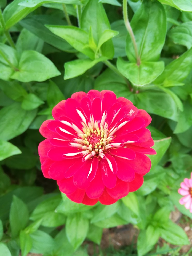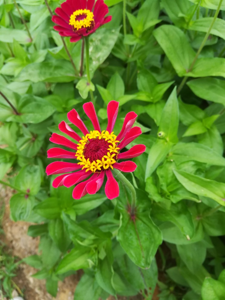 一年生草本。茎被糙毛或硬毛。叶宽卵圆形或长圆状椭圆形,长5-10厘米,基部稍心形抱茎,两面粗糙,下面密被糙毛,基脉3。头状花序径5-6.5厘米,单生枝端,花序梗不肥壮;总苞宽钟状,总苞片多层,宽卵形或卵状椭圆形,外层长约5毫米,内层长约1厘米,边缘黑色;托片附片紫红色,流苏状三角形。舌状花深红、玫瑰、紫堇或白色,舌片倒卵圆形,先端2-3齿裂或全缘,上面被短毛,下面被长柔毛;管状花黄或橙色,顶端裂片卵状披针形,上面被黄褐色密茸毛。雌花瘦果倒卵圆形,长6-7毫米,扁平,腹面正中和两侧边缘有棱,被密毛;管状花瘦果倒卵状楔形,长7-8毫米,扁,被疏毛,顶端有短齿。花期6-9月,果期7-10月。