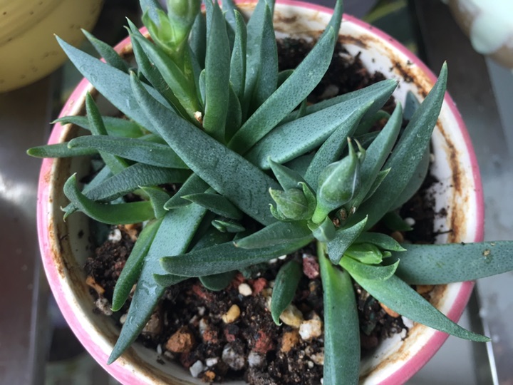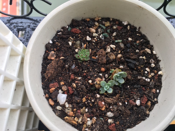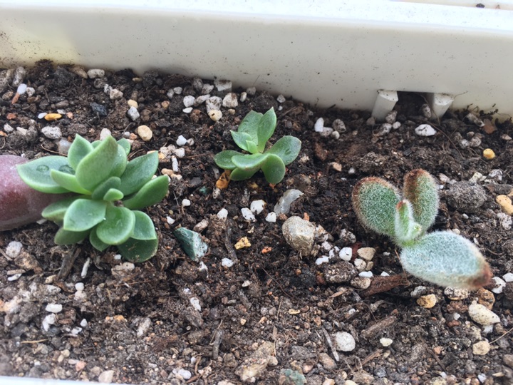 新手套餐之一。一堆人包括淘宝卖家都说是白鸟。个人觉得不是,应该是银手指吧?本人一向不怎么喜欢长得像仙人球仙人掌之类的,所以,这个也不讨我喜欢,种下去就不怎么搭理他了(看这破盆和土就知道是被嫌弃的😂)。右边两个小的是不小心掉下来的,顺手插上去也活了。
