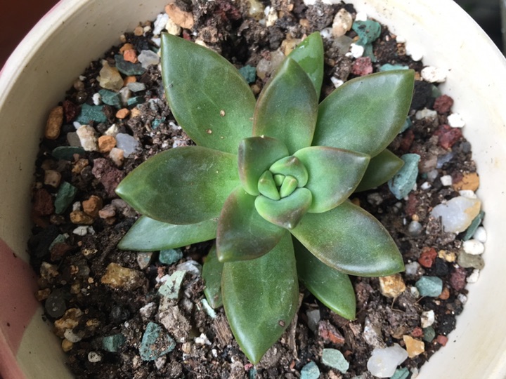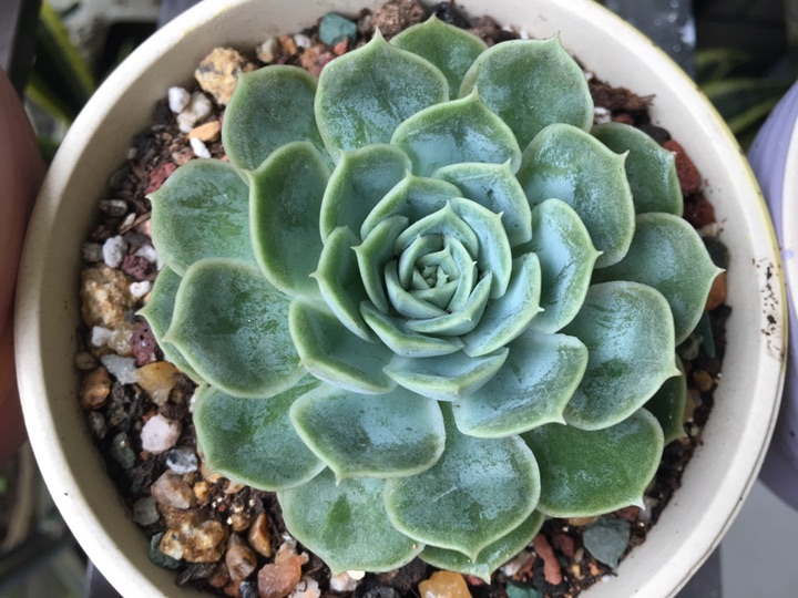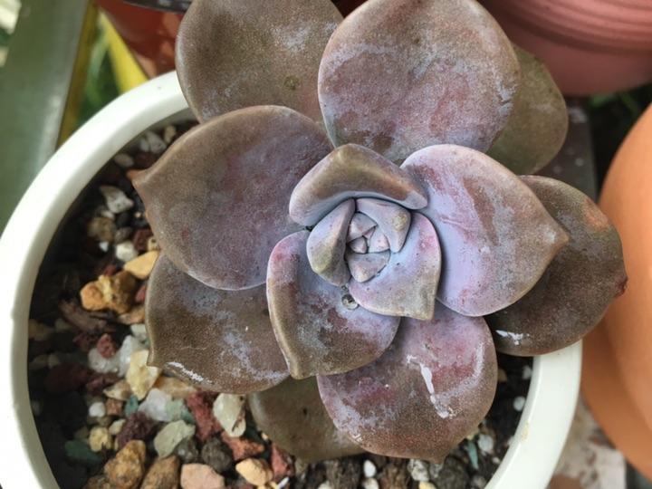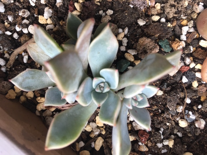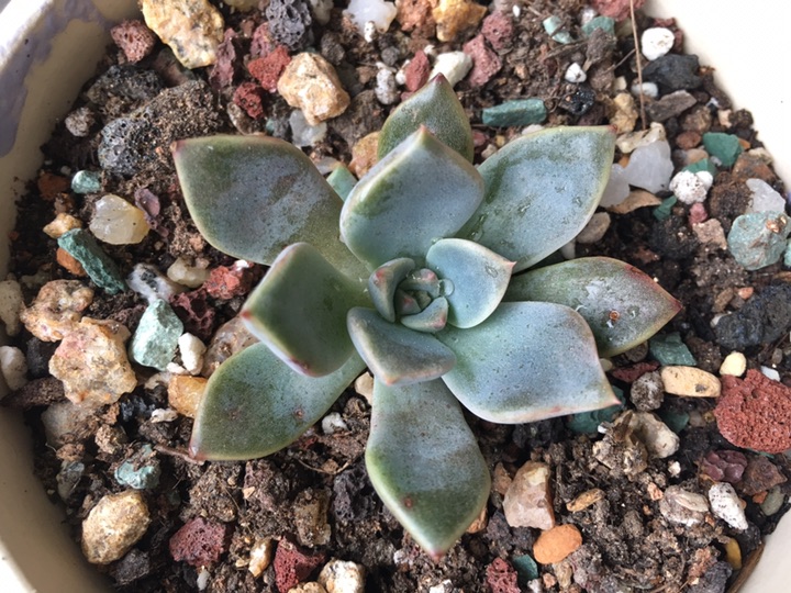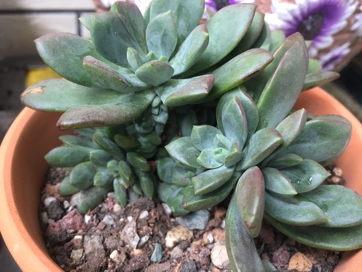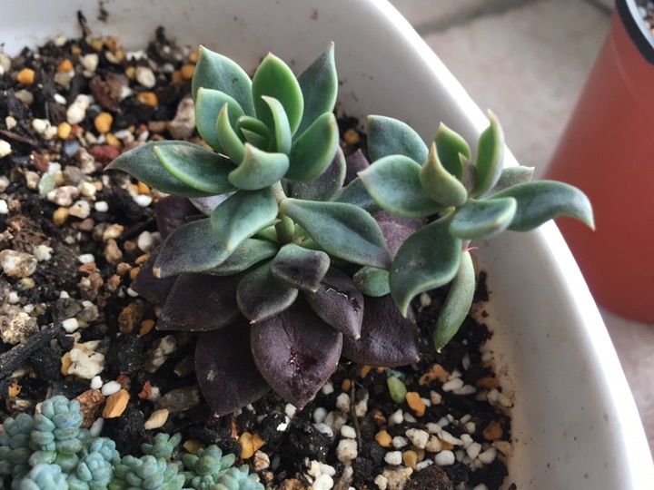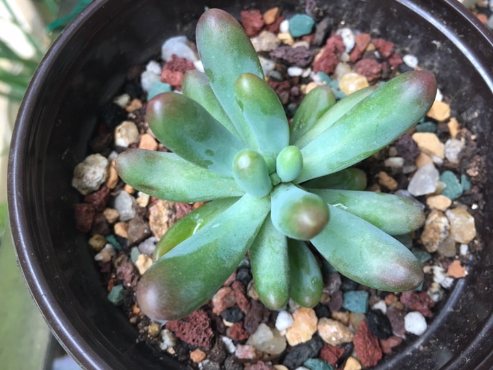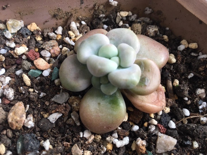 网购套餐之一。感觉长得跟什么桃蛋啊桃美人有点像(不好意思,我是肉盲)曾经叶片上长绿斑吓到,以为要死了,后来听说是艾伦的通病?最近好像长新肉了,可喜可贺。