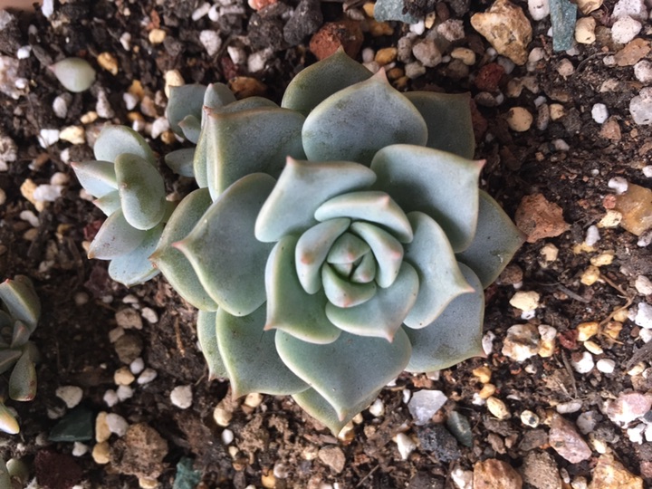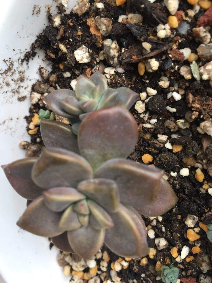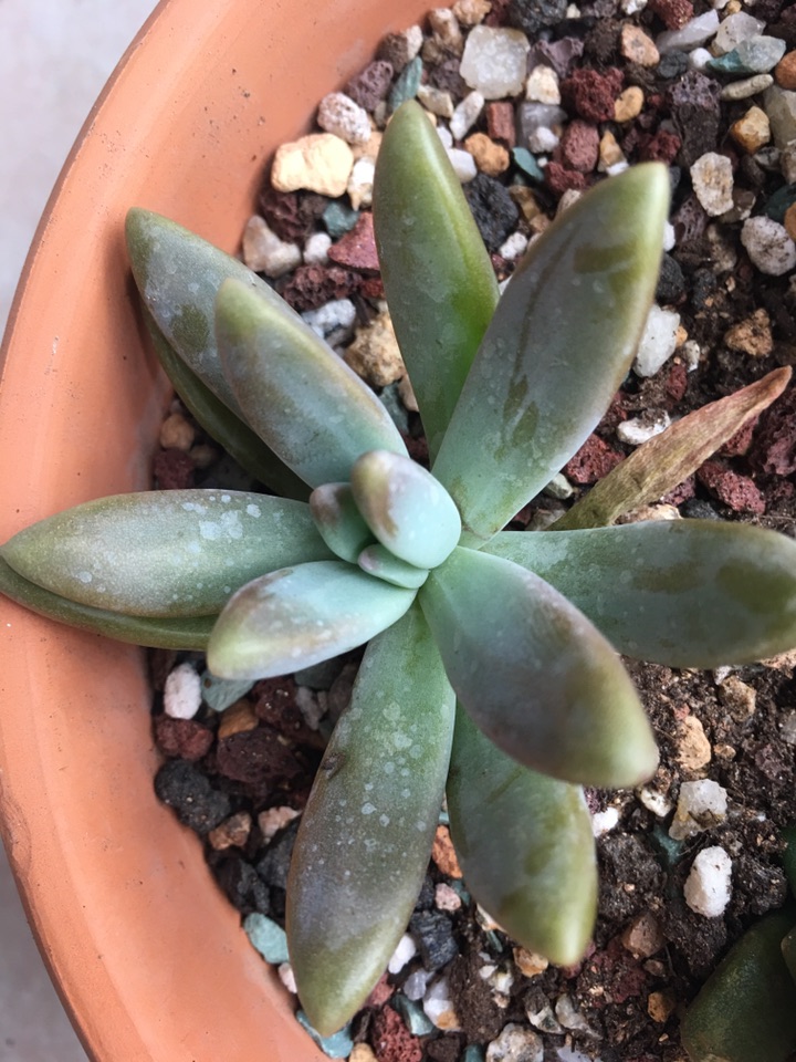没拍好,有点糊了😜新手套餐之一,感觉有点徒?长得不太讨我喜欢,所以不是很关注。 边上两个蓝绿色小不点就是姬星美人掉下来的,看看,顽强地活着呢!