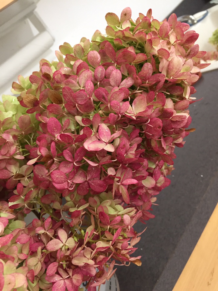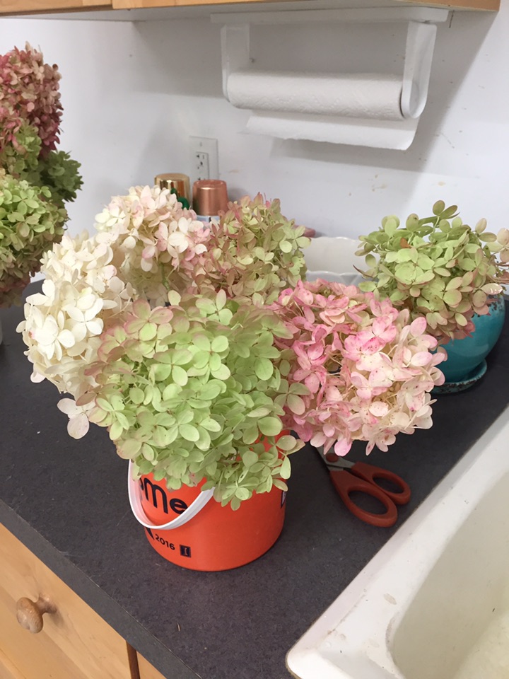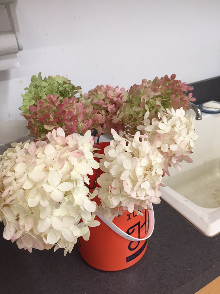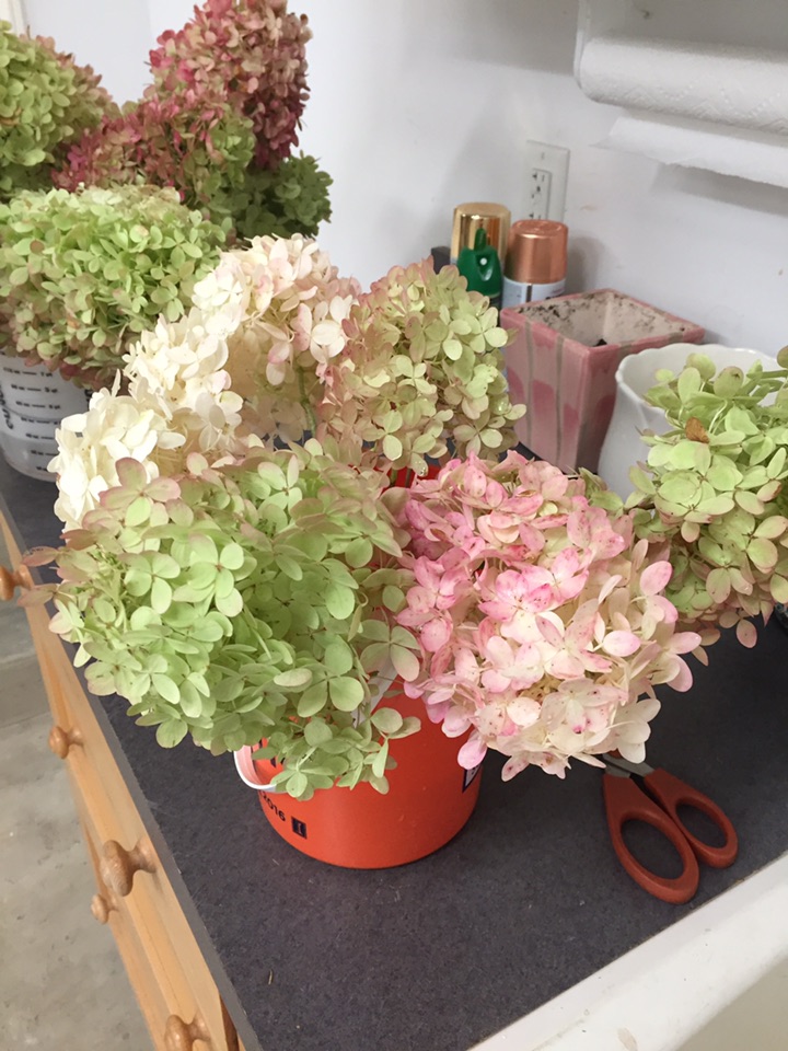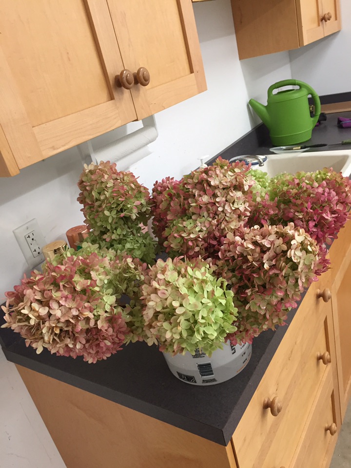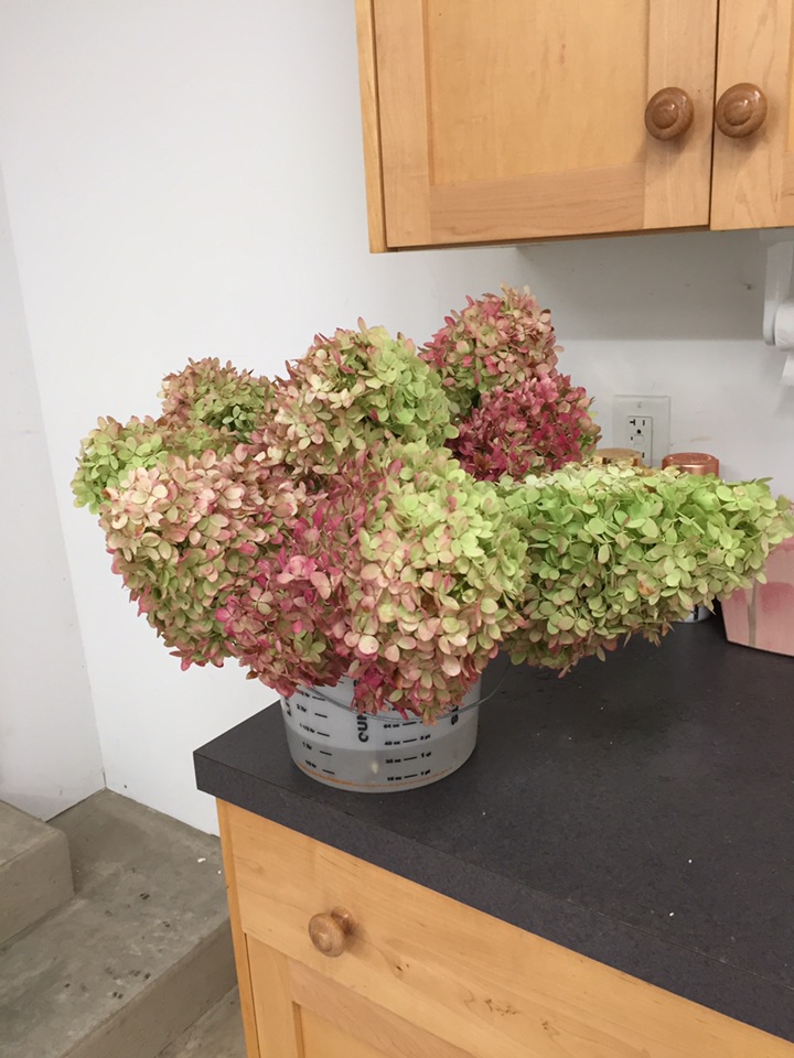 出门一趟儿回来 圆锥绣球已到了可以剪了做干花儿的时候了 - 其实还是稍稍晚了一点儿因为好多花儿瓣已经变枯了、颜色不是那么很好了 幸亏有两株而且每株上的花儿都丰收、沉甸甸的压满了枝头 所以还是可以选出满意的来
